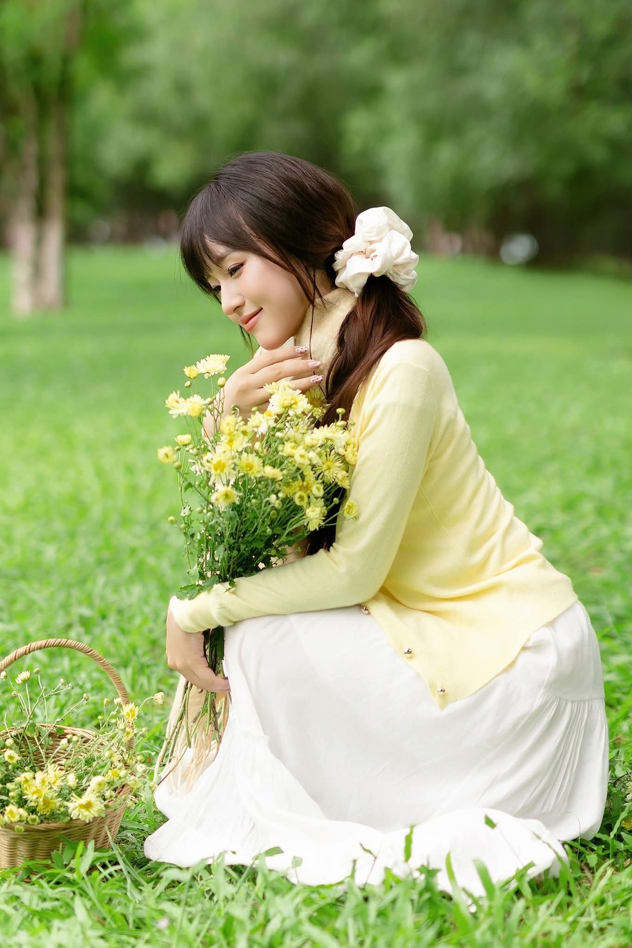 This stunning photograph captures the graceful image of a Vietnamese woman in an elegant light blue Ao Dai. Standing by a romantic riverside, the young woman exudes a gentle and refined beauty deeply rooted in tradition. The soft Ao Dai flows in the breeze, accentuating her graceful figure, symbolizing the profound cultural beauty of Vietnam. The serene backdrop of green trees and calm water further enhances the noble and gentle essence of the Vietnamese lady. This is not merely a picture but a celebration of the soul and demeanor of an East Asian woman.Pure Young Woman with Vibrant Yellow Flowers: Natural Beauty in a Lush Green Setting 1000019709