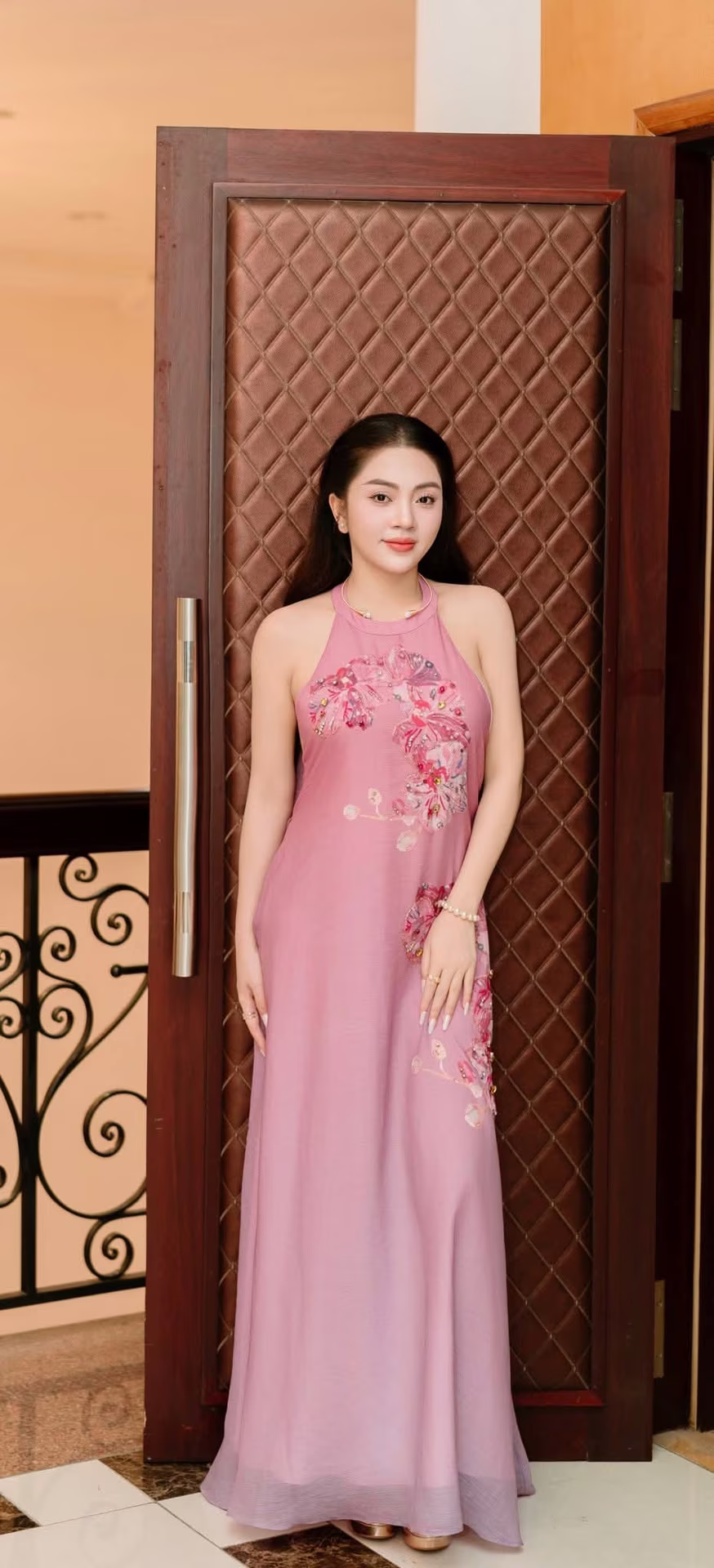 The VGU No82 image captures the graceful and elegant beauty of a modern Vietnamese woman She wears a delicate pastel pink modern Ao Dai featuring a sophisticated halter neck design The dress is adorned with intricate hand-embroidered floral patterns adding a touch of luxury and softness Her gentle smile and serene gaze exude a sense of nobility and confidence Leaning casually on an ornate staircase she perfectly embodies the harmonious blend of tradition and modernity A subtle pearl bracelet further enhances the overall refined look This attire is more than just clothing it is a symbol of elegance charm and the enduring cultural identity of Vietnam across time #Vietnamese #pretty #charmVGU No.53: Elegant beauty in a pristine white dress, posing glamorously on a luxurious black chair. Explore the sophisticated style of the modern woman.