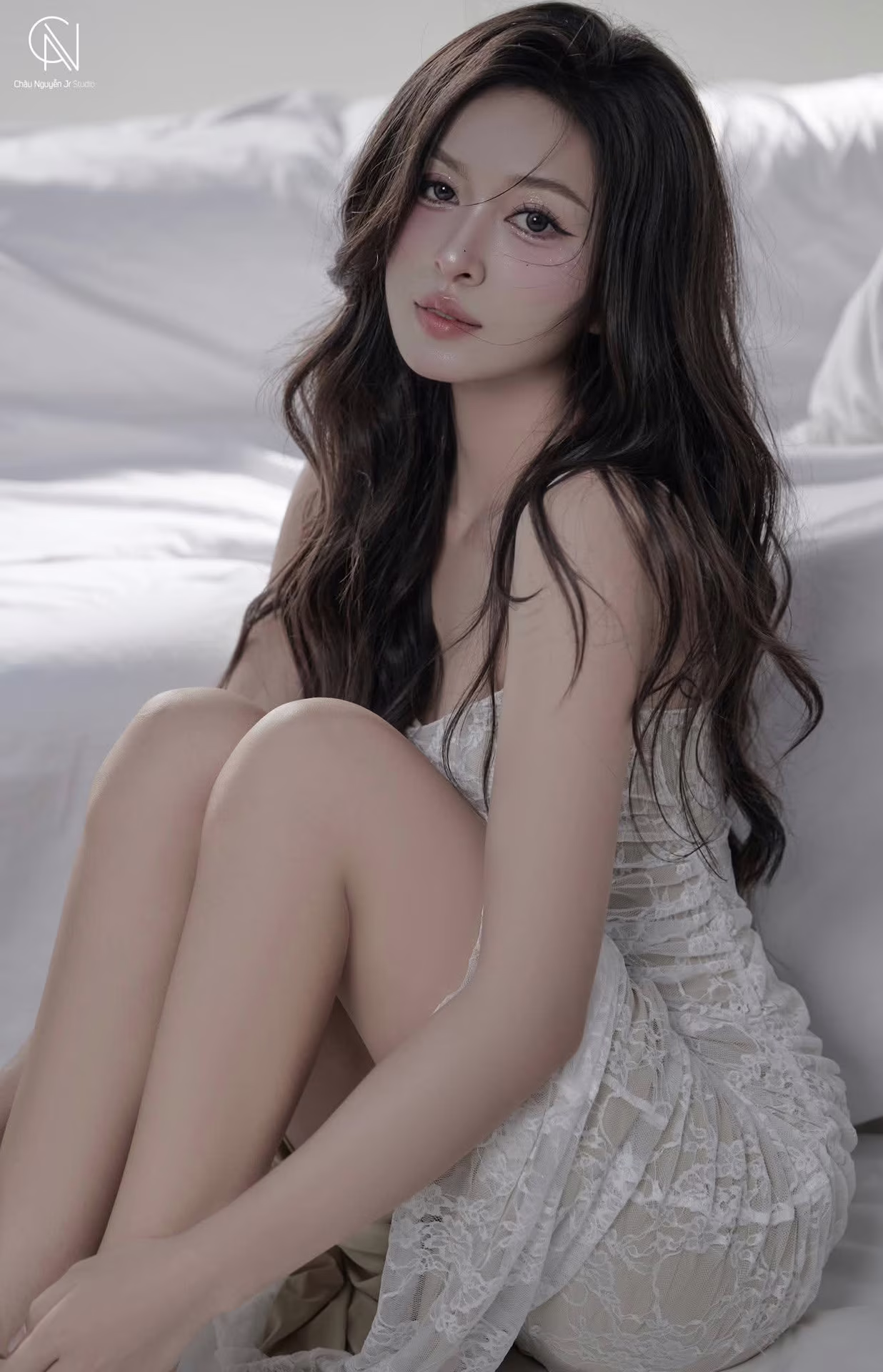 This captivating image beautifully portrays a woman exuding gentle elegance and sophisticated allure. Dressed in a pristine white gown, possibly crafted from delicate lace or flowing silk, her graceful silhouette is perfectly accentuated. Her long, dark, wavy hair cascades naturally, adding a touch of mysterious charm as she gazes subtly over her shoulder. Soft, ethereal lighting illuminates her flawless complexion and refined facial features, enhancing her serene expression. The entire setting, with its minimalist white backdrop, radiates an air of timeless luxury and refined taste, blending inner beauty with external poise. This photograph is more than just a fashion statement; it is an artistic tribute to the pure, sensual, and captivating essence of modern femininity. #Vietnamese #pretty #charmStories