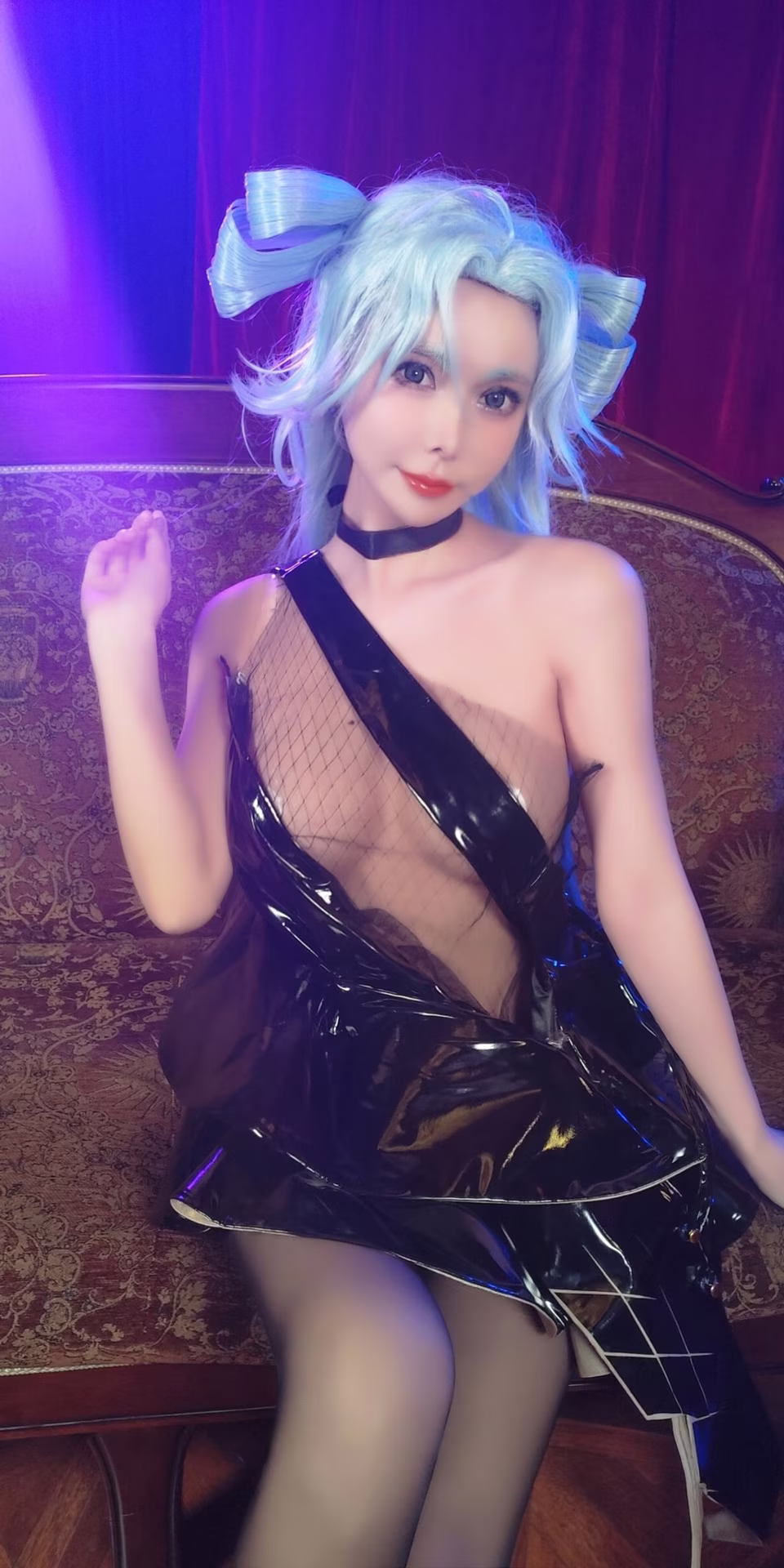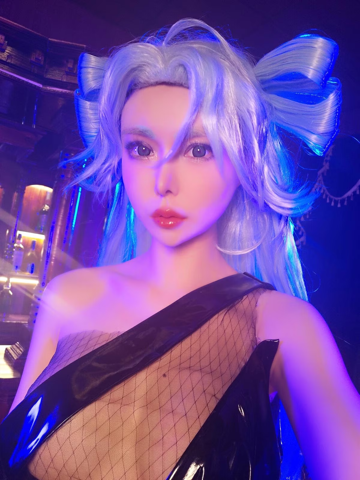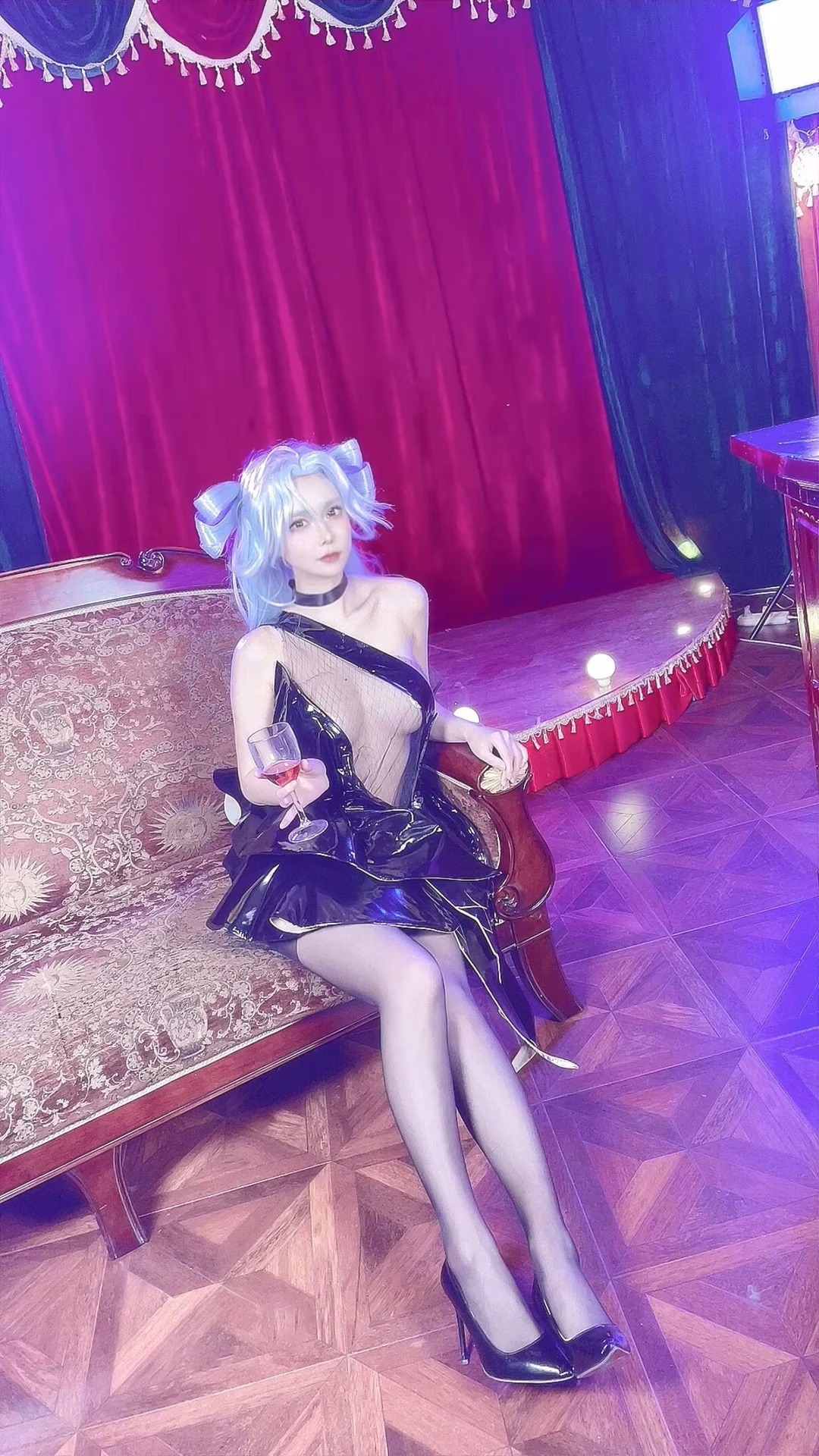 Discover Coser Ya Ma Xun Nian Yu embodying the captivating PA15 Champagne Thief. This image perfectly captures the character's mysterious and irresistible allure. With her unique light blue hair styled in playful bows and a striking shiny black vinyl-like dress featuring a daring sheer panel, Ya Ma Xun Nian Yu exudes an aura of elegance and boldness. The soft, moody lighting and the red wine glass in her hand enhance the enigmatic atmosphere, inviting viewers to delve into the intriguing narrative of PA15. She appears to beckon you into a world of luxury and temptation. This impressive cosplay showcases the meticulous detail and exceptional expressive talent of the Coser.VGU No.11: Elegant Charm: A Woman's Grace in White Gown and Delicate Rose Bouquet