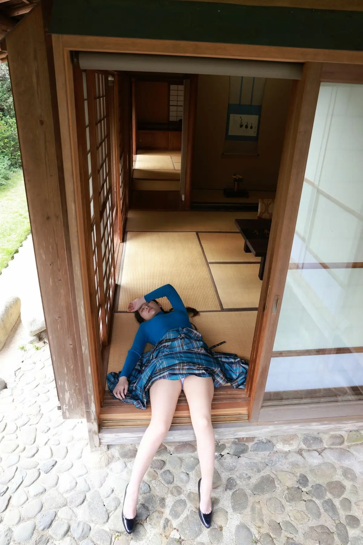 In the FRIDAY Digital Photo Book Scarlet Vol.2, model Miho Machiyama 街山みほ presents a captivating and authentic portrayal. This image captures her in a relaxed pose on a traditional Japanese wooden floor, bathed in soft natural light filtering through the doorway. Miho's attire, featuring a striking blue top and an elegant patterned skirt, paired with high heels, creates a unique blend of modern style and the classic beauty of Japanese architecture. Every detail within the frame exudes grace, inviting viewers to delve deeper into the narrative and emotions she conveys in this special collection. This is an unmissable visual experience for enthusiasts of Japanese aesthetics.#MihoMachiyama #Japanese #Beauty #Scarlet #Traditional
