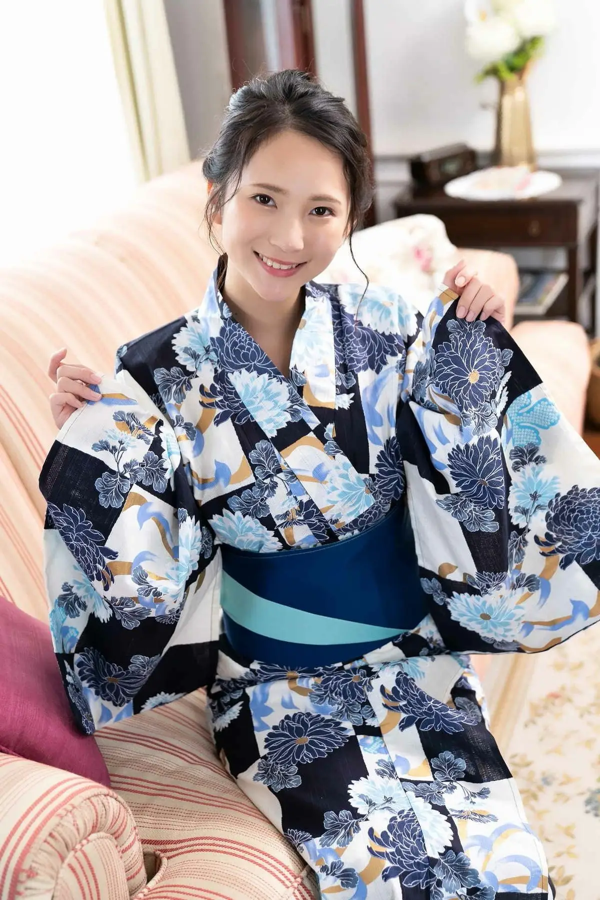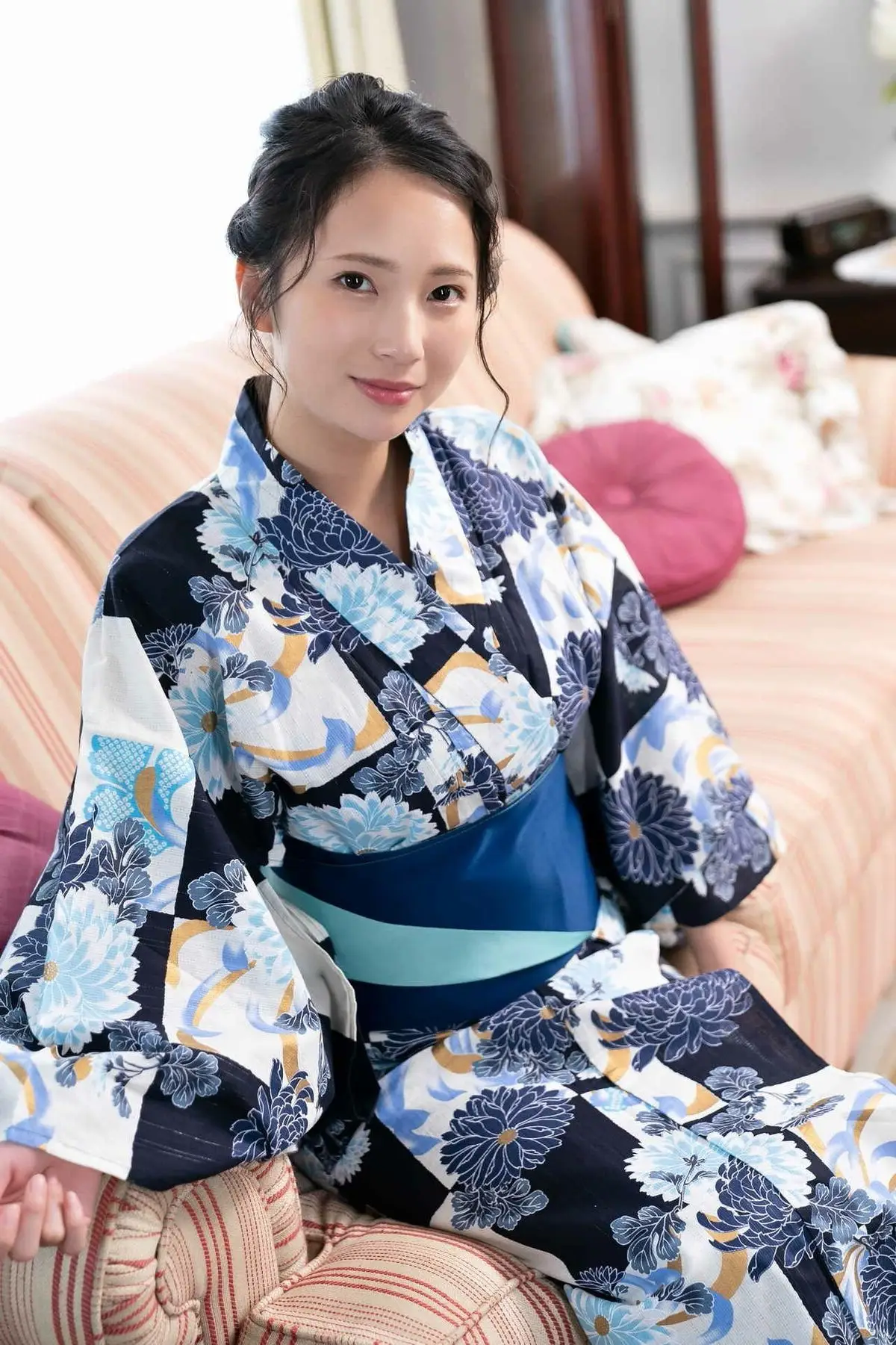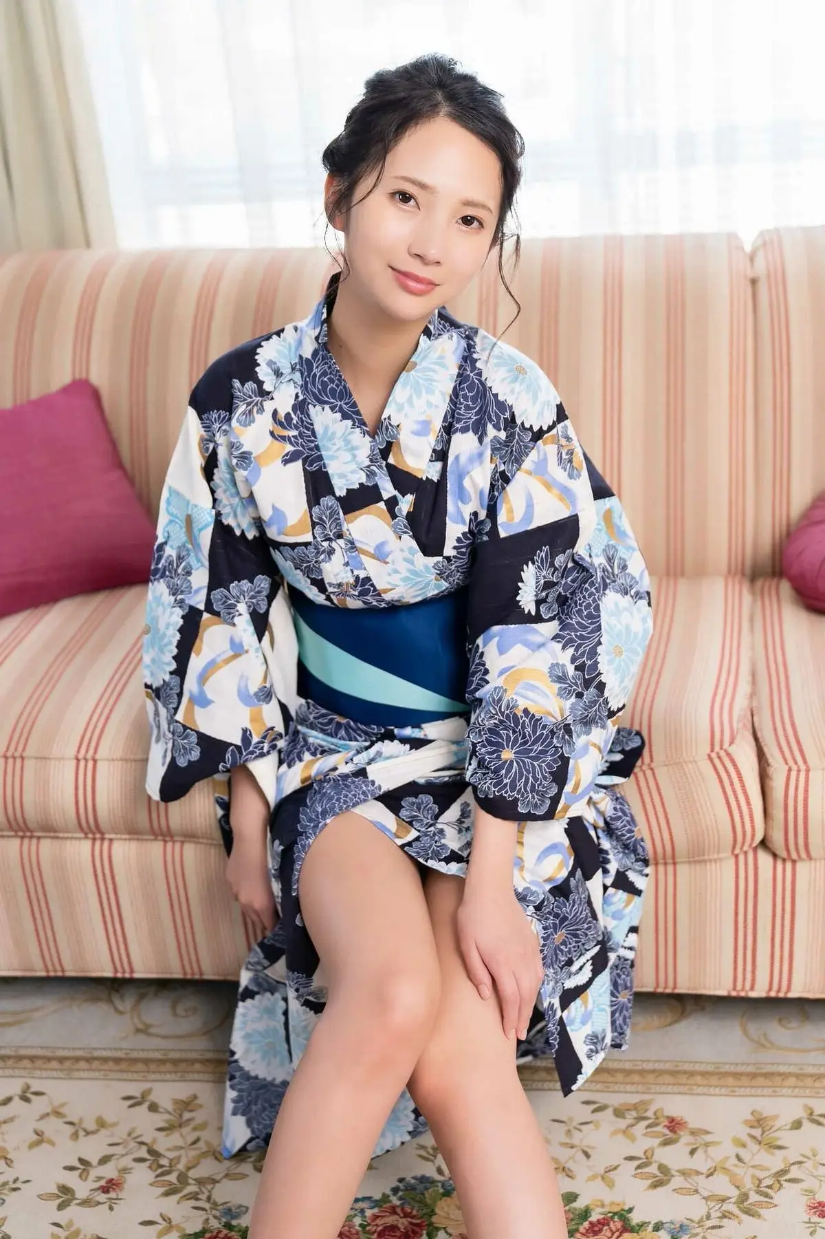 In this captivating photo Miho Machiyama 街山みほ shines with natural beauty and allure She is elegantly posed in a kimono-inspired outfit featuring exquisite blue floral patterns gently reclining on a striped sofa Miho's direct gaze conveys both confidence and a hint of shyness creating an irresistible charm Every feature of her face is softly illuminated highlighting her smooth skin and dark hair This image not only captures her physical beauty but also radiates the serene and graceful essence of a Japanese idol It is part of the Kagayaku Konpeki no Idolpost Part02 series promising more memorable moments#MihoMachiyama #JapaneseIdol #KimonoFashion #AsianBeauty #ElegantPortrait