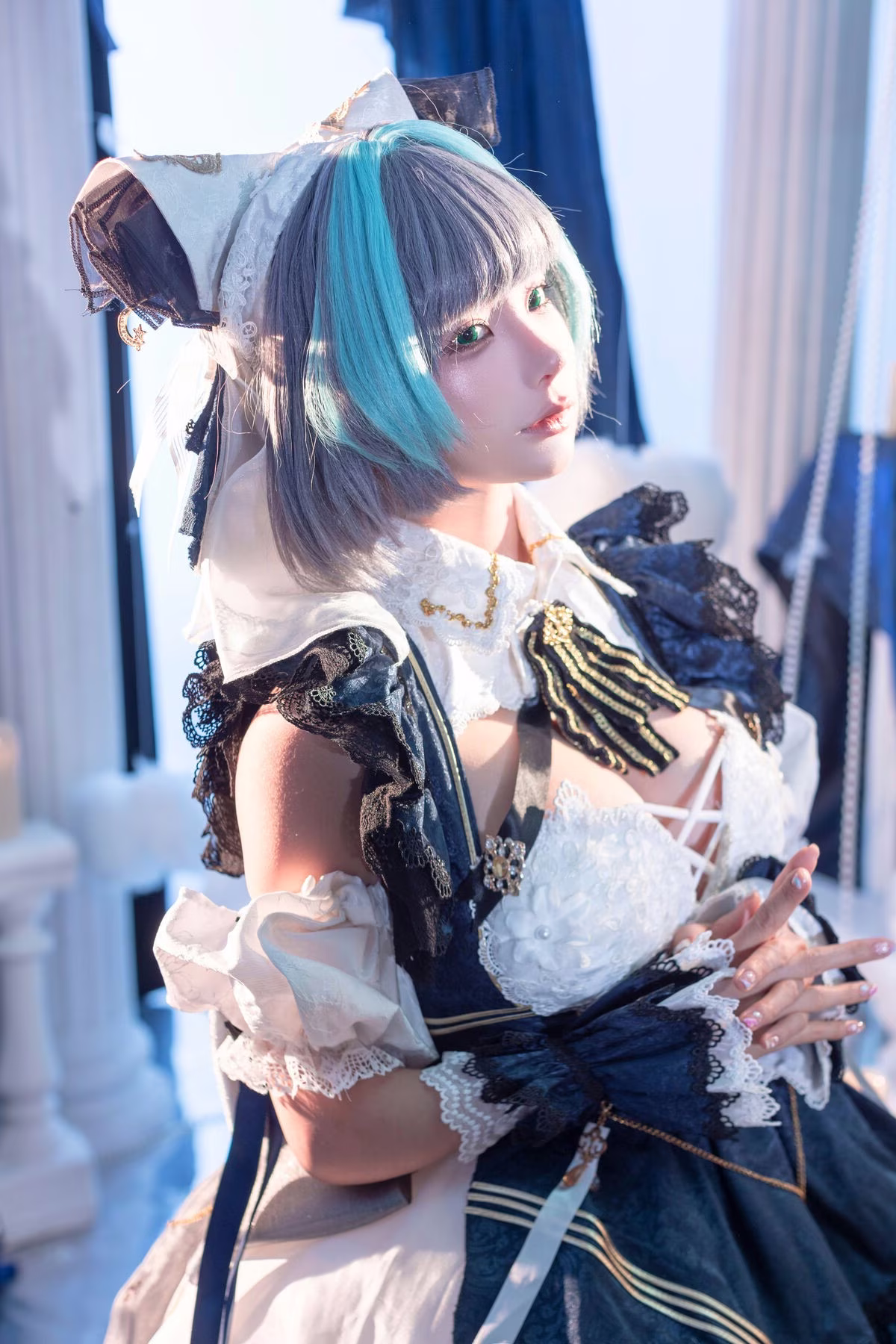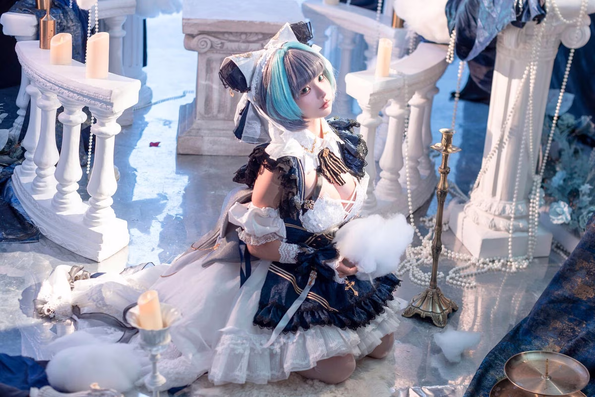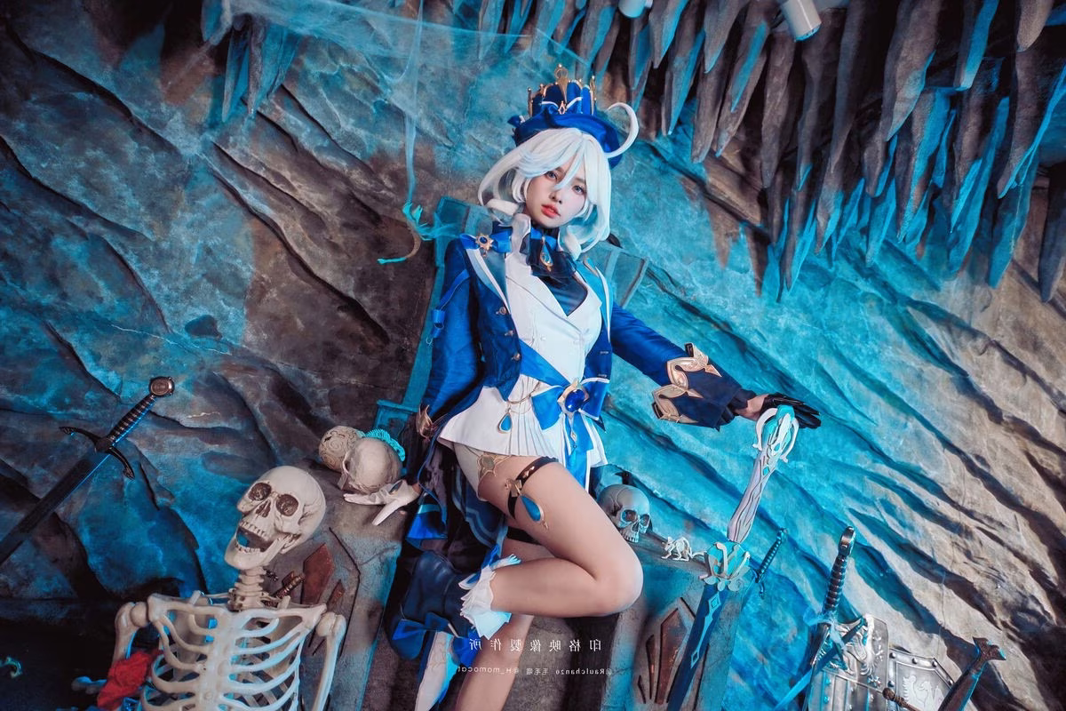 Coser Mumu Momo delivers an exceptional portrayal of Furina the God of Justice Her magnificent blue and white costume paired with striking platinum hair creates an aura of nobility and authority Every detail from her ornate hat to intricate accessories is meticulously crafted showcasing serious dedication to this cosplay Mumu Momos profound gaze and graceful posture perfectly capture Furinas essence a deity both splendid and contemplative This image is not merely a cosplay photograph it is a narrative of justice and enigmatic beauty Viewers will be captivated by the harmonious blend of cosplay skill and authentic emotional expression