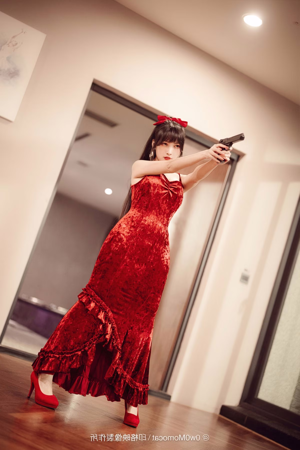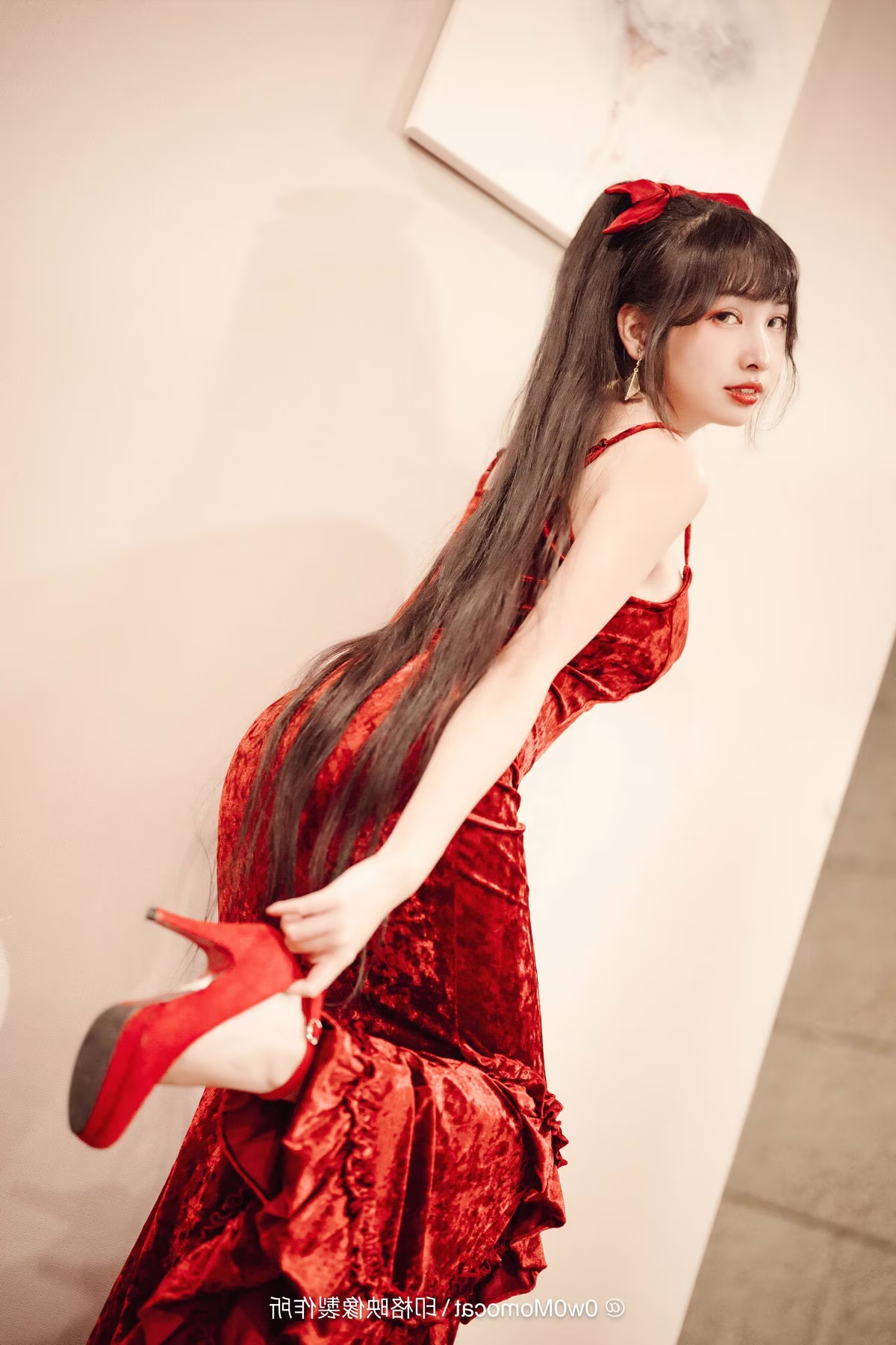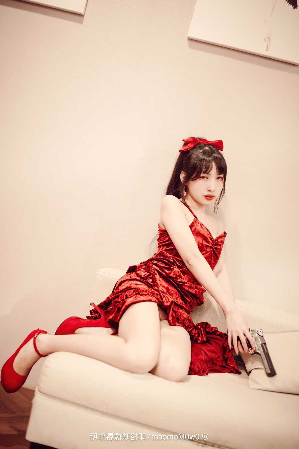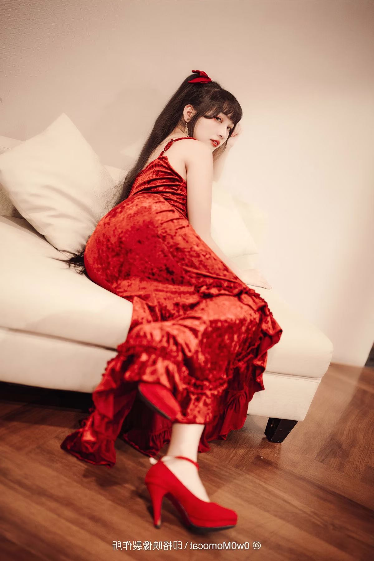 Coser Mu Mu Momo radiates captivating allure in this sensual photoshoot. Reclining gracefully on a sofa, she showcases her stunning figure in a vibrant red outfit complemented by matching high heels. Her mesmerizing gaze and relaxed expression create an intimate and alluring atmosphere hinting at moments after a delightful perhaps tipsy evening. Every detail from her styled hair to her elegant hand placement exudes the confidence and irresistible charm of a professional model. This collection not only highlights Mu Mu Momo's artistry but also offers emotionally rich and visually compelling moments inviting viewers to explore her multifaceted beauty and captivating presence.