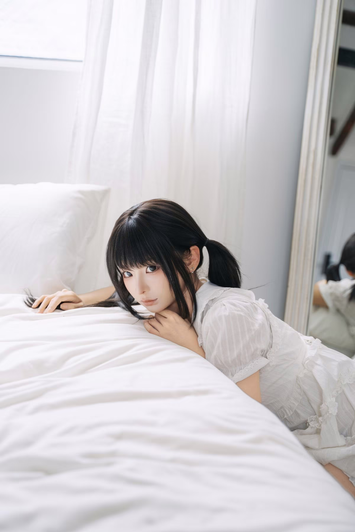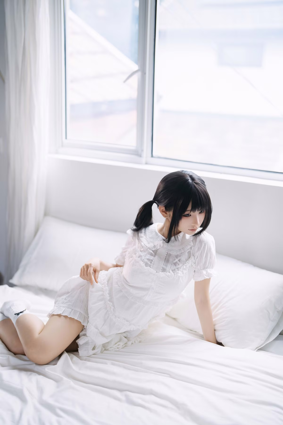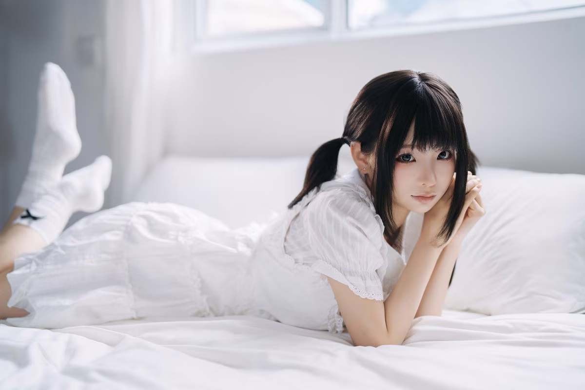 The August 2025 Selfies Part01 by Coser Chunmomo offer an enchanting glimpse into her innocent and delicate beauty. In this captivating image Chunmomo is seen with adorable pigtails adorned in a pristine white dress that evokes a sweet lolita style. She sits gracefully on a soft white bed bathed in natural light from a large window creating an intimate and dreamy ambiance. Her gentle gaze and subtle charming smile are truly mesmerizing sure to captivate every viewer. Each detail within the photograph from her refined posture to the serene backdrop highlights Chunmomo's irresistible allure as captured through her own lens.