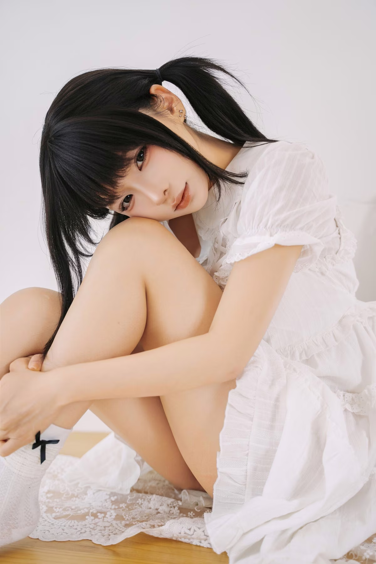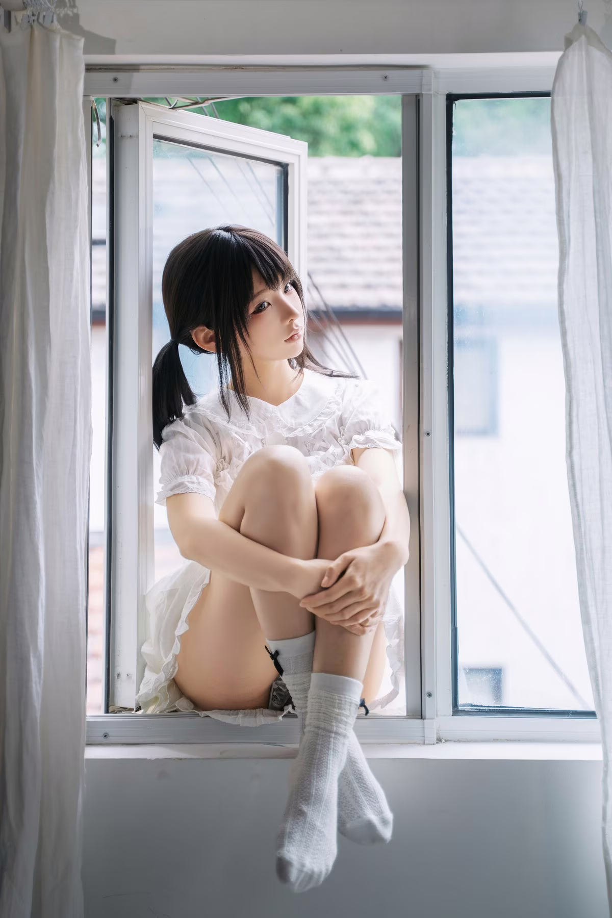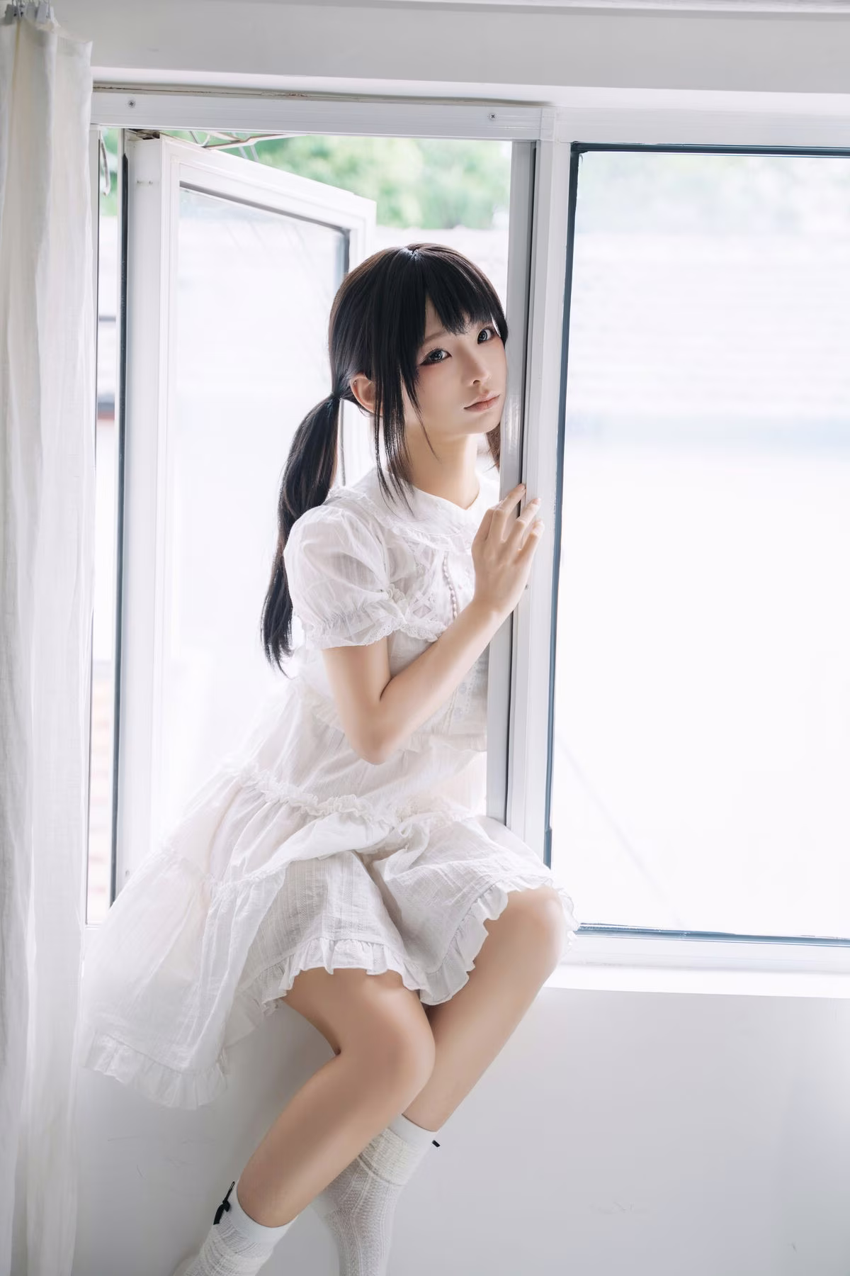 The August 2025 Selfies Part01 by Coser Chunmomo offer an enchanting glimpse into her innocent and delicate beauty. In this captivating image Chunmomo is seen with adorable pigtails adorned in a pristine white dress that evokes a sweet lolita style. She sits gracefully on a soft white bed bathed in natural light from a large window creating an intimate and dreamy ambiance. Her gentle gaze and subtle charming smile are truly mesmerizing sure to captivate every viewer. Each detail within the photograph from her refined posture to the serene backdrop highlights Chunmomo's irresistible allure as captured through her own lens.