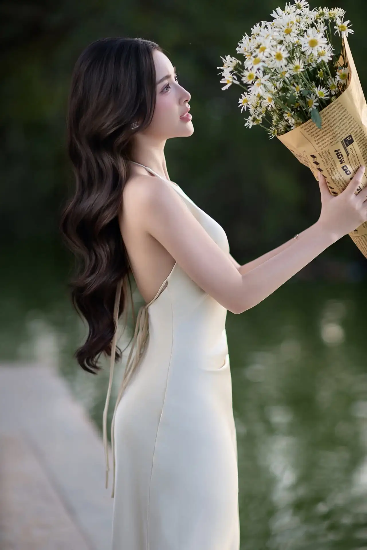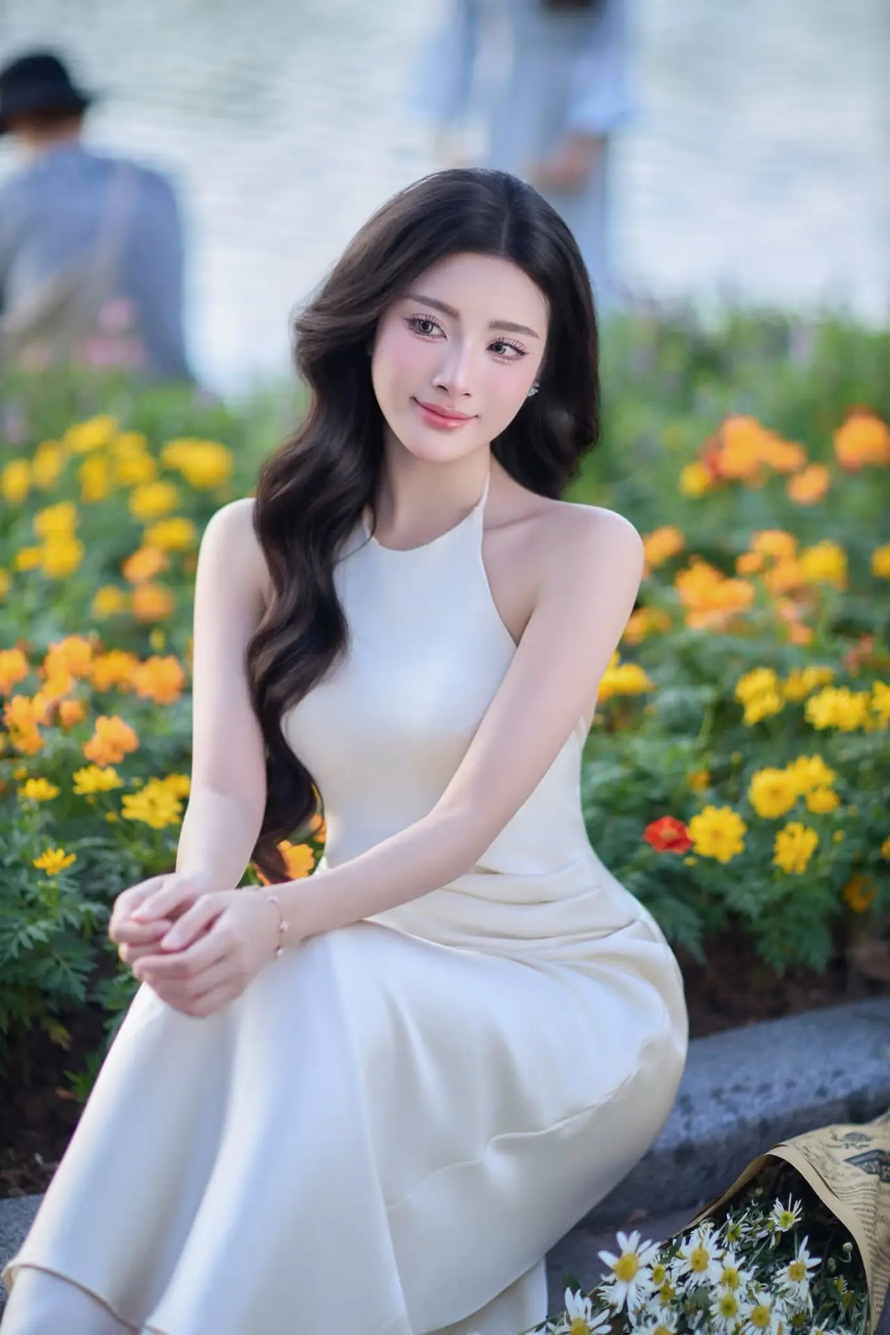 This photo captures a beautiful woman exuding an incredibly elegant and gentle demeanor. She possesses captivating Asian beauty, with long flowing dark hair cascading naturally. Her graceful smile and gentle eyes further enhance her charm. She wears a soft, cream-colored silk dress with a sophisticated halter neck design, accentuating her slender figure and refined poise. Seated amidst a vibrant spring flower garden adorned with yellow and orange hues, she appears like a blooming flower, blending seamlessly with nature. The woman's natural, pure beauty, combined with the harmonious interplay of her attire and the scenery, creates a truly poetic and serene moment. This image perfectly embodies elegance, femininity, and timeless beauty.#AsianBeauty #BeautifulWoman #ElegantSilkDress #SpringFashion #GentleStyle