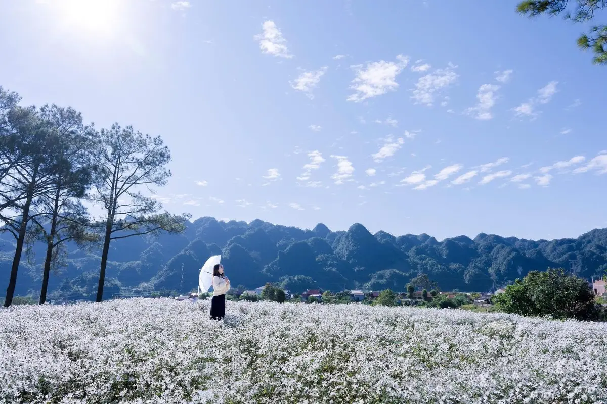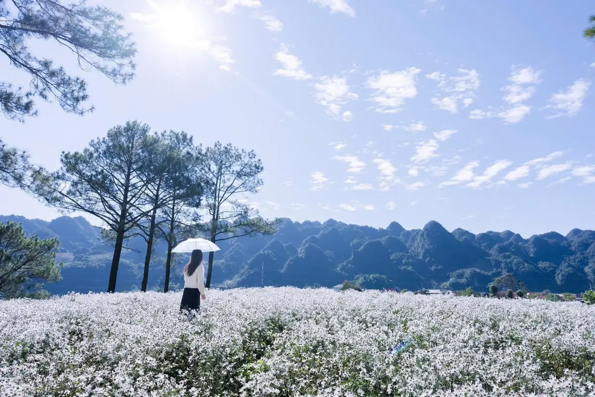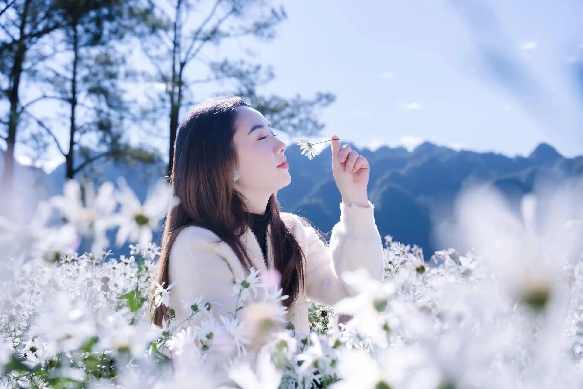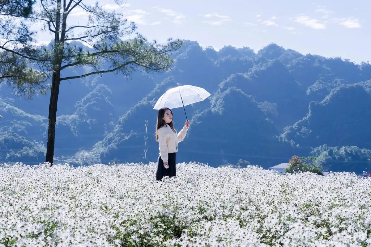 This stunning photograph captures a graceful young woman standing amidst a vast sea of pure white daisy flowers in Moc Chau. The elegant figure poses gently with a white umbrella blending seamlessly into the pristine ambiance of the plateau. The endless expanse of pure white daisies creates a romantic and poetic scenery characteristic of Moc Chau tourism during flower season. In the distance majestic mountain ranges and tall pine trees further enhance the serene and cool beauty of this region. This is truly an ideal check-in spot for anyone wishing to capture beautiful photographs and cherish memories of a captivating Moc Chau winter.#MocChau #DaisyFields #VietnamTravel #PhotoshootLocation #WinterFlowers