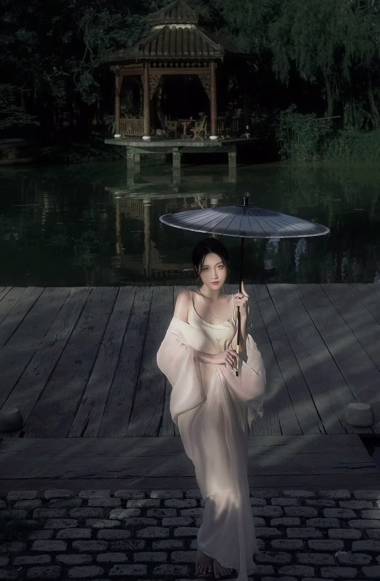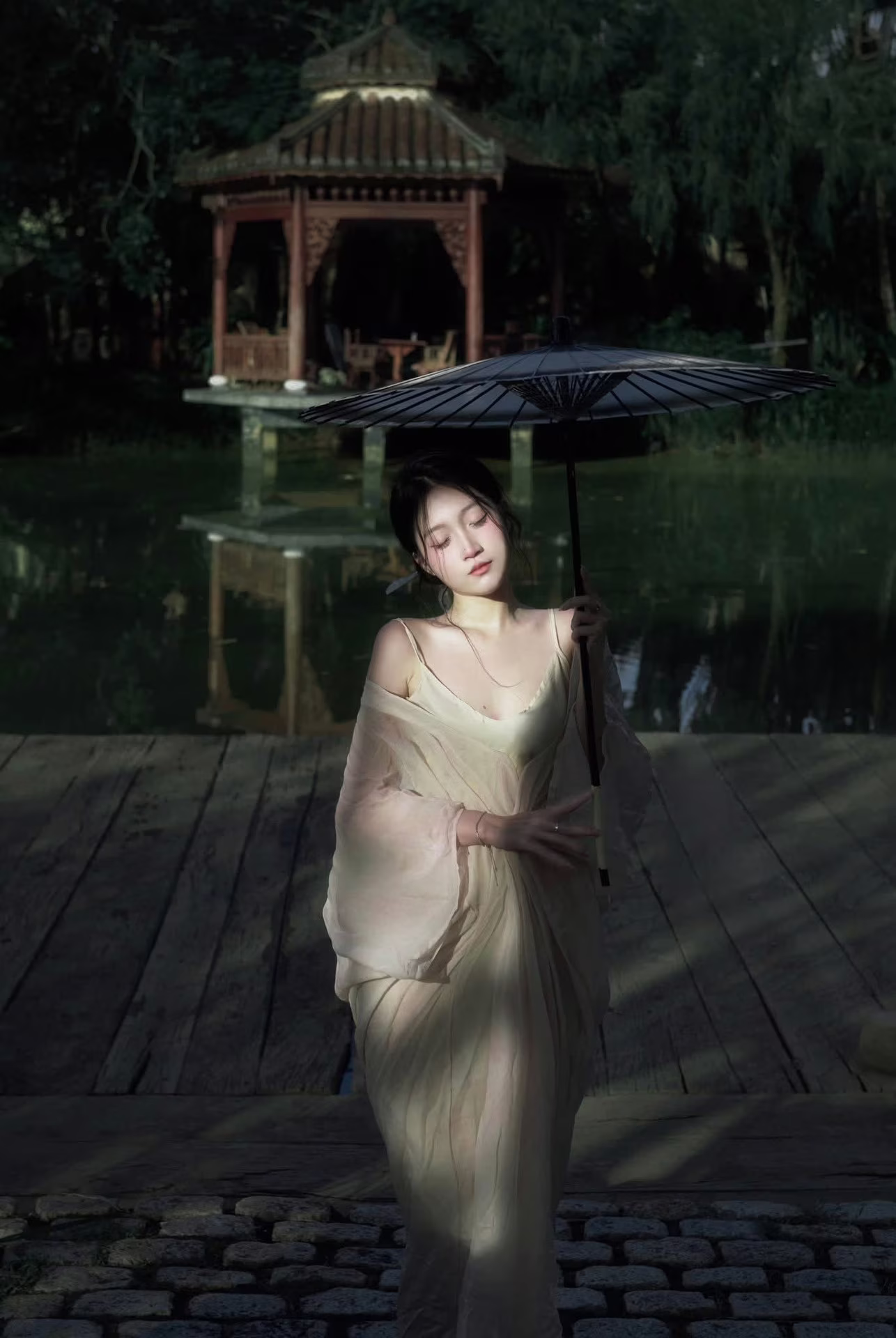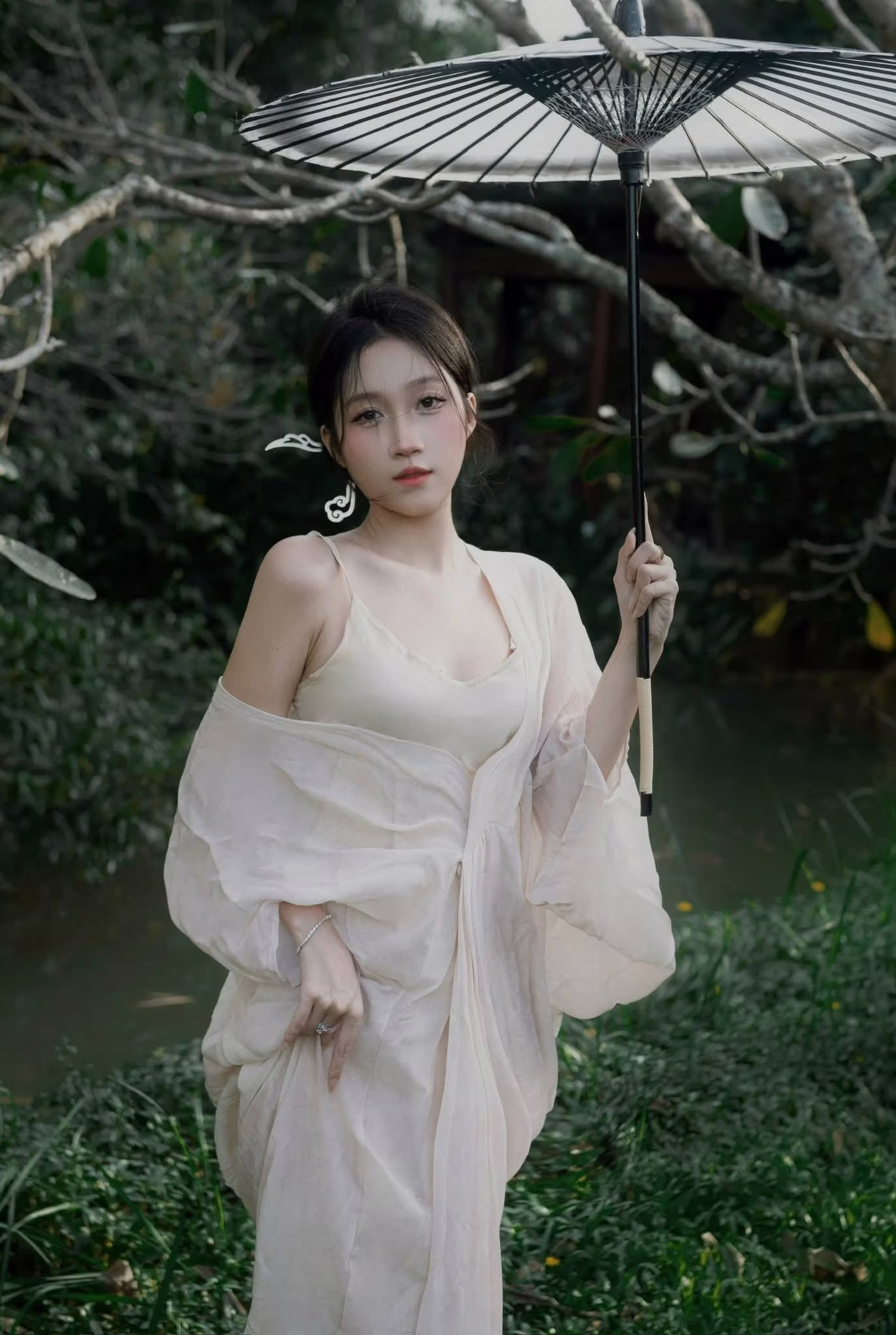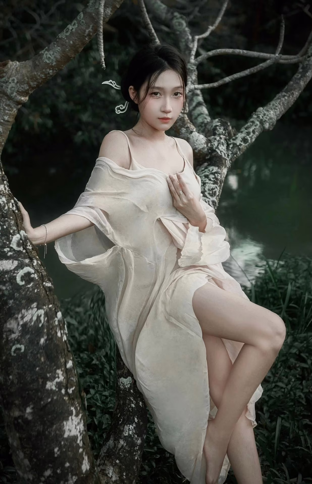 The XVG No.35 image captures an enchanting East Asian muse, embodying delicate beauty and grace, akin to a living work of art. She sits thoughtfully by tranquil waters, adorned in a flowing, ethereal gown that highlights her elegance. Her gentle, downward gaze conveys a sense of introspection and quiet emotion, creating a moment of profound serenity. A delicate white and yellow lotus flower rests beside her, enhancing the pure aesthetic and harmonizing with the peaceful natural setting. This photograph transcends mere imagery; it is an artistic masterpiece, evoking timeless tranquility and exquisite beauty.XVG No.35: Vintage Artistic Muse – Dreamy and Pure Beauty