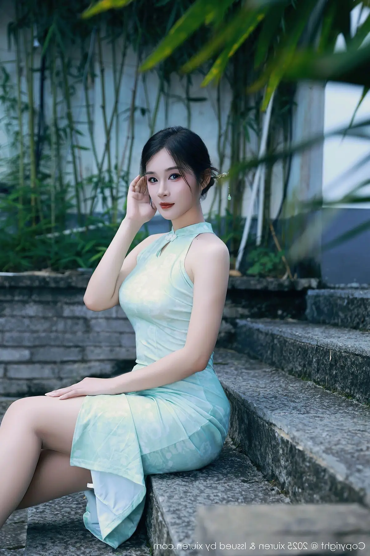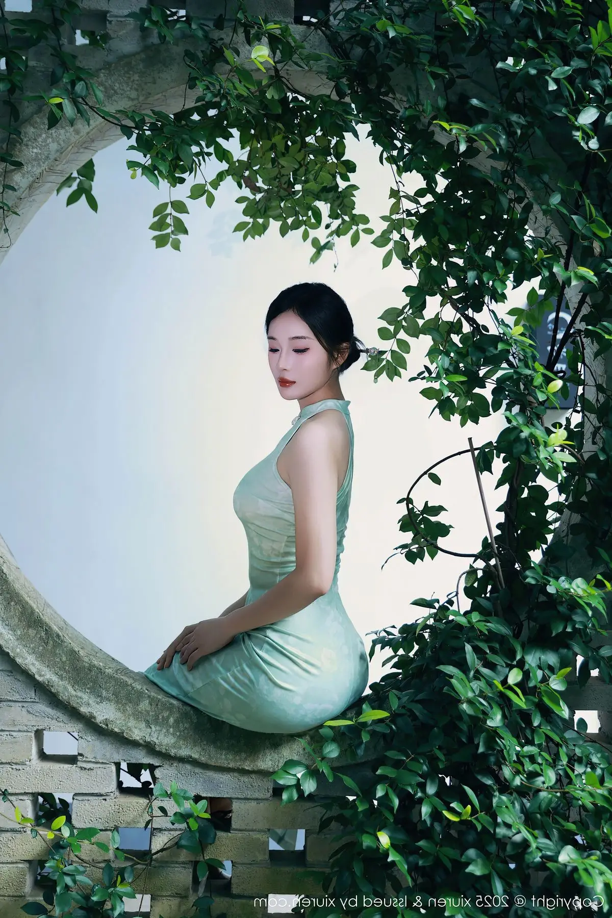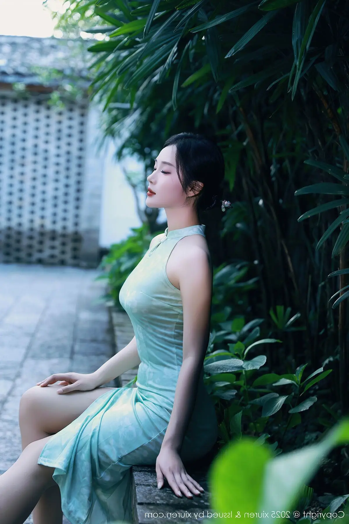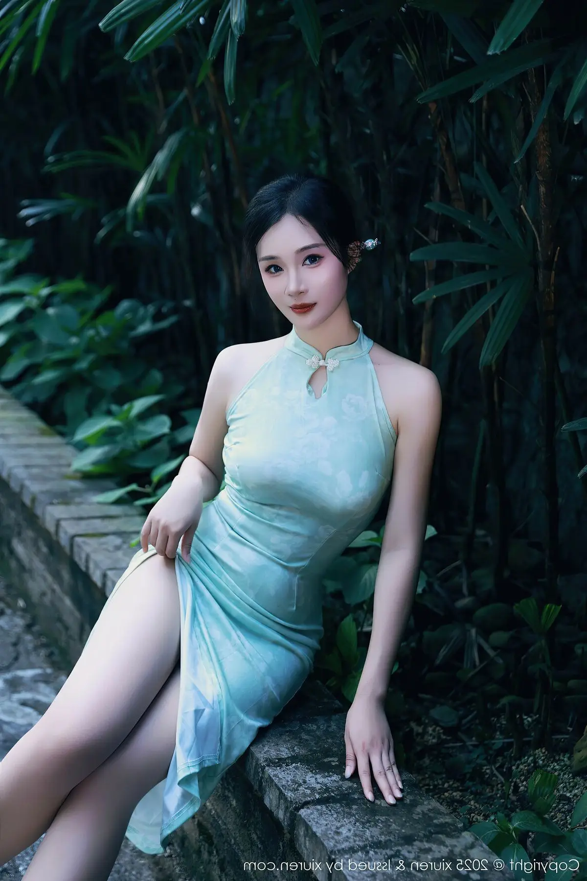 Nan Qiao appears captivating in a delicate jade green cheongsam, form-fitting to accentuate her slender figure. She sits gracefully amidst the lush green foliage, her gentle gaze directed towards the camera. The cleverly designed high slit and soft silk fabric of the dress enhance her unique grace and allure, embodying the essence of Asian beauty. The serene natural backdrop, with its verdant leaves, creates a harmonious scene that highlights Nan Qiao's classic yet modern charm. This XiuRen No.10538 photo collection is truly a perfect blend of human and natural beauty, offering an emotionally rich visual experience.#NanQiao #Cheongsam #JadeGreenDress #AsianBeauty #XiuRen
