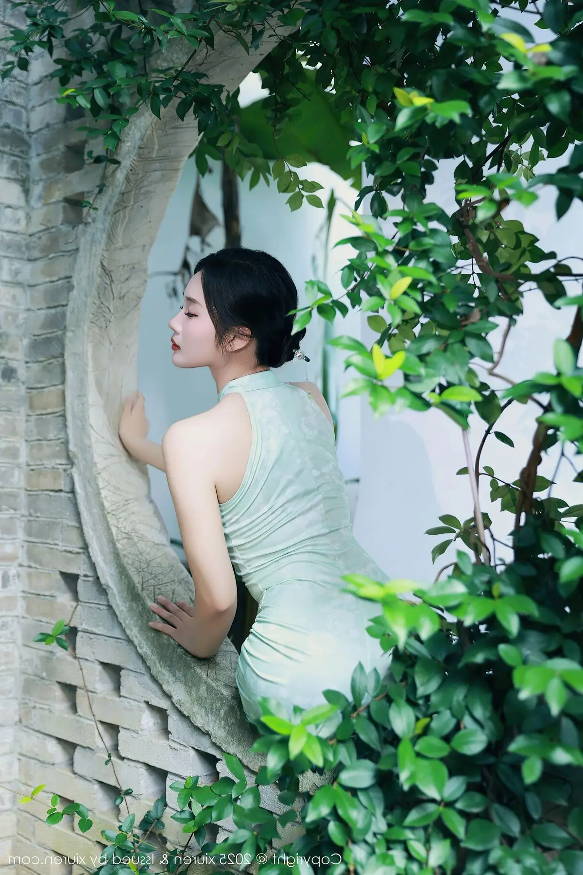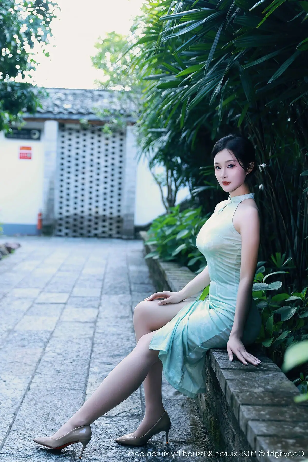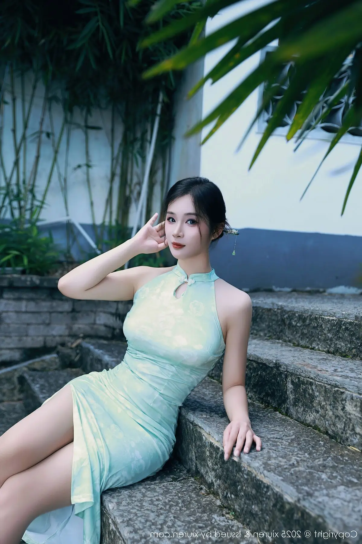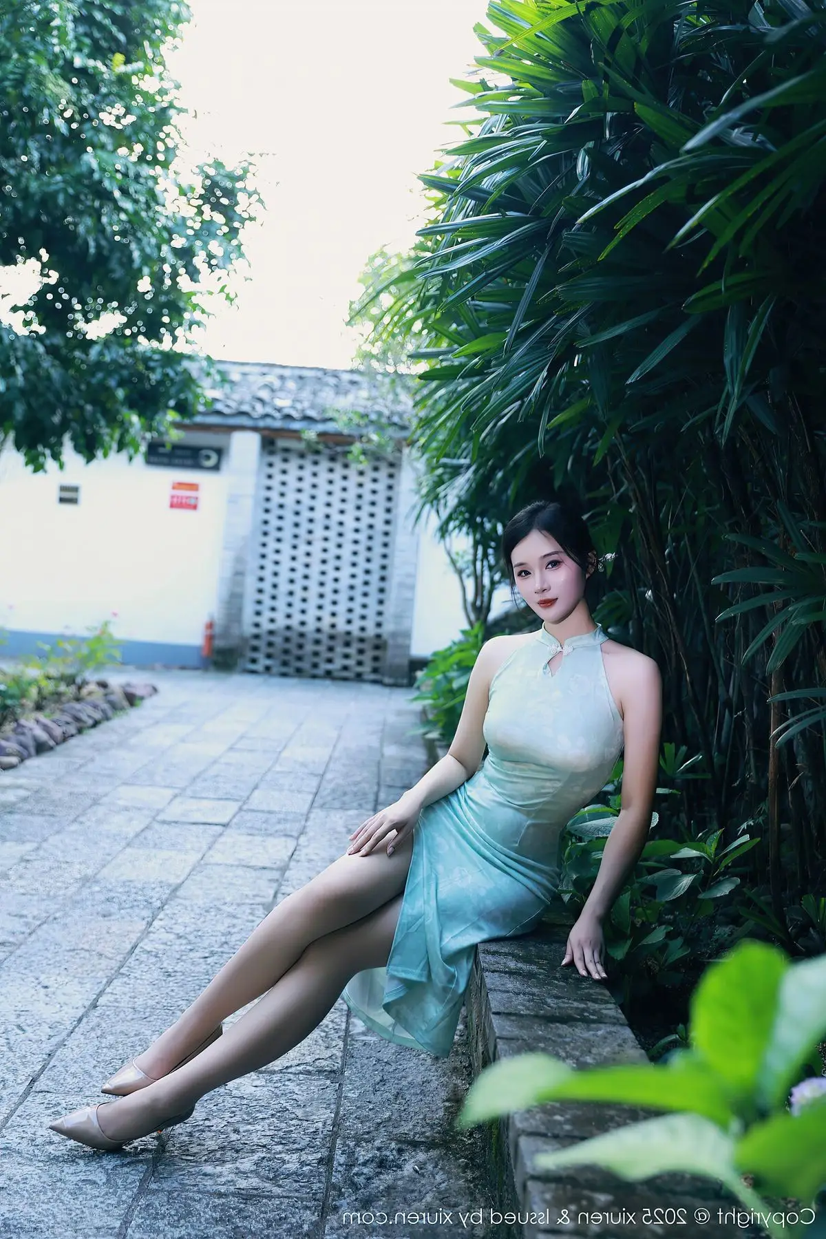 Nan Qiao appears captivating in a delicate jade green cheongsam, form-fitting to accentuate her slender figure. She sits gracefully amidst the lush green foliage, her gentle gaze directed towards the camera. The cleverly designed high slit and soft silk fabric of the dress enhance her unique grace and allure, embodying the essence of Asian beauty. The serene natural backdrop, with its verdant leaves, creates a harmonious scene that highlights Nan Qiao's classic yet modern charm. This XiuRen No.10538 photo collection is truly a perfect blend of human and natural beauty, offering an emotionally rich visual experience.#NanQiao #Cheongsam #JadeGreenDress #AsianBeauty #XiuRen