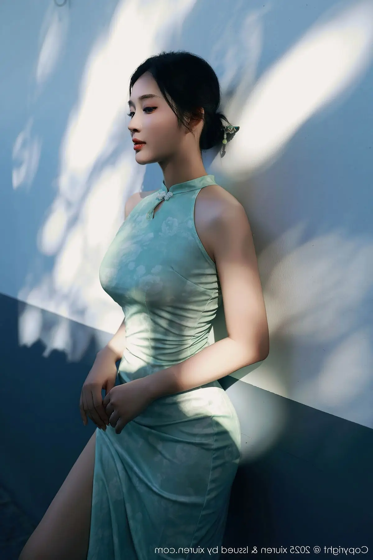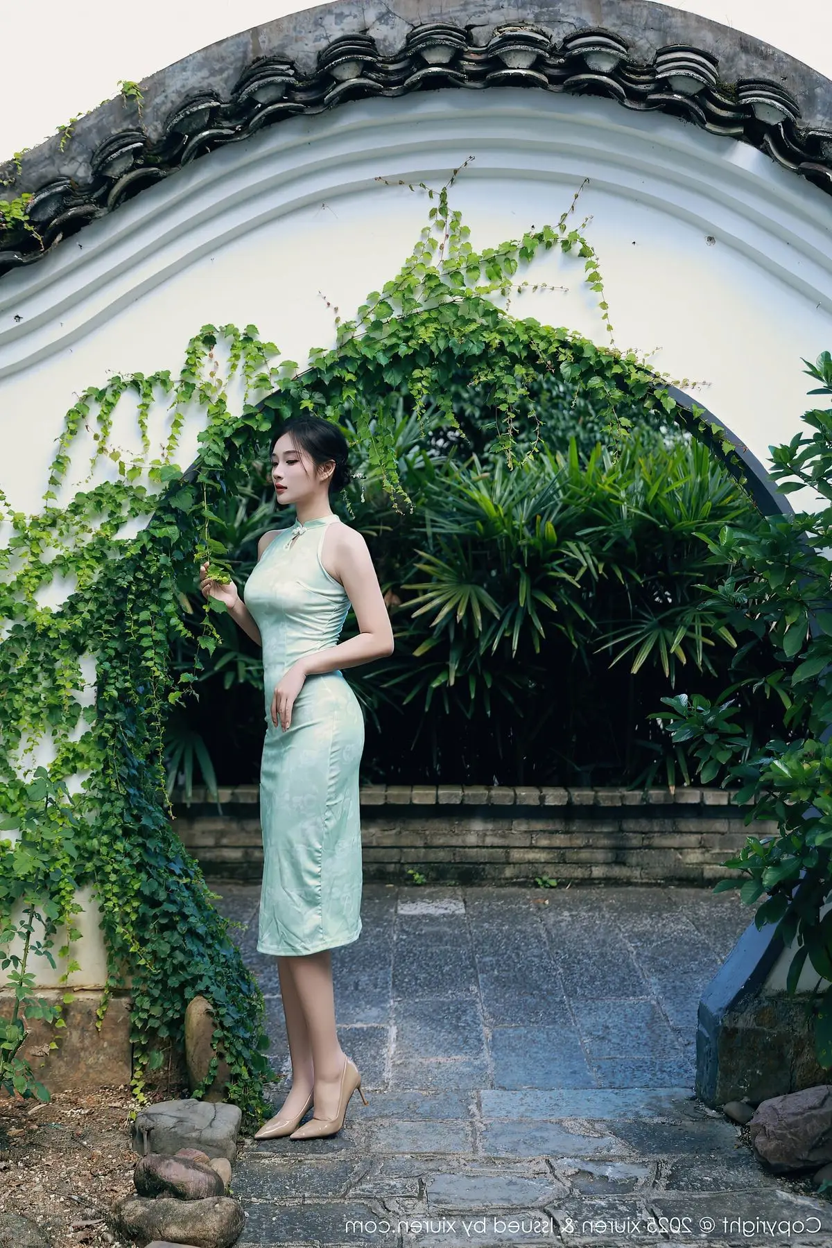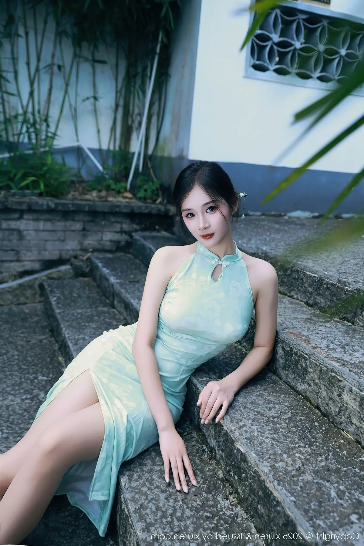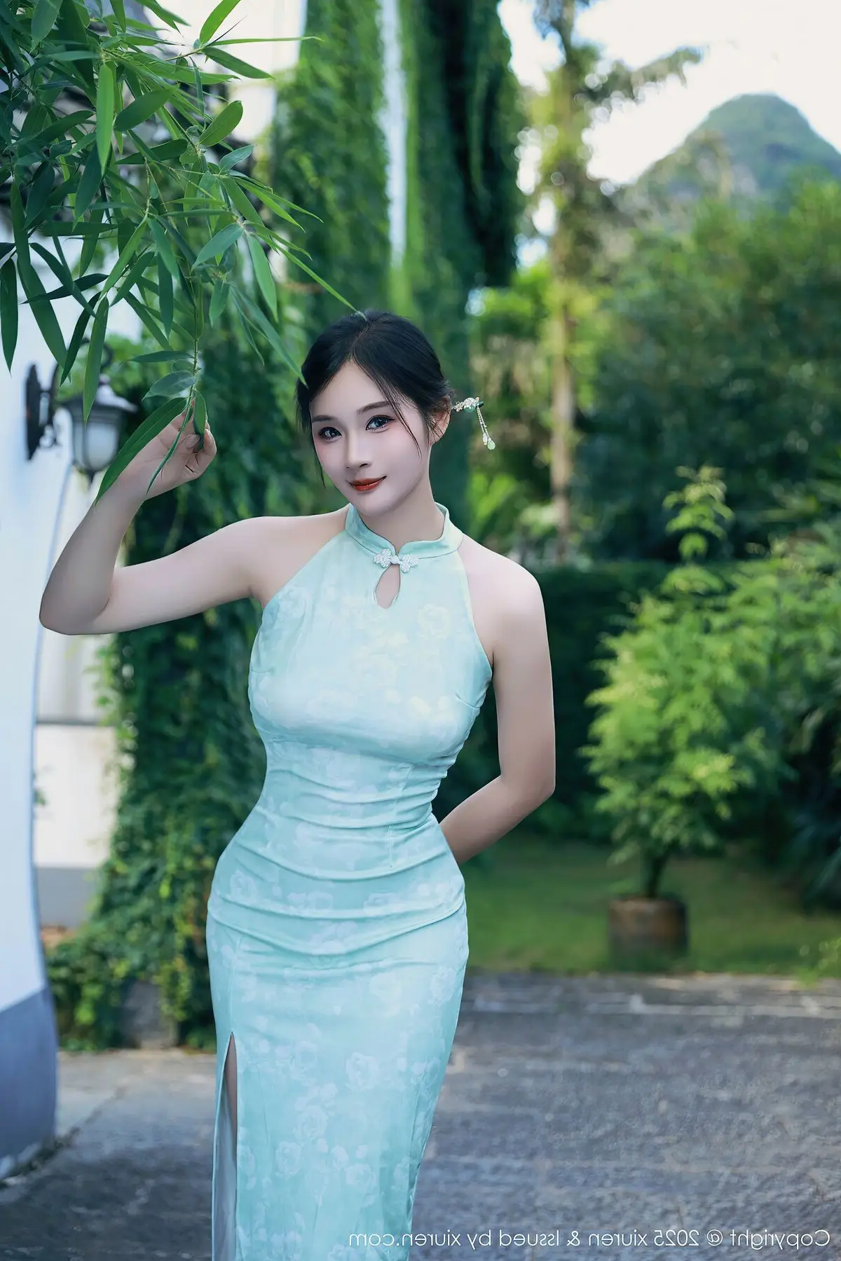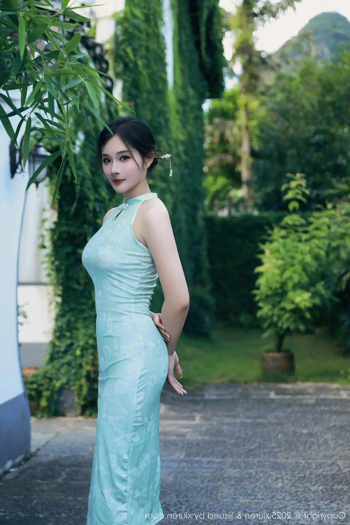 Nan Qiao appears captivating in a delicate jade green cheongsam, form-fitting to accentuate her slender figure. She sits gracefully amidst the lush green foliage, her gentle gaze directed towards the camera. The cleverly designed high slit and soft silk fabric of the dress enhance her unique grace and allure, embodying the essence of Asian beauty. The serene natural backdrop, with its verdant leaves, creates a harmonious scene that highlights Nan Qiao's classic yet modern charm. This XiuRen No.10538 photo collection is truly a perfect blend of human and natural beauty, offering an emotionally rich visual experience.#NanQiao #Cheongsam #JadeGreenDress #AsianBeauty #XiuRen