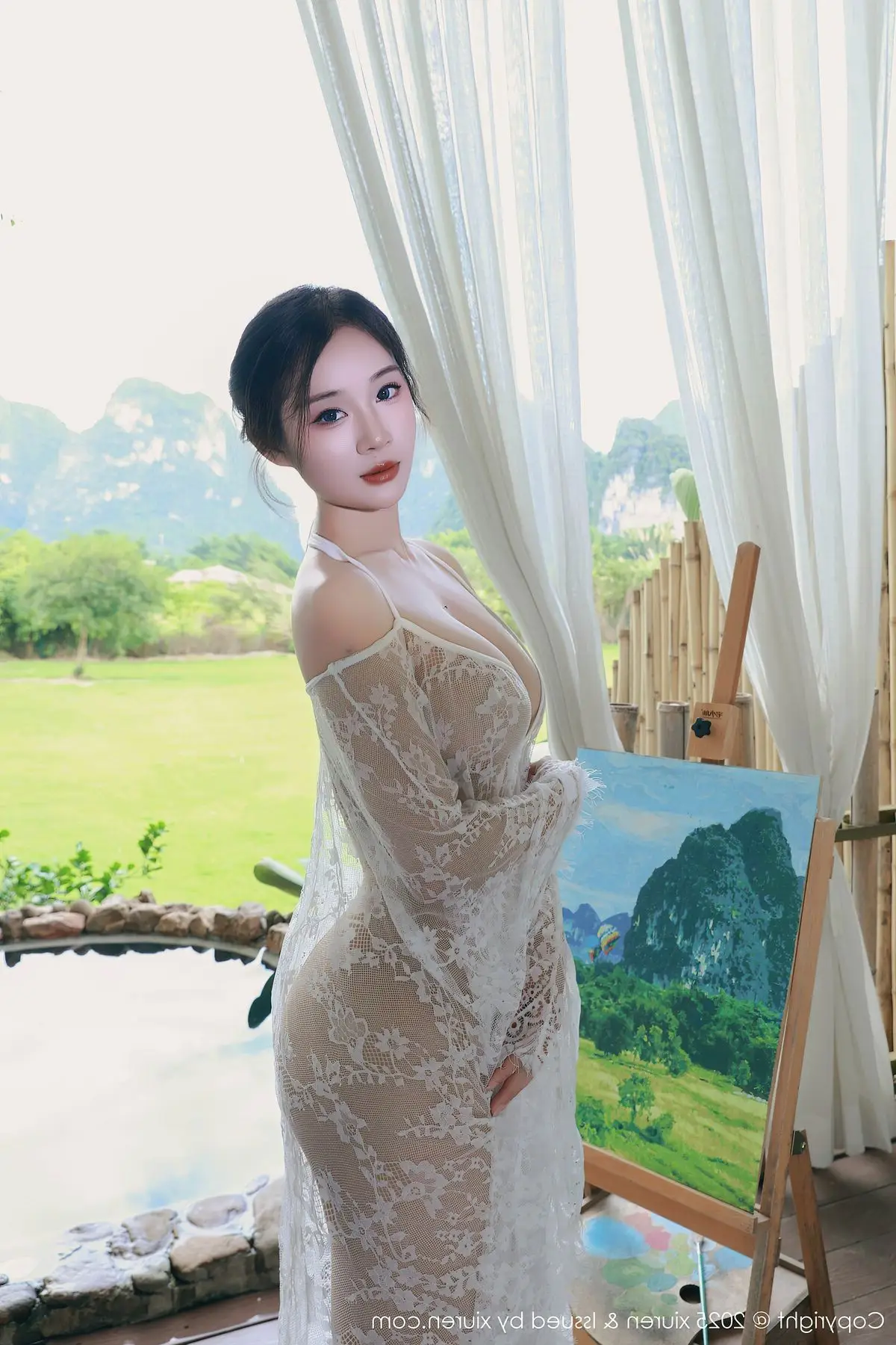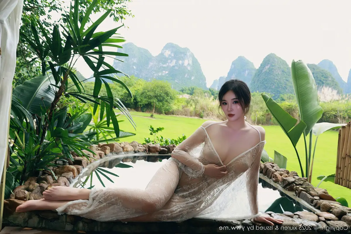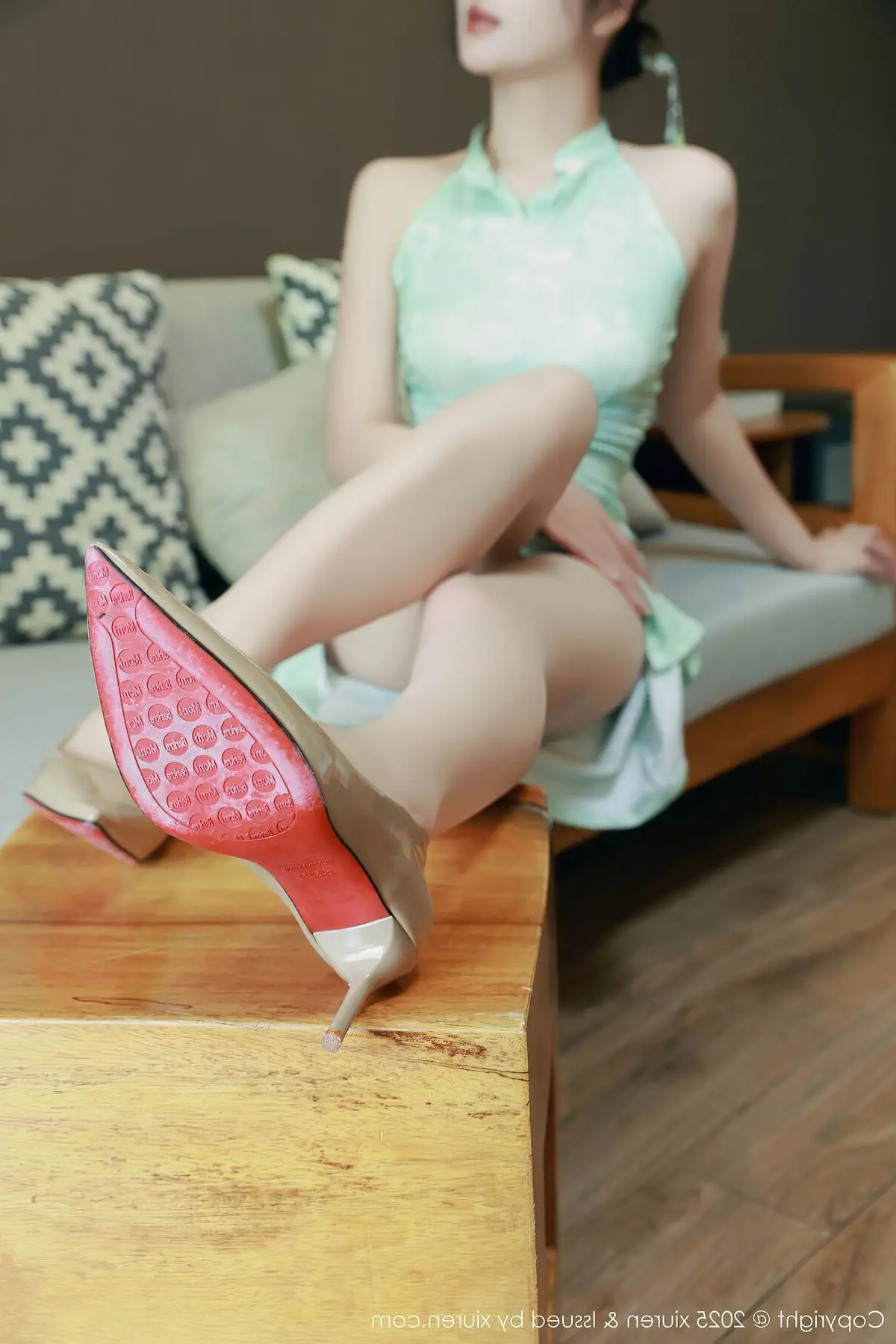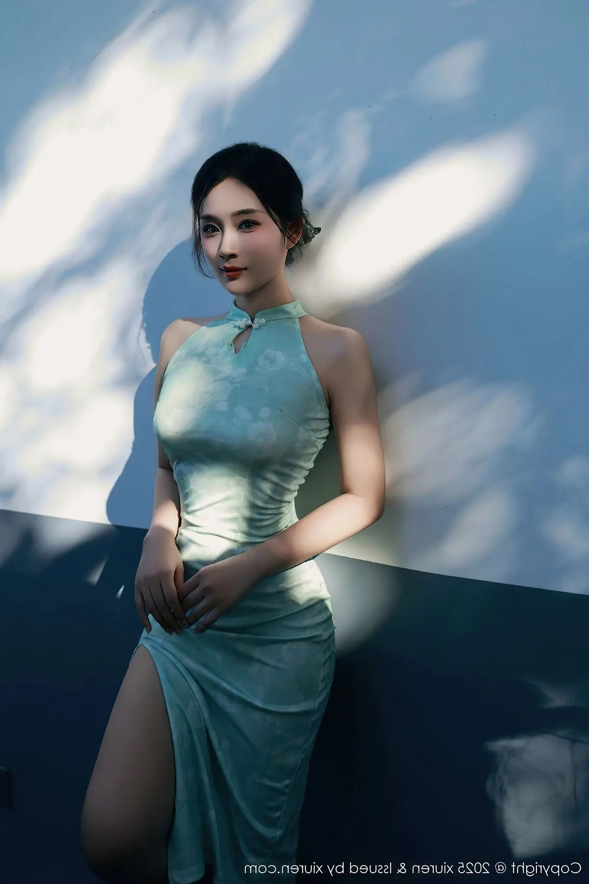 Nan Qiao appears captivating in a delicate jade green cheongsam, form-fitting to accentuate her slender figure. She sits gracefully amidst the lush green foliage, her gentle gaze directed towards the camera. The cleverly designed high slit and soft silk fabric of the dress enhance her unique grace and allure, embodying the essence of Asian beauty. The serene natural backdrop, with its verdant leaves, creates a harmonious scene that highlights Nan Qiao's classic yet modern charm. This XiuRen No.10538 photo collection is truly a perfect blend of human and natural beauty, offering an emotionally rich visual experience.#NanQiao #Cheongsam #JadeGreenDress #AsianBeauty #XiuRen