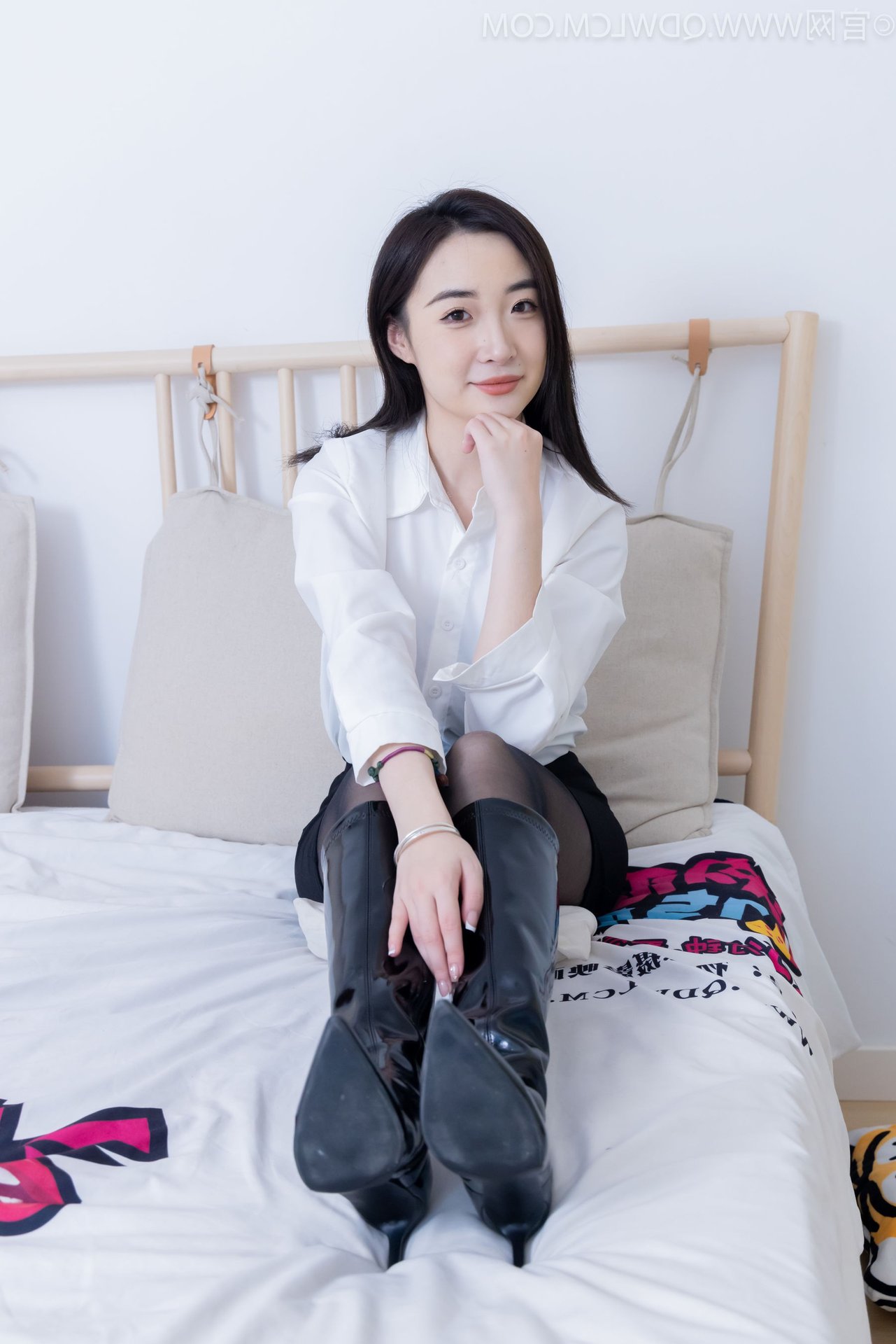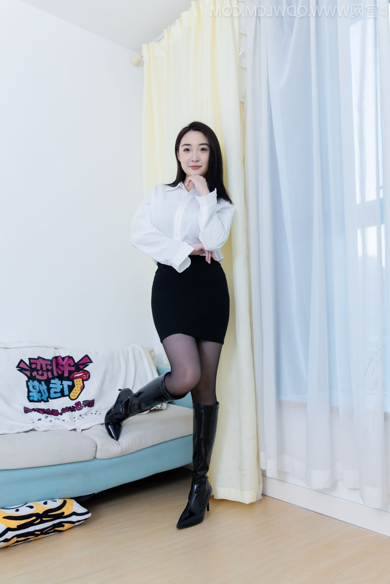 This stunning image features Chinese Model Tian Tian No.2333 exuding elegance and modern sophistication She is impeccably dressed in a crisp white button-up shirt paired with a chic short black skirt creating a professional yet alluring ensemble A captivating highlight is her sheer black stockings gracefully accentuating her slender legs complemented by sleek black long boots adding a touch of high fashion Posing delicately by a sunlit window framed by soft curtains Tian Tian radiates both purity and confident charm Her composed demeanor and stylish attire make this photograph a perfect representation of contemporary office fashion and the refined aesthetic of Chinese models This visual content is ideal for enthusiasts of elegant and inspiring fashion imagery