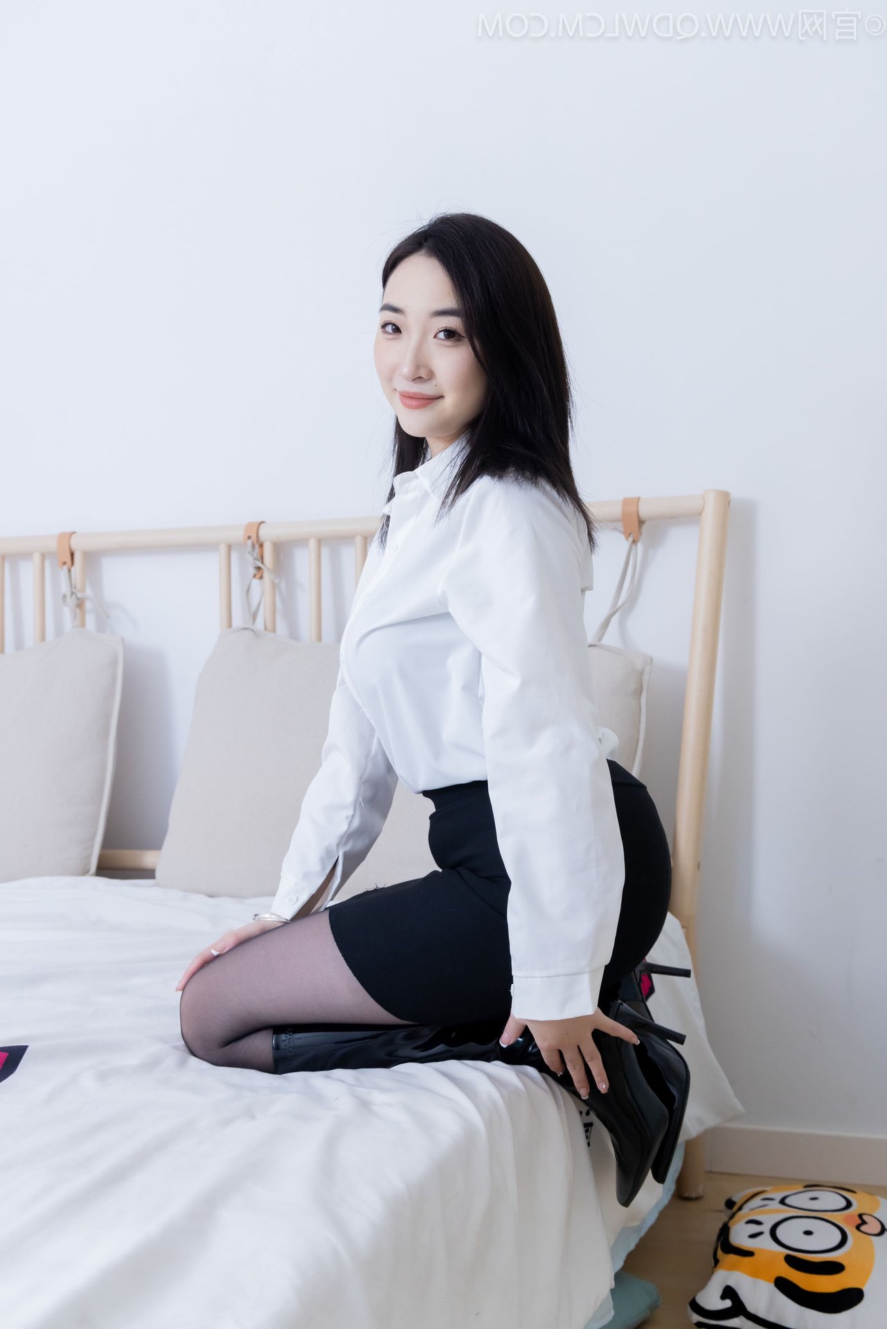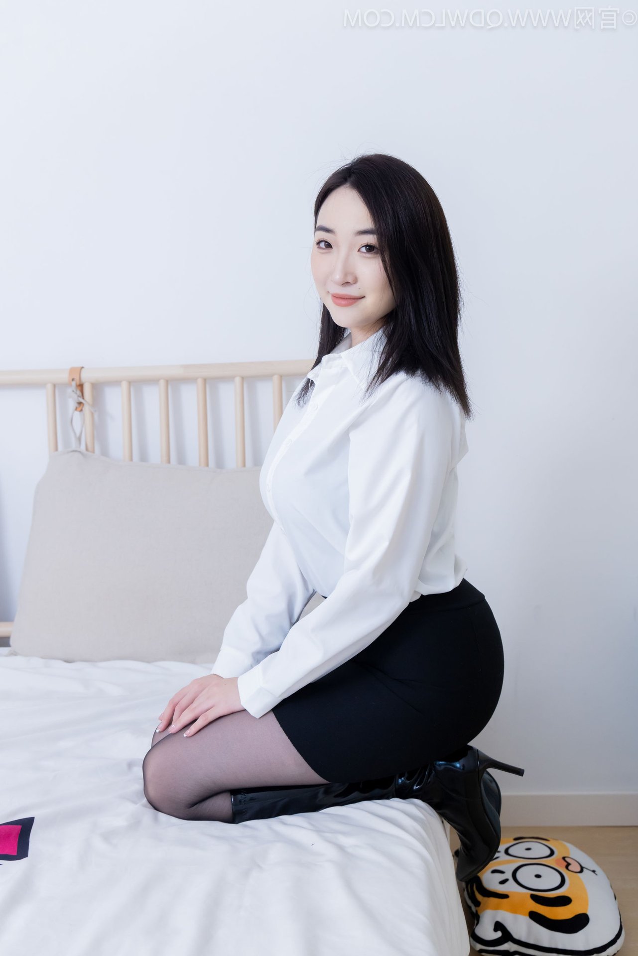 Admire Zhou Yu Xi in her captivating and professional secretary persona. She wears a pristine white shirt paired with a form-fitting black skirt, accentuating her slender figure. Her long, graceful legs are subtly showcased through sheer black stockings and sharp high heels, further enhancing her alluring charm. With a confident demeanor and sharp gaze, Zhou Yu Xi exudes an air of authority yet remains elegantly graceful. This seemingly formal office attire is transformed by her into an emblem of sophisticated elegance and modern beauty, effortlessly captivating every glance.
