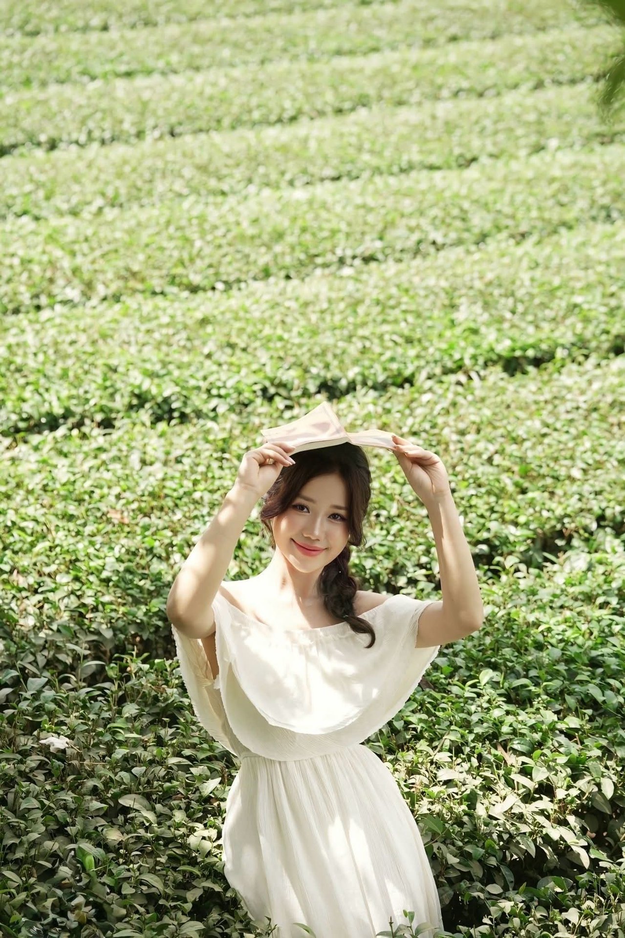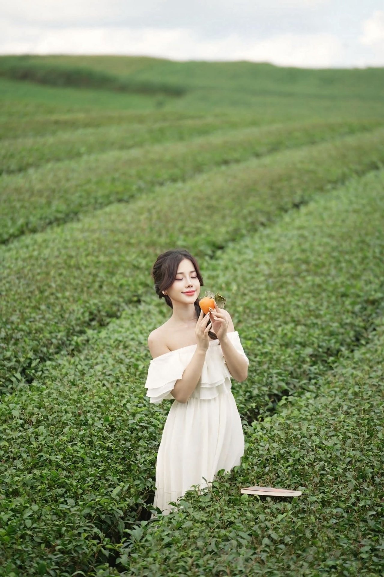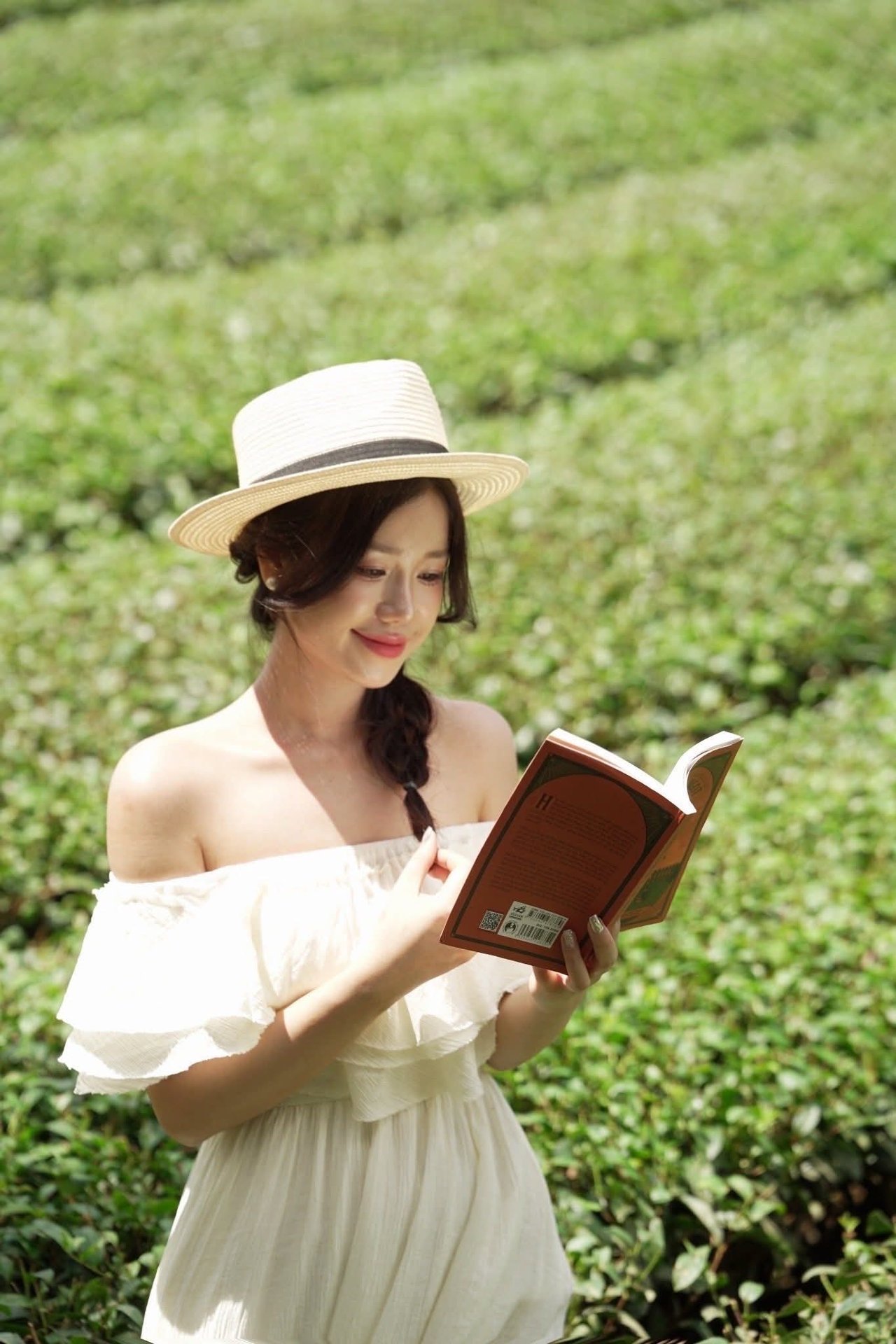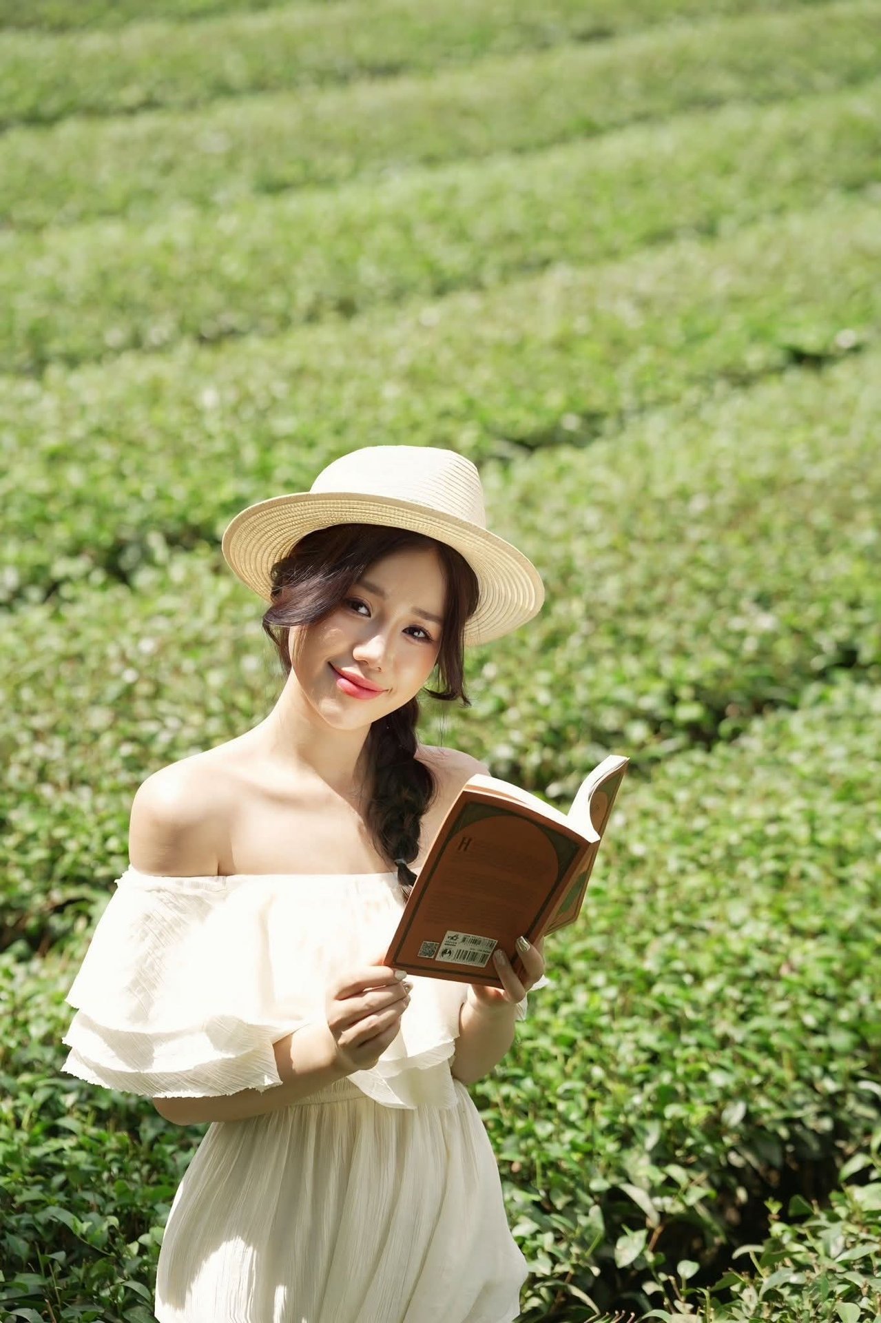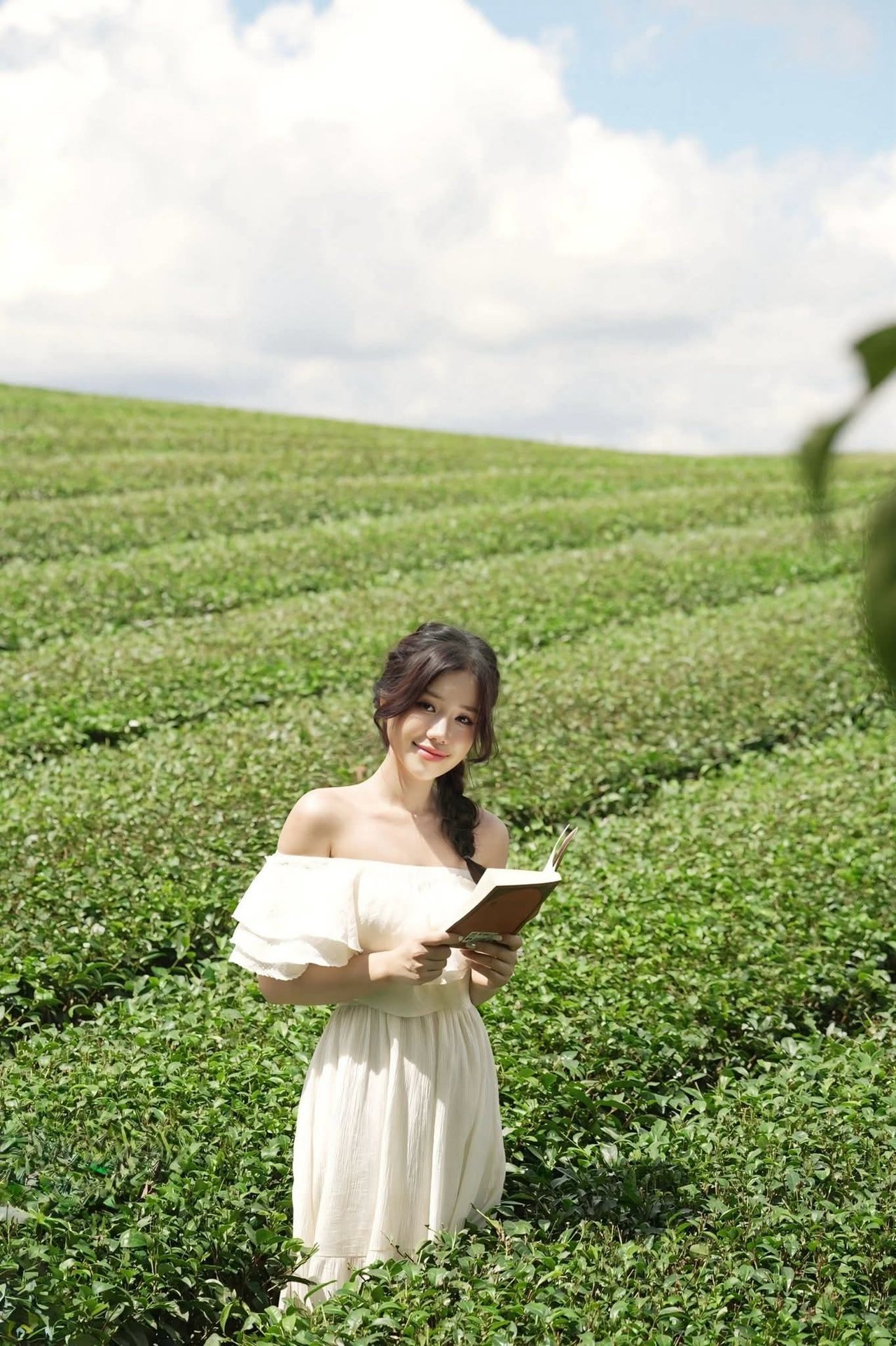 The image captures a serene moment of a young woman amidst the vast expanse of a lush green tea hill. Dressed in a pristine white off-shoulder dress she gently closes her eyes savoring the pure essence of nature. With a book in her hands she seems to be immersed in her own world against the magnificent backdrop. Soft sunlight and a cool breeze create a peaceful tableau where the soul finds solace. This is a perfect moment to escape life's hustle and bustle seeking tranquility and natural beauty.