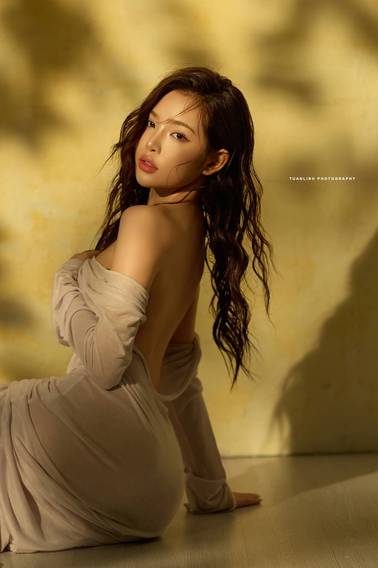 This stunning photograph captures a woman embodying elegant beauty and captivating allure, gracefully posed on the floor. She wears a soft, light-colored flowing dress that accentuates her figure with delicate lines. The artistic highlight is the warm lighting and the ethereal leaf-like shadows cast upon the wall, creating a mystical and romantic ambiance. Her deep gaze and flowing hair further enhance her enchanting presence. This is a refined portrait showcasing a harmonious blend of human beauty and artistic lighting effects, evoking a sense of serene charm yet profound fascination.