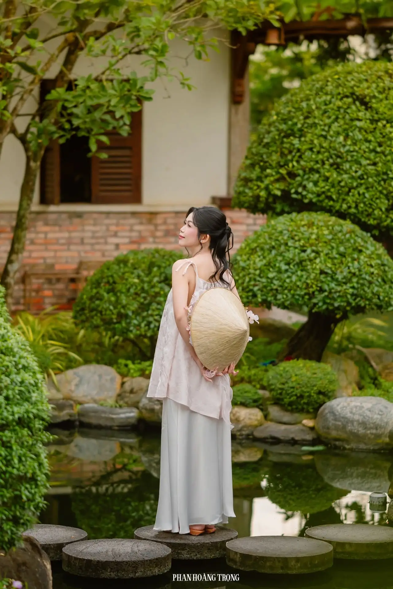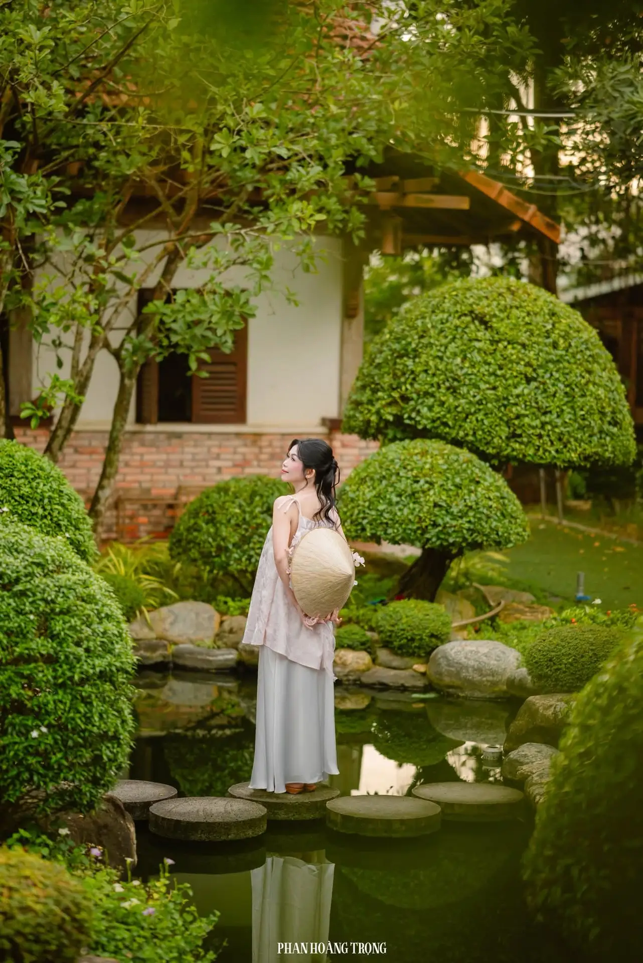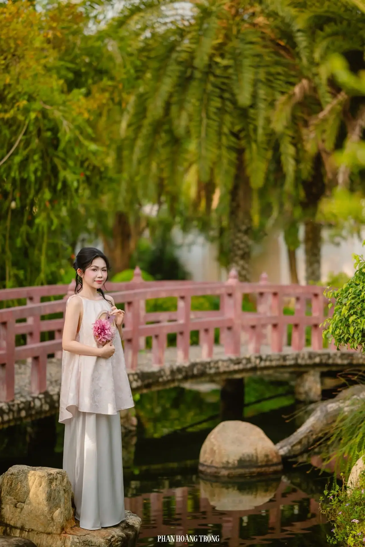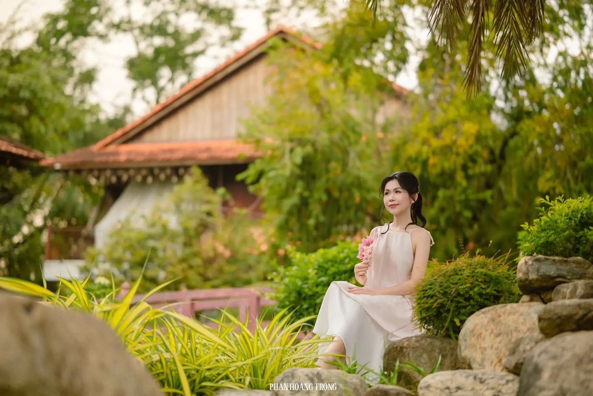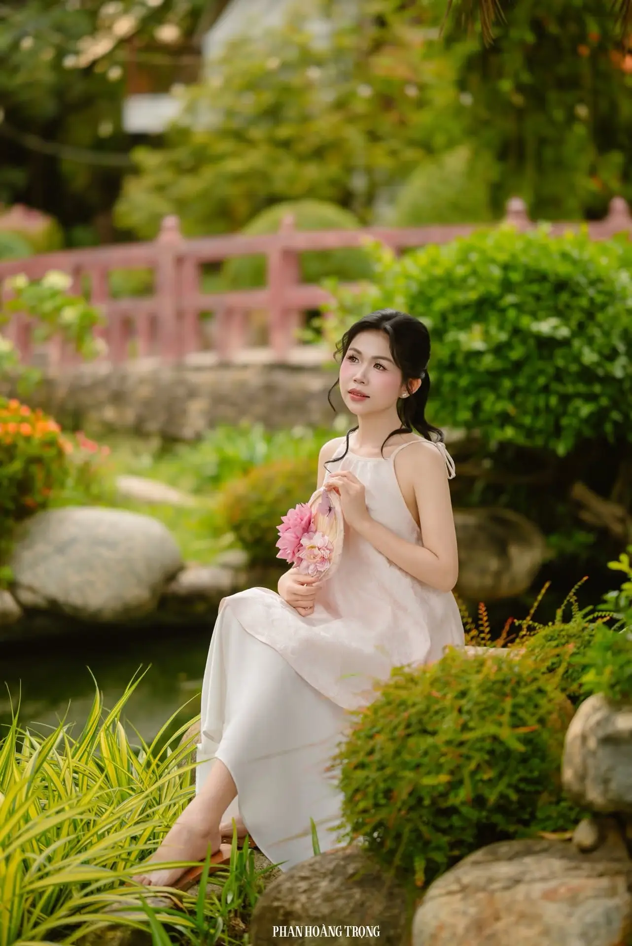 This stunning photograph captures a graceful young woman nestled in the heart of a lush green garden. Adorned in a pristine white dress and holding a delicate pink bouquet, she exudes an ethereal beauty, effortlessly blending with the vibrant nature surrounding her. Her dreamy gaze and serene expression cultivate a tranquil, poetic atmosphere. Lush foliage, moss-covered rocks, and a clear reflective pond complete the picturesque landscape. More than just a portrait, this image invites viewers to immerse themselves in peacefulness where human beauty and natural splendor harmoniously intertwine. A truly serene moment amidst life's hustle and bustle.#GirlInGarden #EtherealBeauty #NatureAndPeople #OutdoorPortrait #PeacefulMoment