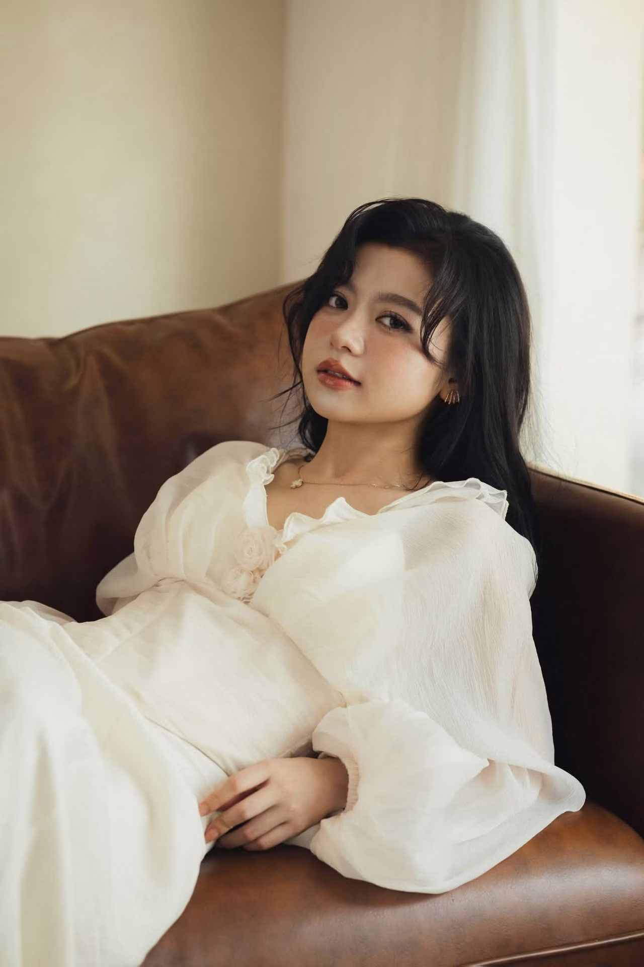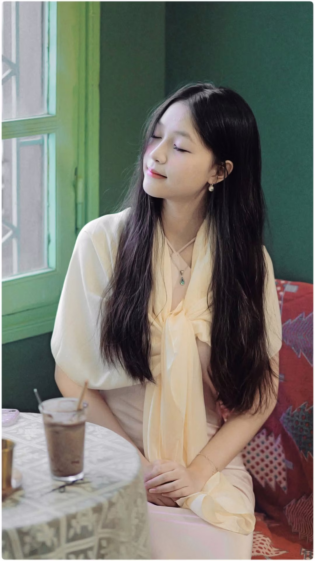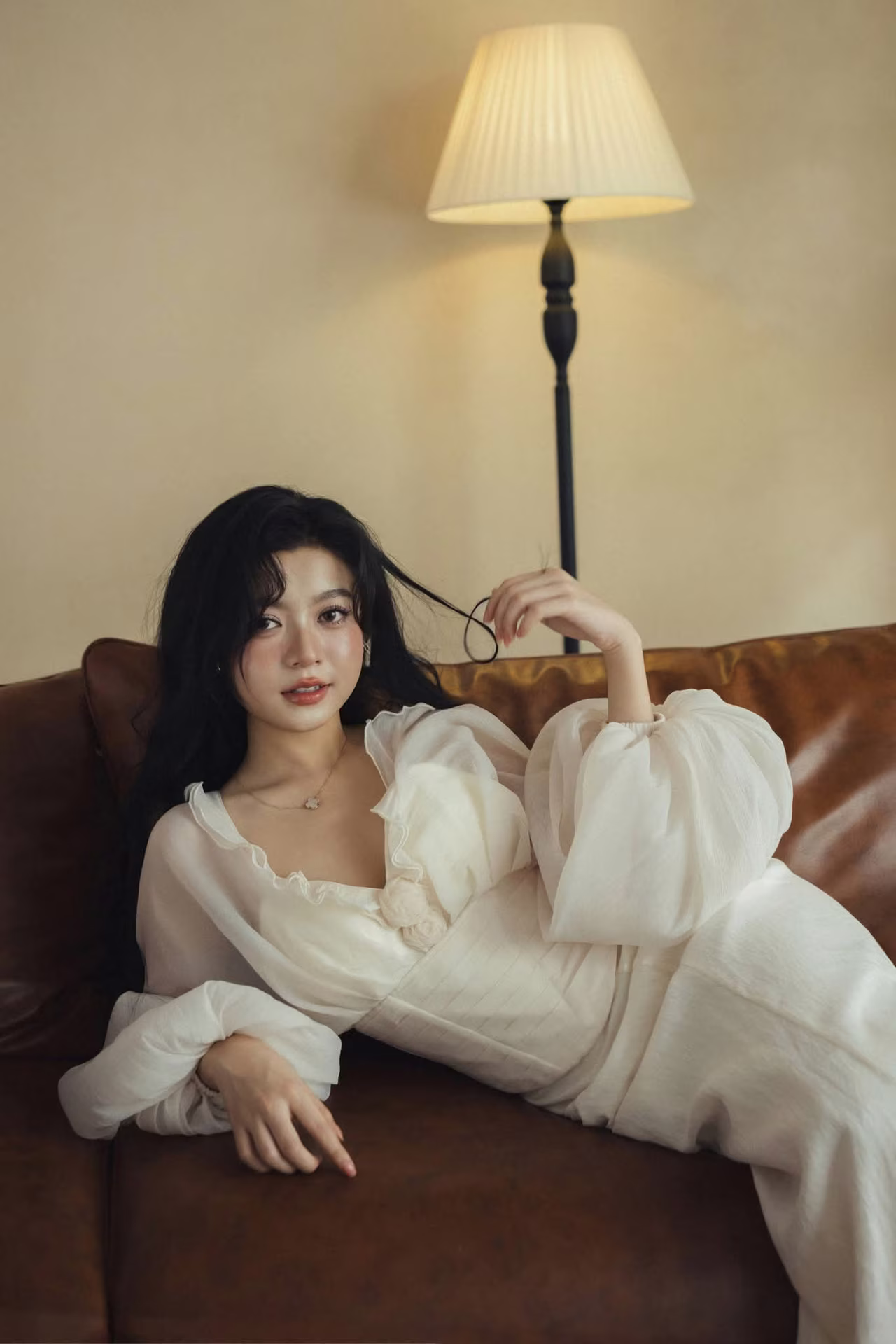 In this VGU No.26 photograph we encounter a captivating serene moment featuring a young Vietnamese woman. She wears a pristine white outfit with voluminous flowing sleeves creating an elegant and ethereal beauty. Her long dark hair cascades naturally highlighting her inherent gentle and graceful charm. The girl reclines comfortably on a soft sofa bathed in warm golden lamplight establishing a romantic and nostalgic ambiance. Her gaze meets the camera exuding confidence while maintaining an innocent purity. This is more than just a portrait it is a narrative of style and inner beauty. The image evokes a sense of peace and tranquility inviting viewers to admire the inherent grace of the modern Vietnamese woman. #Vietnamese #pretty #charmVGU No.19: The Enchanting Charm of Ao Dai and Vietnamese Beauty in the City