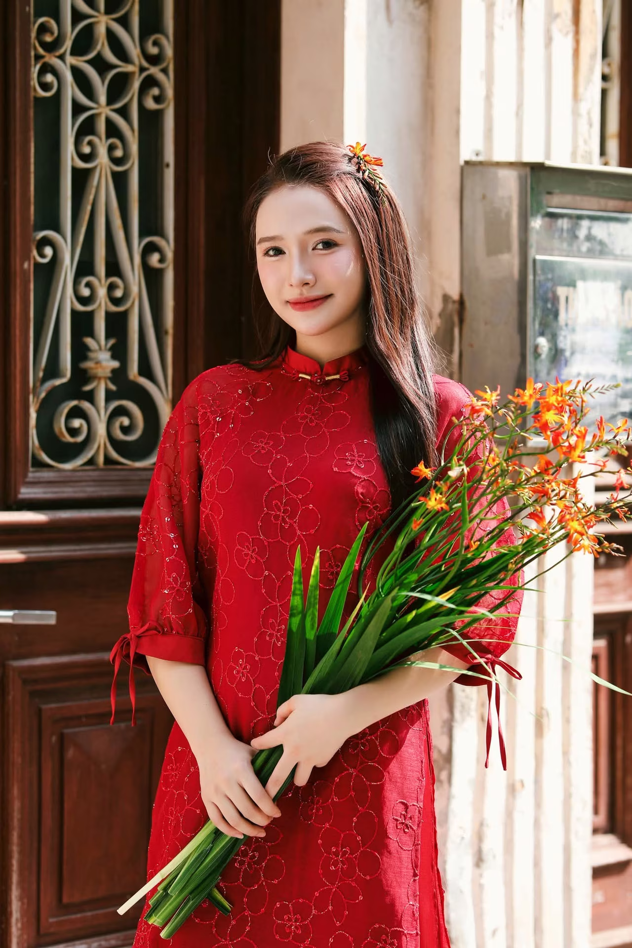 This stunning photograph beautifully captures the graceful charm of a Vietnamese woman adorned in a traditional red Ao Dai. The young lady's radiant smile illuminates the frame, exuding joy and elegance. Her intricately designed Ao Dai highlights her slender figure and pure East Asian beauty. She gently cradles a vibrant bouquet of fresh flowers, adding a touch of color and liveliness to the overall composition. The classic architecture in the background provides a perfect backdrop, evoking a sense of long-standing cultural values. This image is more than just a portrait; it is a proud symbol of national attire and the timeless beauty of Vietnamese women, forever graceful and full of life. #Vietnamese #pretty #charmVGU No.26: Discover the Gentle and Elegant Beauty of a Vietnamese Girl