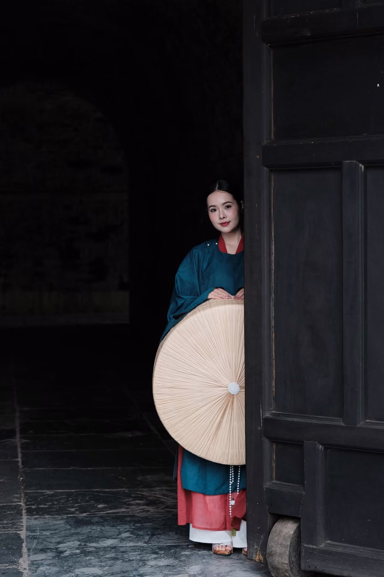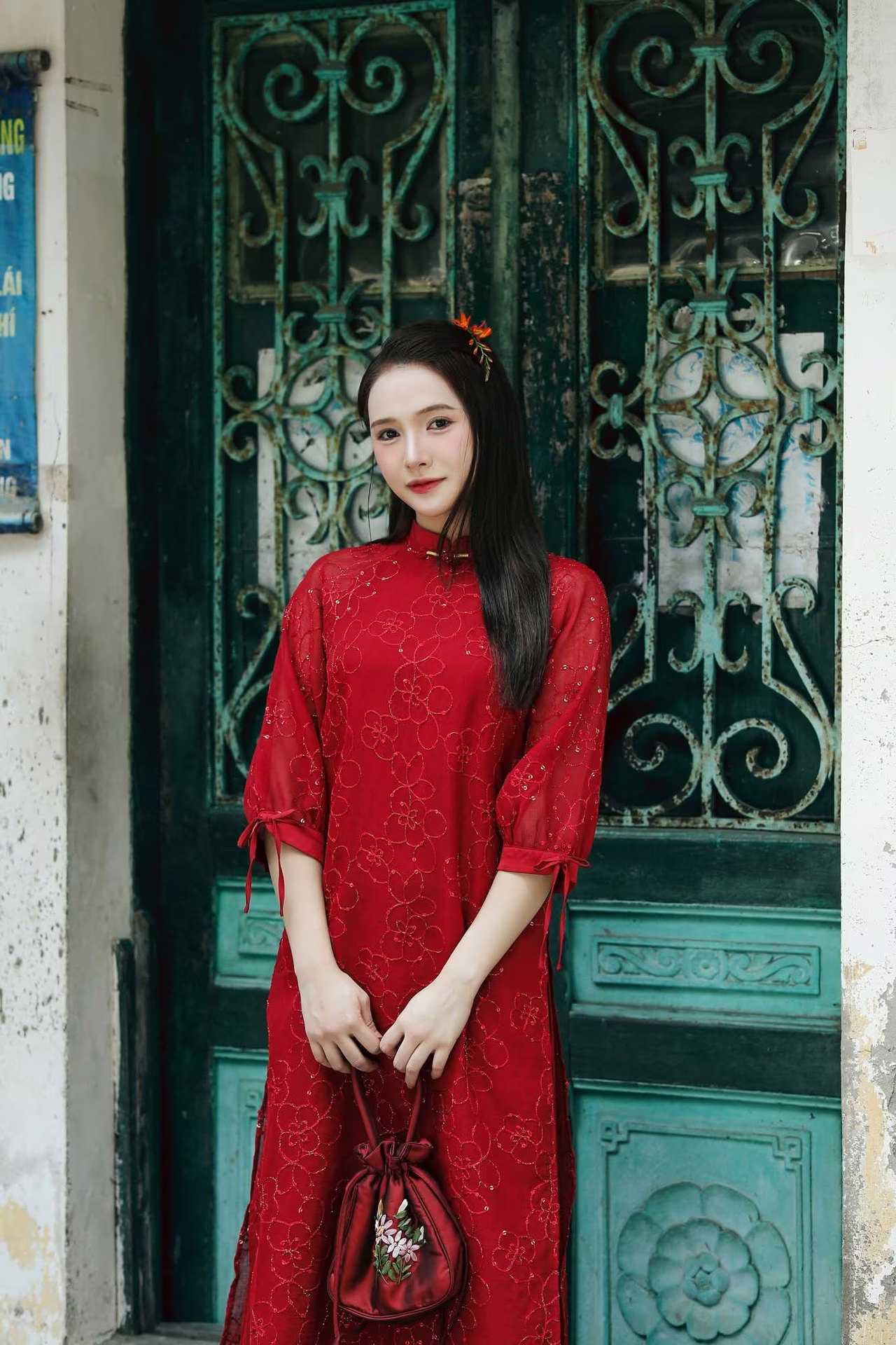 This photograph portrays a woman with captivating East Asian beauty her deep eyes holding many mysteries. Her delicate face elegant makeup and attire echoing traditional influences create a harmonious blend of past and present. The girl stands as a vivid symbol of cultural fusion where classic grace intertwines with a modern confident demeanor. This is not merely a portrait but a narrative about the beauty of Vietnamese people about the essence of traditional culture preserved and shining brightly in the new era sparking curiosity about the story behind each gaze.VGU No.27: Radiant Smile in Red Ao Dai, Capturing Vietnamese Traditional Beauty