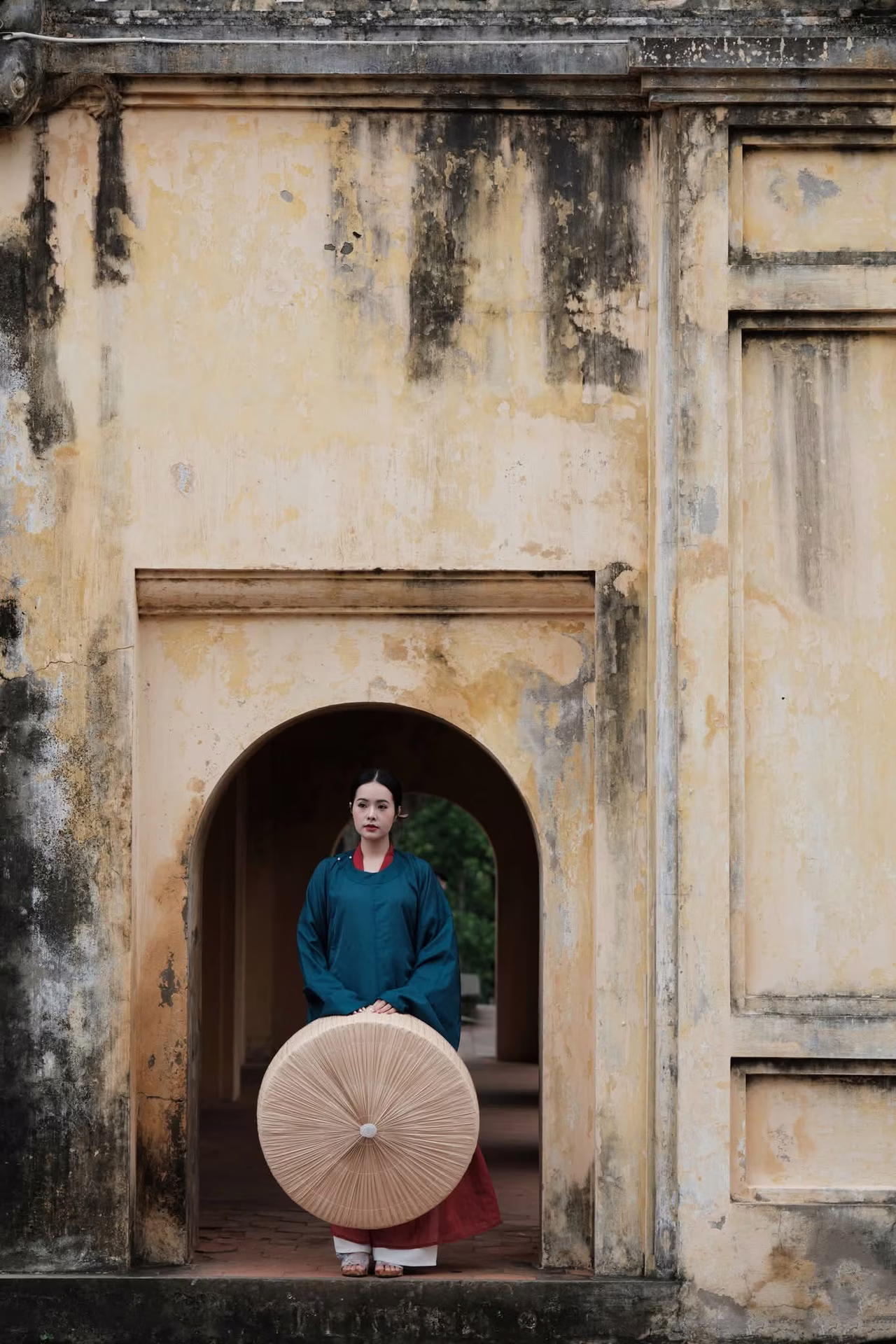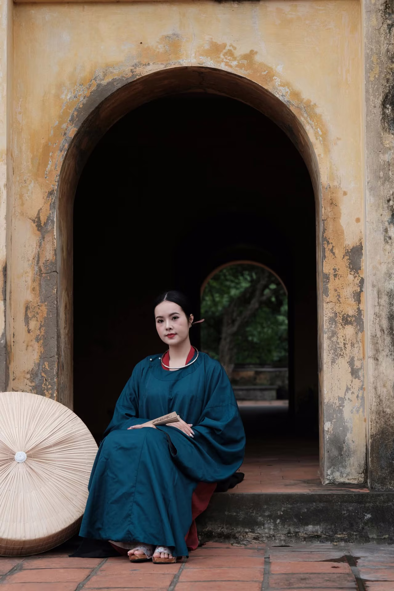 This captivating girl's portrait beautifully captures a sense of pure beauty and profound pensive aura. Soft lighting bathes her delicate features, highlighting her fair skin and elegant contours. Her hair styled in a neat bun, coupled with the minimalist style of her cream-colored attire, accentuates her inherent elegance and gentle demeanor. Her downcast gaze and subtle expression evoke a feeling of deep contemplation and inner beauty that is truly captivating. Delicate shimmering details on her temple add an ethereal touch, transforming this image from a mere moment into an artistic piece brimming with emotion. It represents sophistication and hidden allure, sparking curiosity about the story behind her enigmatic gaze. #Vietnamese #pretty #charmVGU No.36: Discover the serene beauty of a Vietnamese woman in traditional attire