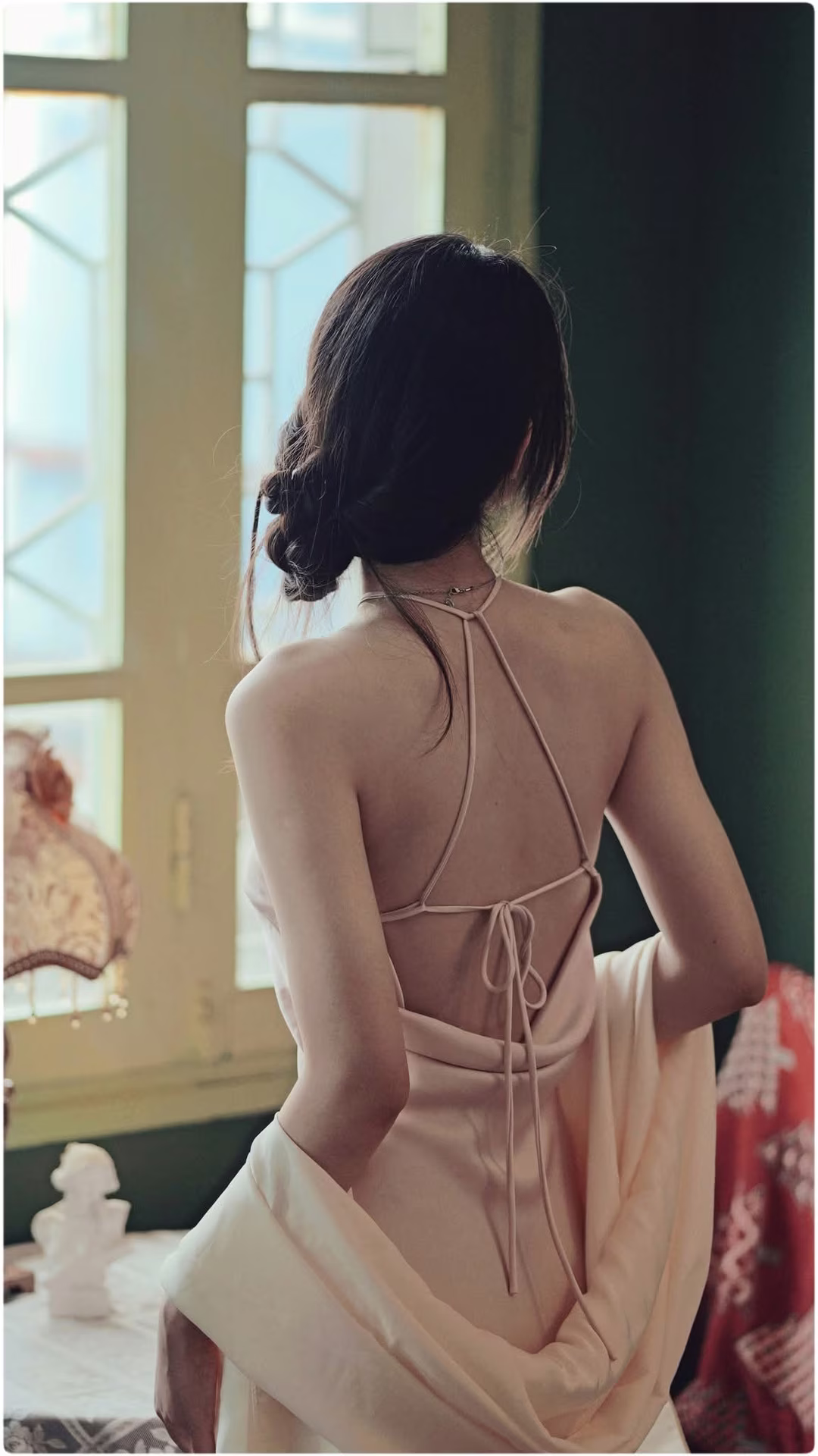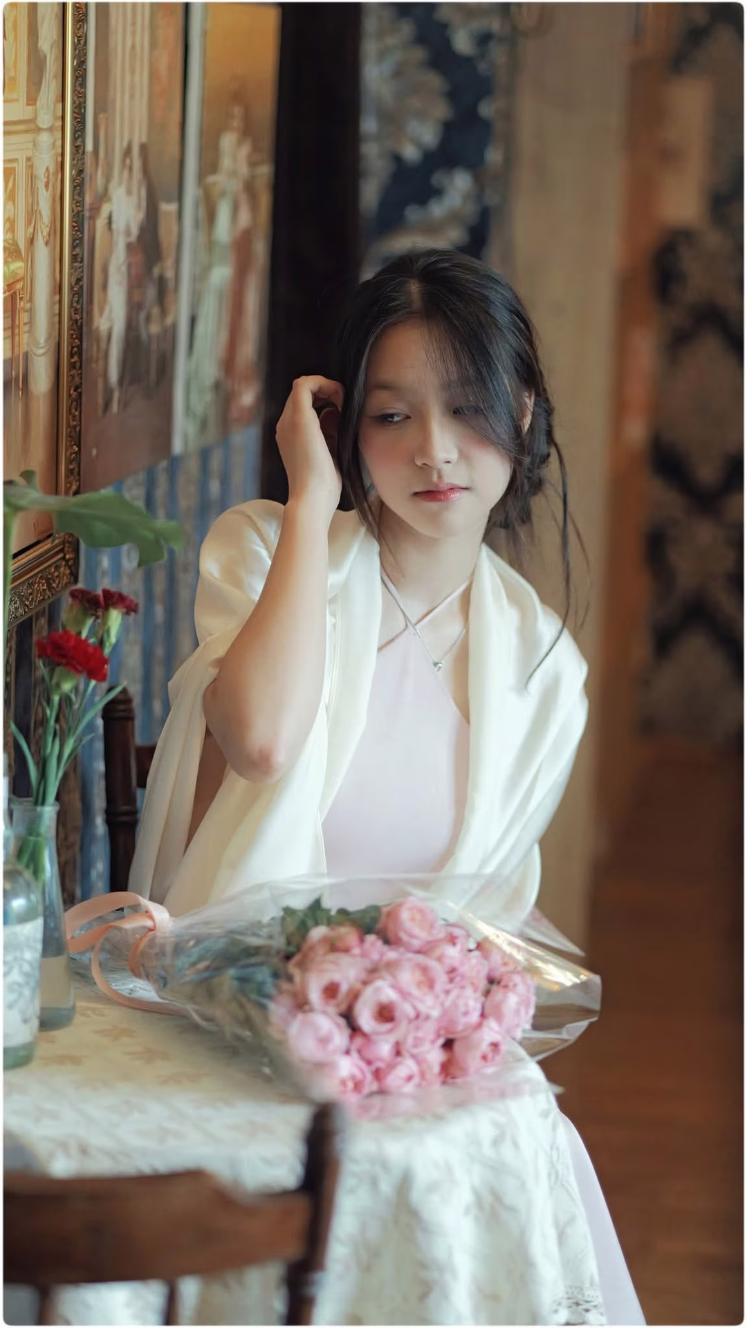 The VGU No34 image captures the serene and gentle elegance of a young Asian woman. Dressed in a delicate pink silk slip dress she subtly reveals her bare shoulders and slender back creating an alluring yet refined silhouette. Her dreamy gaze and neatly tied hair exude grace and sophistication. The classic backdrop bathed in warm soft lighting further enhances her profound inner beauty. This is more than just a portrait it is an artistic moment preserving the timeless youth and charm of an Oriental muse. The photograph invites viewers to contemplate a pure and deeply emotional aesthetic. #Vietnamese #pretty #charmVGU No.34: Elegant Vietnamese Woman Amidst Pristine White Lilies