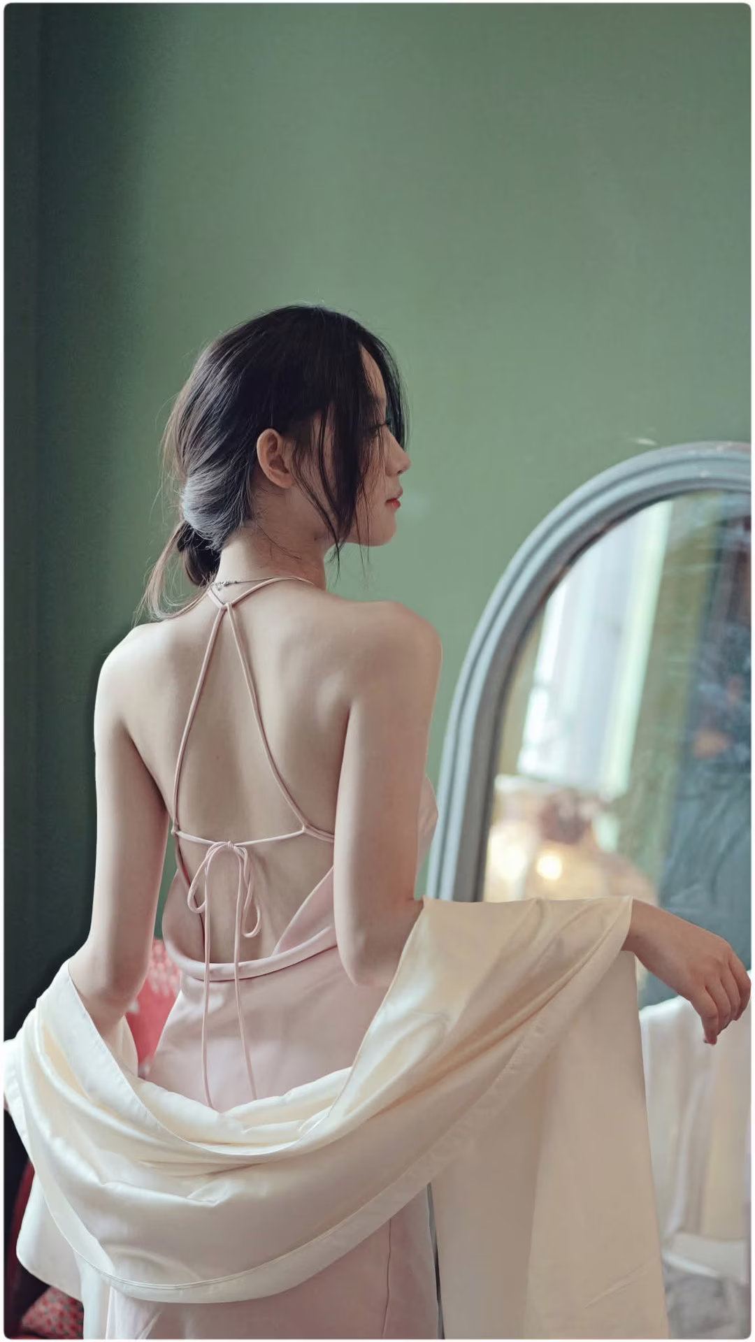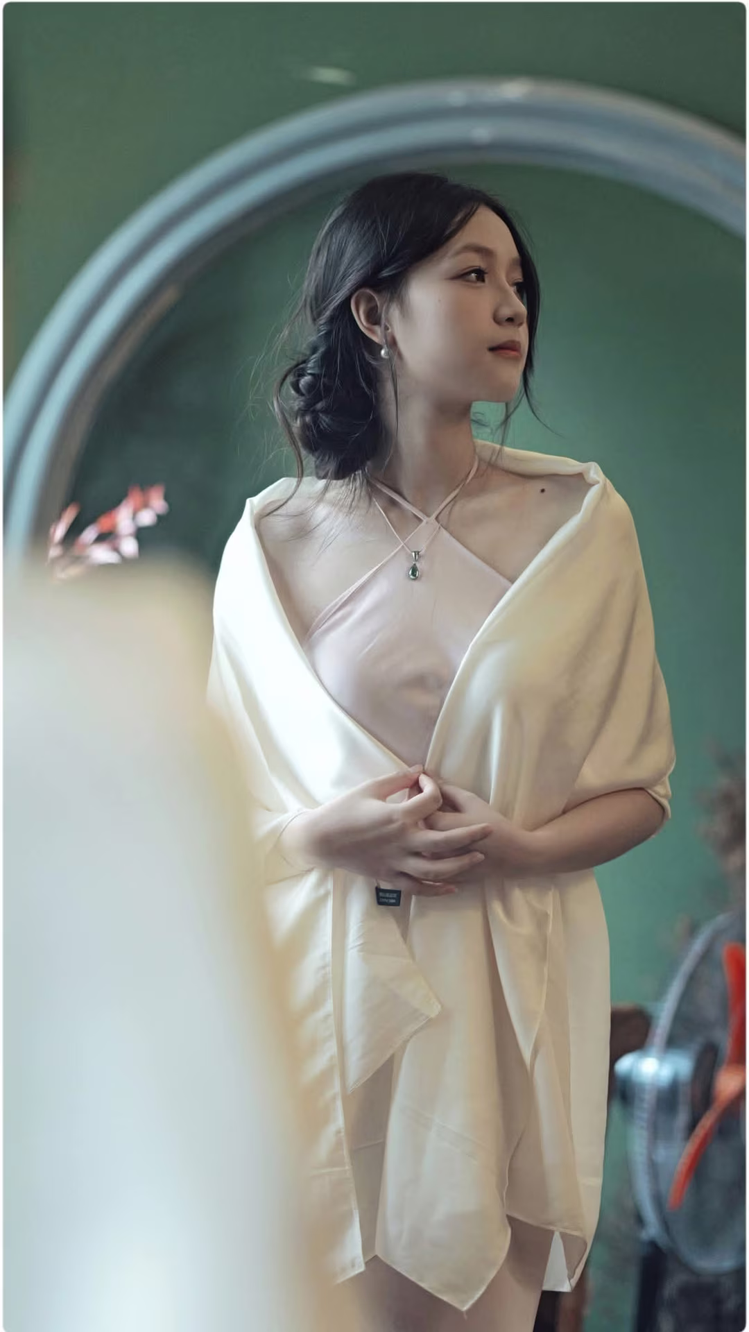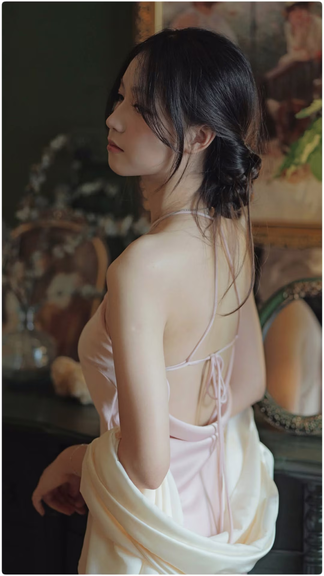 This stunning VGU No.35 image captures the pure and graceful beauty of a young woman. With her dark hair adorned by a delicate flower, she gently holds a fresh bouquet of soft-hued blooms. Her gaze is tender and dreamy, as if lost in thought amidst the lush, peaceful garden setting. Her pristine white dress further enhances her ethereal and refined appearance, creating a truly poetic image. This is a serene, dreamy moment where natural beauty and a pure soul perfectly intertwine. More than just a portrait, this photograph tells a story of quiet contemplation and inherent charm, evoking romantic feelings and admiration for East Asian elegance. #Vietnamese #pretty #charmVGU No.34: Captivating Asian Muse: Serene Beauty in a Delicate Pink Slip Dress