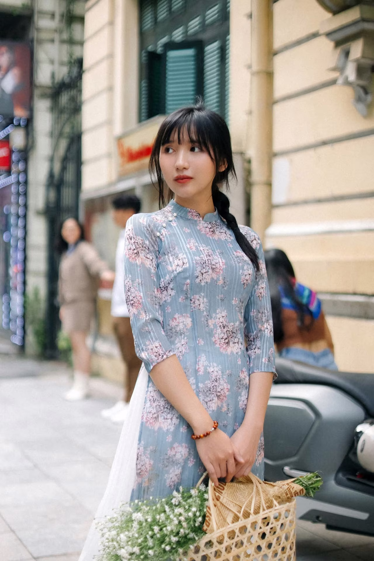 This stunning VGU No.19 image beautifully captures a graceful young Vietnamese woman in a traditional Ao Dai, adorned with delicate floral patterns, amidst the bustling city. Our muse, elegantly dressed, holds a basket of fresh flowers, exuding a gentle and pure beauty. From her distant gaze to her subtle smile, everything radiates a pristine East Asian charm. This is more than just a girl's portrait; it is a vibrant symbol of Vietnamese culture. The Ao Dai and the small white flowers blend perfectly, creating a serene and romantic moment. She stands like a blooming flower amidst the city's hustle and bustle, offering a sense of peace and nostalgia. #Vietnamese #pretty #charmVGU No.18: Captivating Elegance A Young Woman in Pink Ao Dai