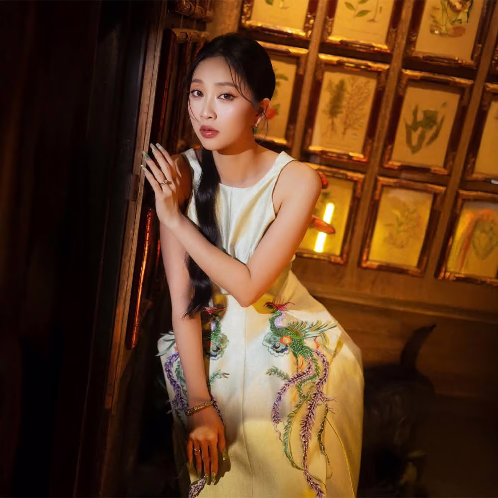 This stunning photograph captures a young woman exuding gentle beauty and refined elegance. She is adorned in a sophisticated ivory-white sleeveless dress, featuring a soft cowl neck design that gracefully highlights her slender shoulders and graceful figure. Her hair is neatly styled in an updo, complemented by sparkling earrings, creating an overall look of luxury and class. A romantic touch is added by the delicate bouquet of small pink roses she lovingly holds, symbolizing purity and affection. Her gaze, directed slightly away, carries a dreamy and serene quality, as if lost in a moment of quiet contemplation. This is more than just a portrait; it is an artistic capture where natural beauty harmonizes with exquisite style, captivating the viewer. The woman radiates an ethereal charm, evoking the image of a bride on her happiest day. #Vietnamese #pretty #charmVGU No.10: Captivating Elegance and Allure in a Mystical Studio Light