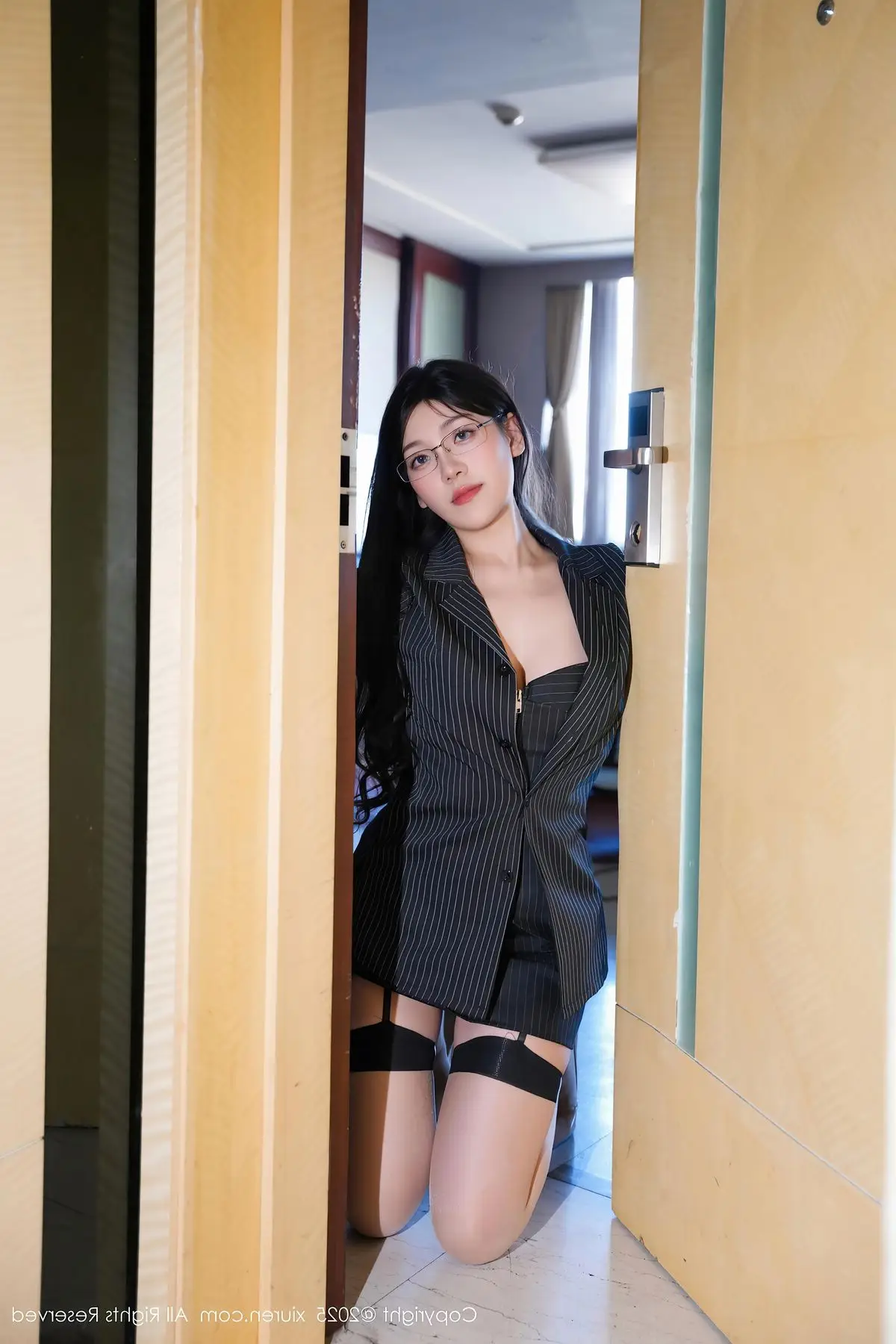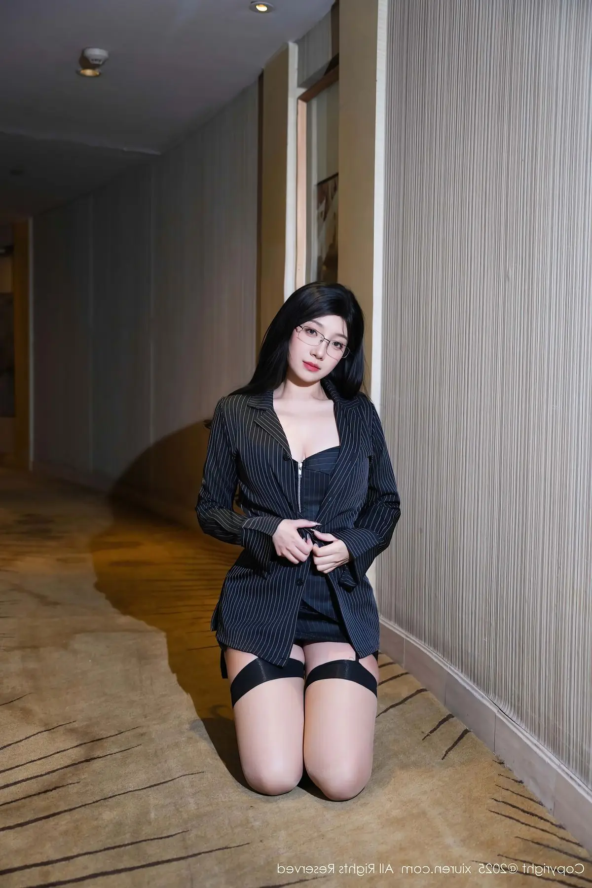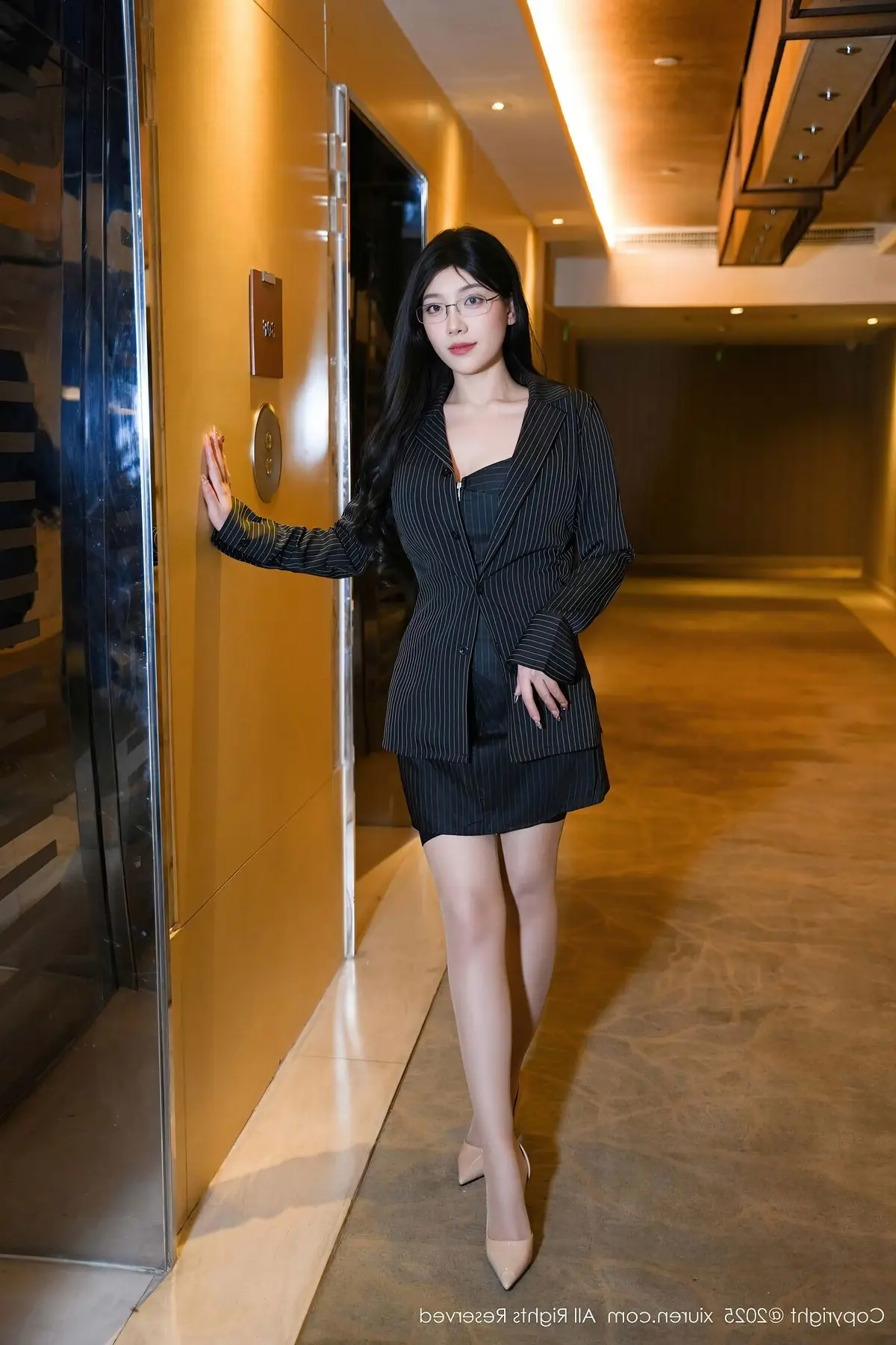 Mei You appears captivating in her elegant black OL outfit. The stylish blazer paired with a chic short skirt accentuates her slender figure. Her eyes behind the glasses exude intelligence and professionalism, yet subtly hint at an undeniable allure. She poses confidently against a warm yellow wall, creating a scene that is both modern and luxurious. Every detail, from her attire to her demeanor, showcases Mei You's unique confidence and distinct style. This collection is not merely a fashion shoot but an exploration of the multifaceted beauty of the modern woman, powerful, strong, and utterly captivating, drawing all eyes.#XiuRen #MeiYou #BlackOLStyle #OfficeFashion #ProfessionalBeauty #AsianModel #OL