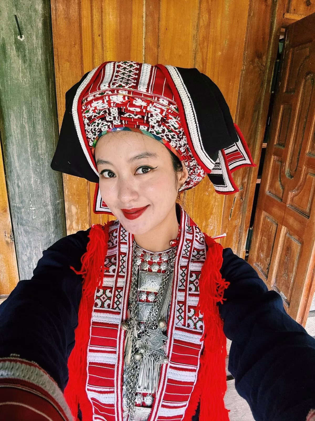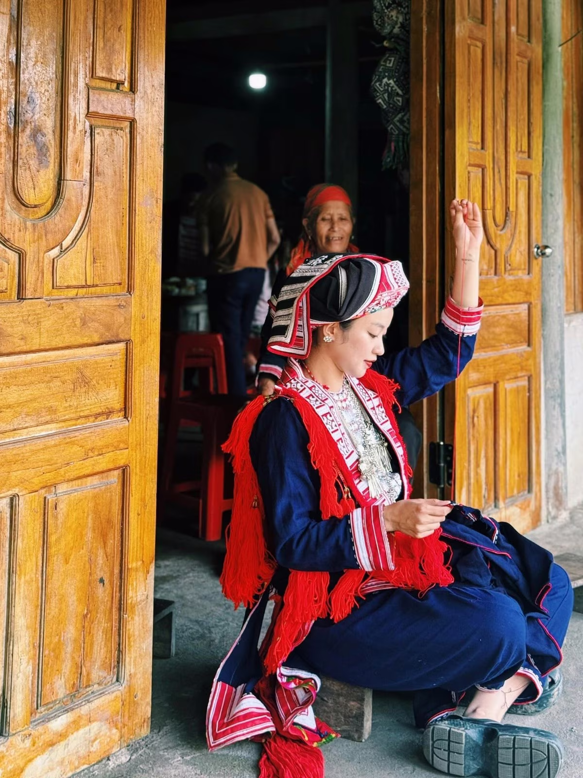 This image captures a graceful moment of Mi Van in the traditional attire of a Red Dao girl. She is meticulously engaged in handicraft work demonstrating her deep immersion into the ethnic cultural beauty of the highlands. This exploratory trip is not just a journey to experience the scenery but also an opportunity for Mi Van to share impressive images of the local people's life and traditions. The beauty of the former Hanoi hot girl donning Red Dao clothing has captivated many fans who admire her cultural appreciation and simplicity. This is truly a meaningful journey honoring the unique cultural values of Vietnam.