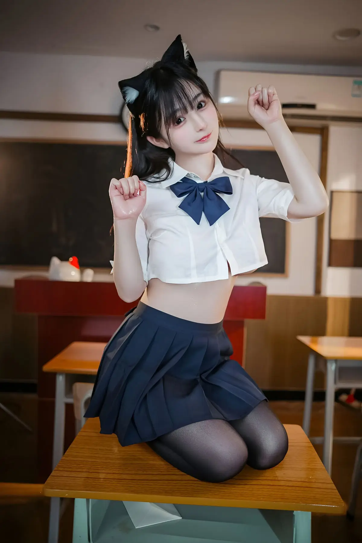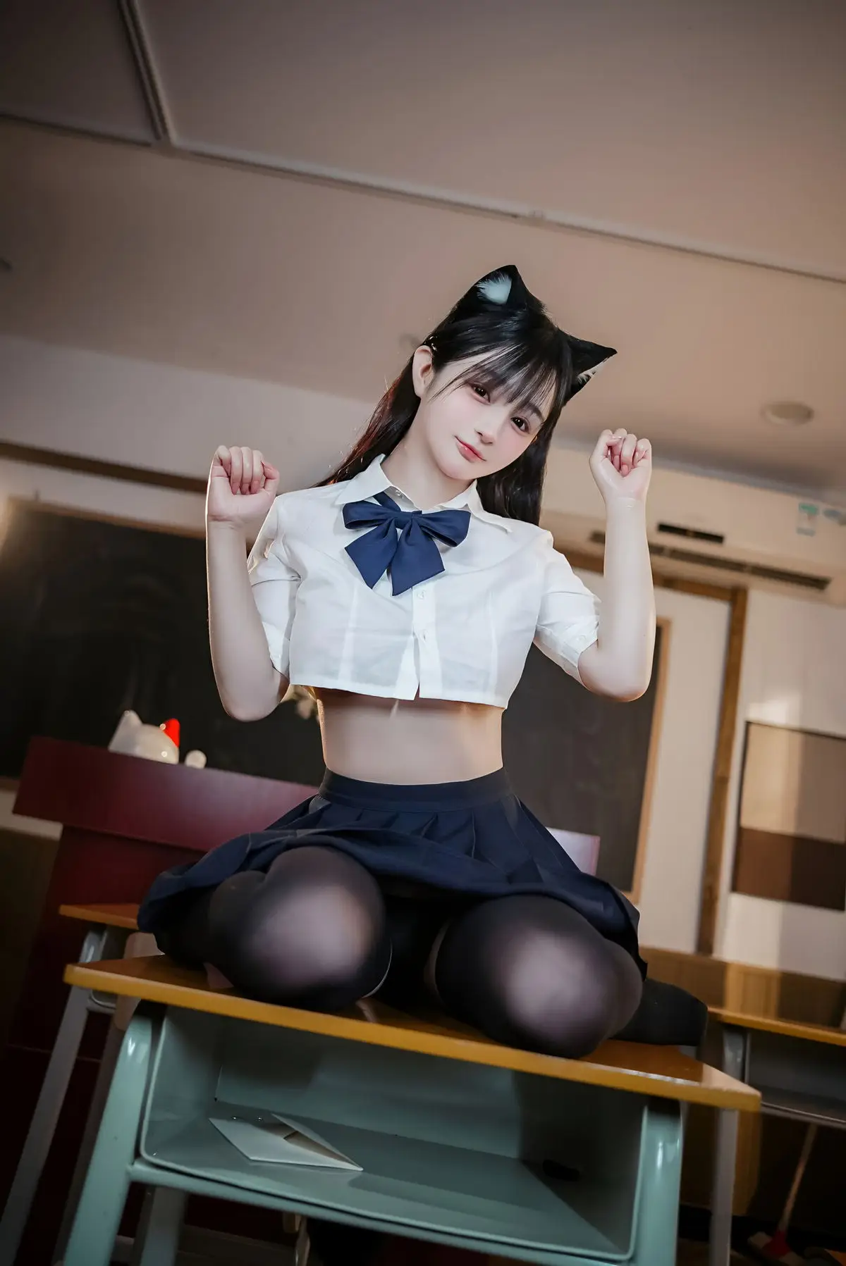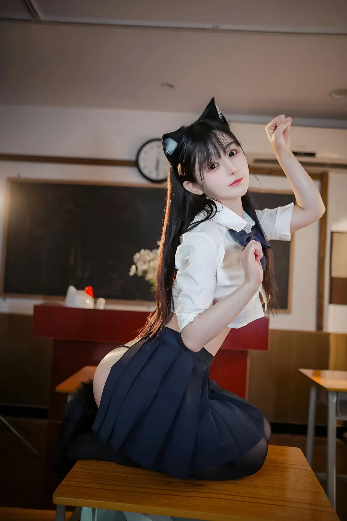 Discover the enchanting photo collection of Coser Sakurai Ningning embodying the JK Nekomimi Part02 theme. Set in a familiar classroom backdrop the model dons a traditional Japanese school uniform adorned with playful cat ears creating a look that is both innocent and alluring. With her long flowing dark hair and large expressive eyes Sakurai Ningning exudes confidence and grace. Her pose on the school desk combined with a direct gaze conveys a mischievous and uniquely captivating charm. This series not only showcases creative cosplay but also celebrates the youthful beauty of the girl in this distinctive attire. Each image tells a story of a harmonious blend of cuteness and subtle allure leaving viewers captivated.