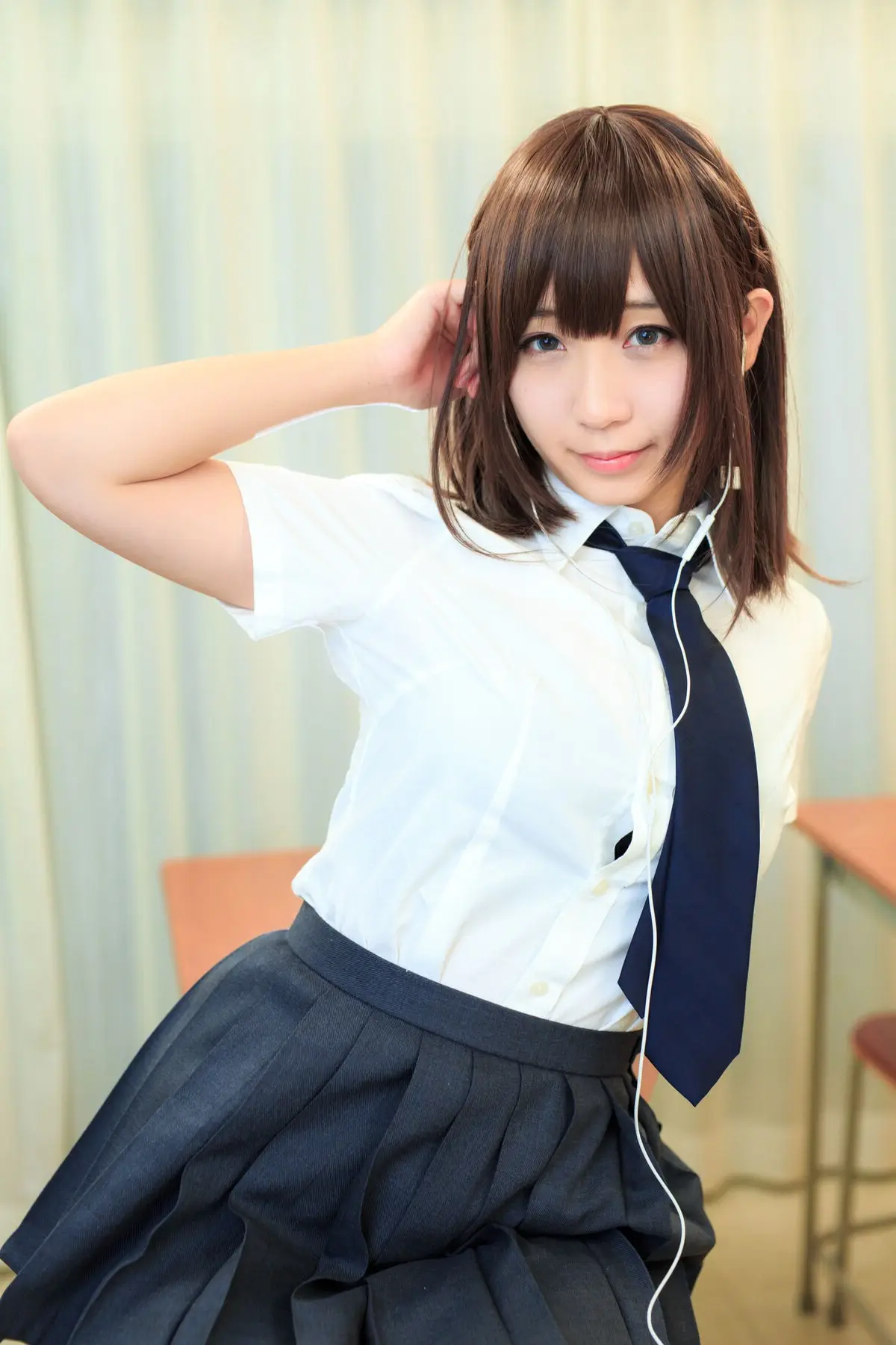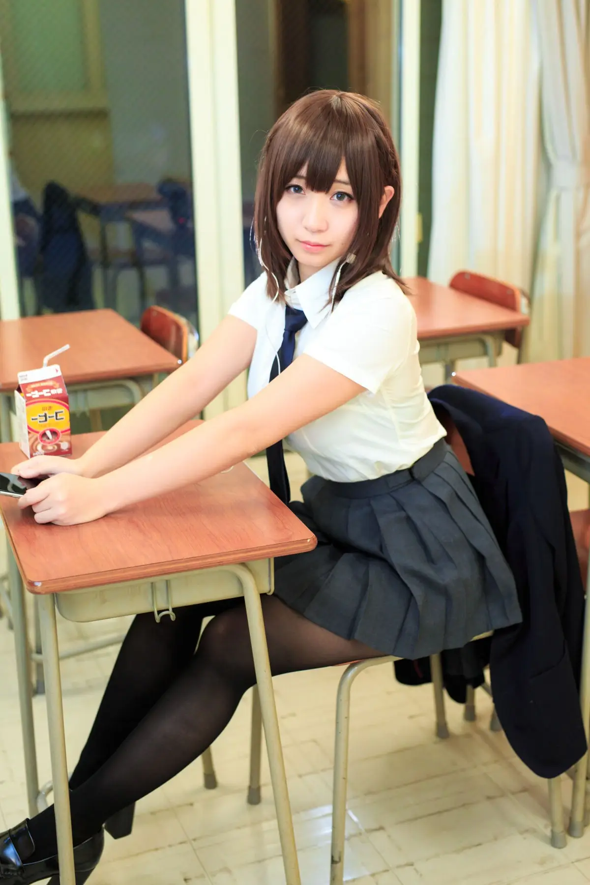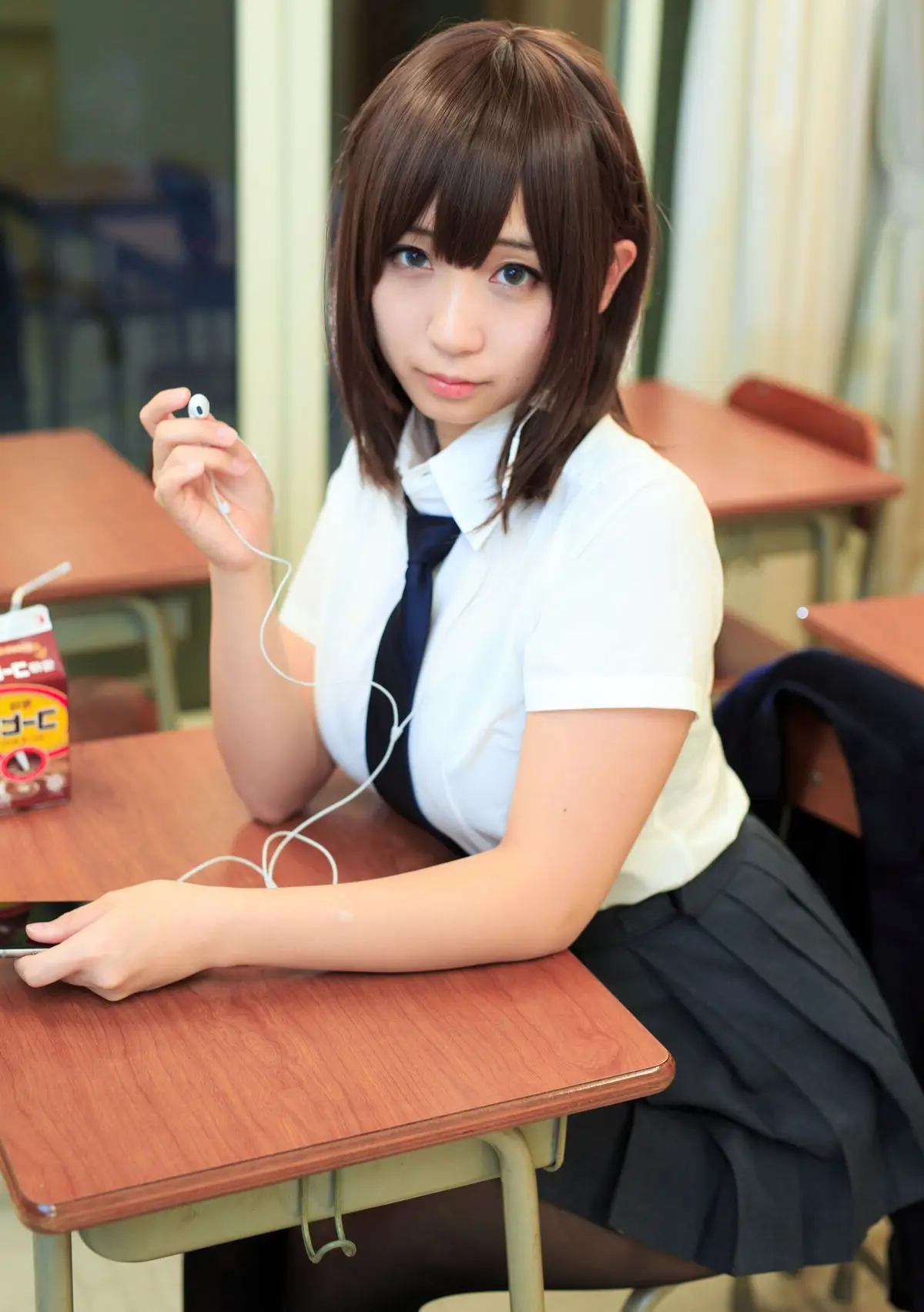 This captivating image captures a moment of youthful charm with Moe Iori (伊織萌) in a classic school uniform. Seated at a wooden desk her neatly styled short hair and tie create an energetic yet innocent look. Her gaze holds a touch of contemplation evoking the image of a schoolgirl lost in her thoughts perhaps during a break or after a demanding class. The blend of her natural beauty and the school setting offers an authentic relatable portrayal of "Monday's Child" (月曜日のあの子). Every detail from the earbud to the drink on the desk contributes to a vivid snapshot of student life inviting viewers to appreciate this serene scene.
