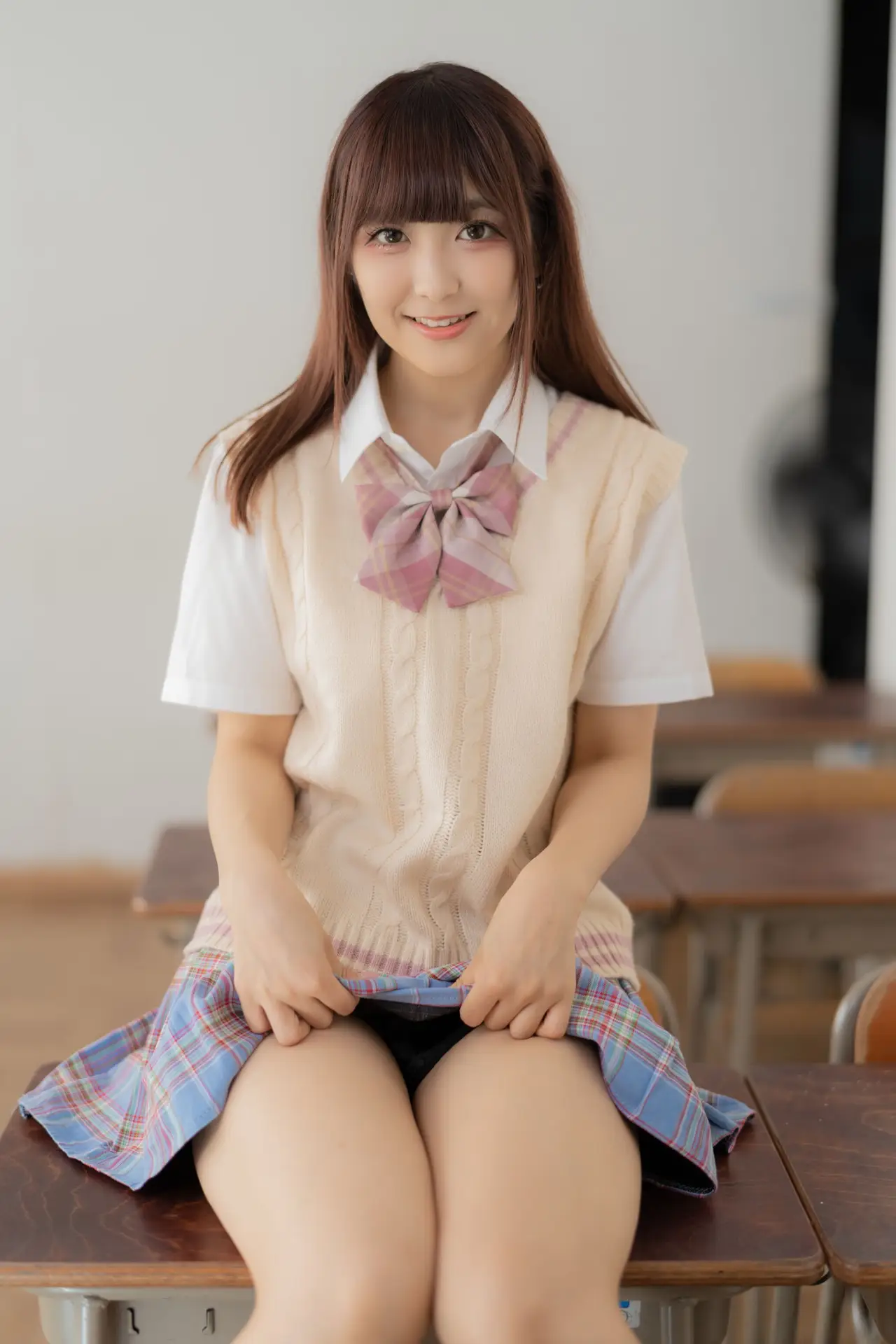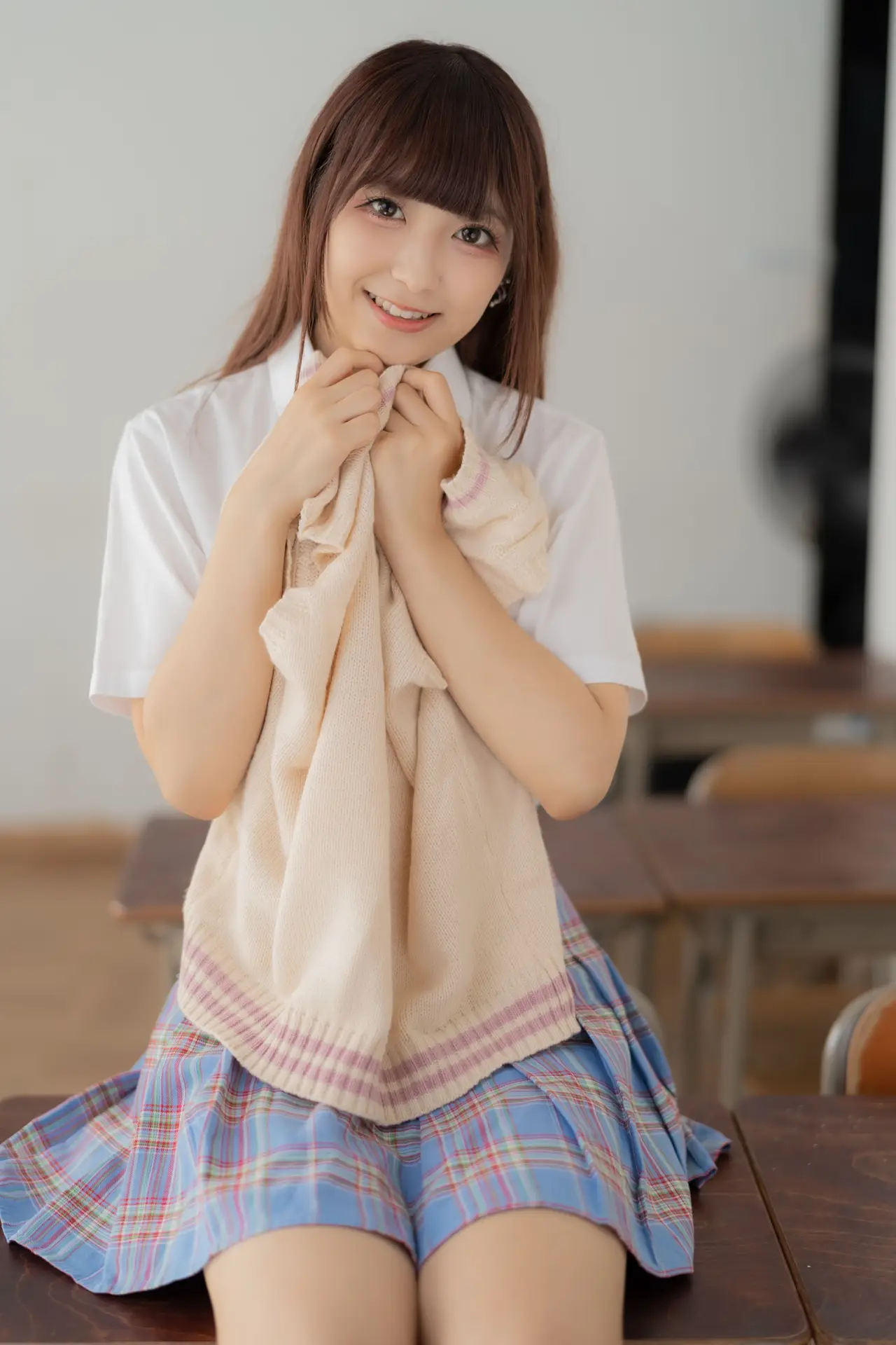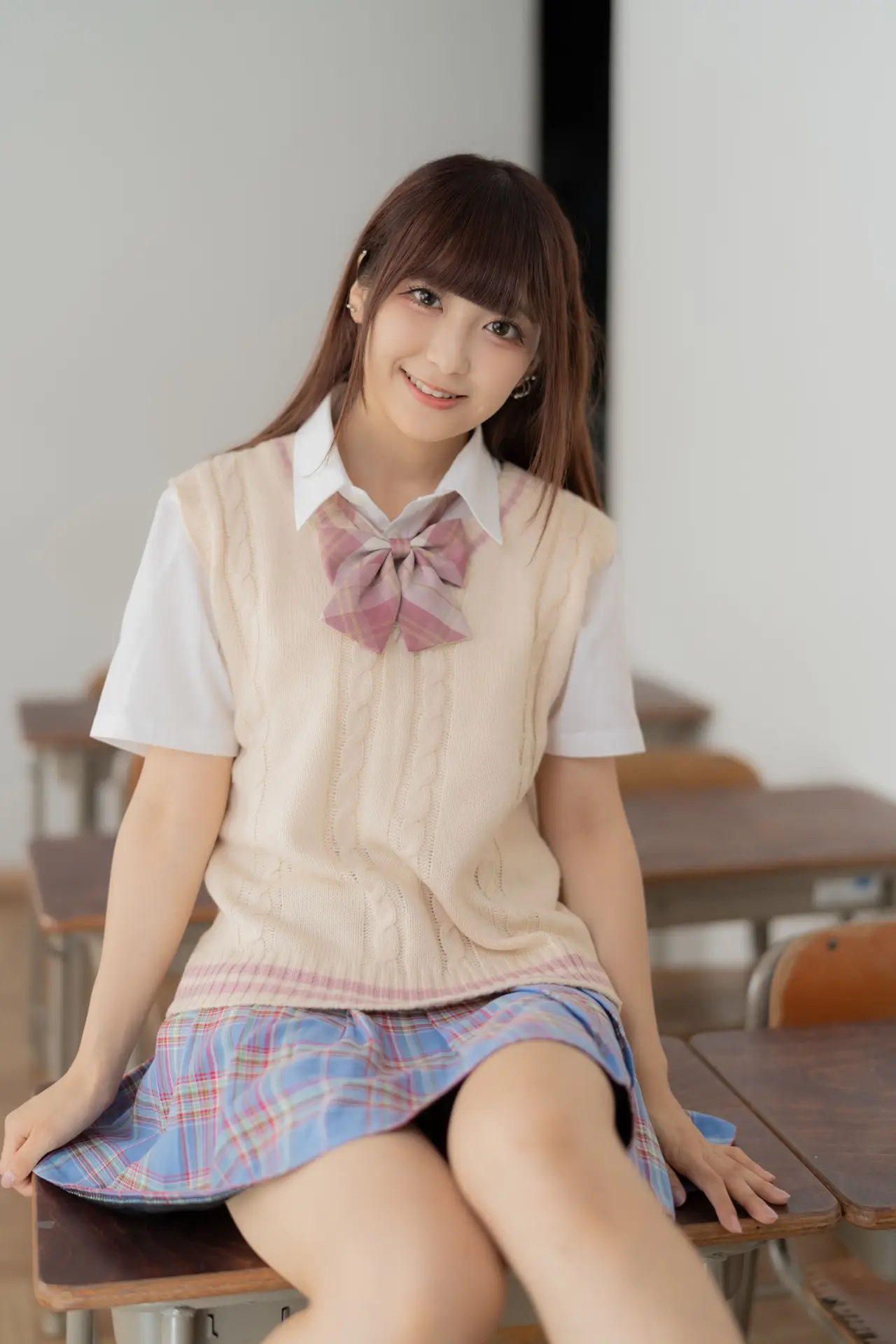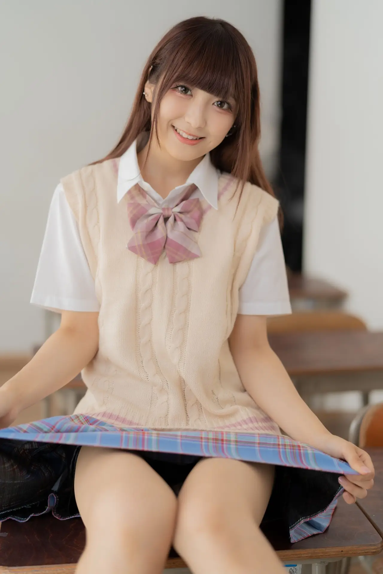 Ai Takanashi radiates a pure and sweet charm, beautifully captured in her classic school uniform. This youthful model gracefully showcases her vibrant energy as she sits casually on a school desk, her gentle eyes meeting the camera. Her ensemble of a crisp white shirt, a cozy beige knit vest, and a stylish pink and blue plaid skirt perfectly embodies a fresh academic aesthetic. This captivating portrait evokes nostalgic feelings of innocence and the exhilarating spirit of student life. Ai Takanashi truly represents the endearing allure of schoolgirl elegance, a delightful vision of youthful grace.