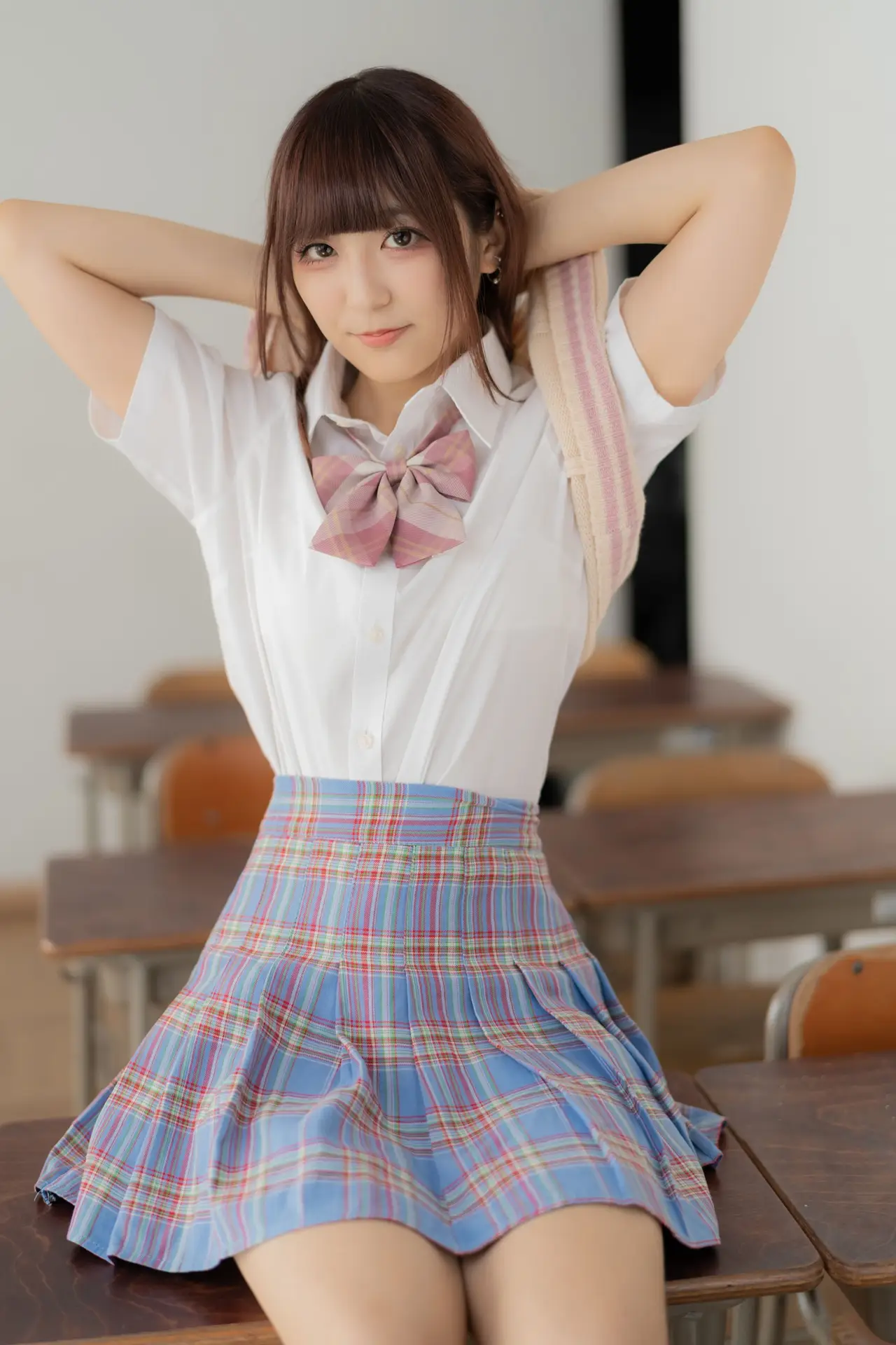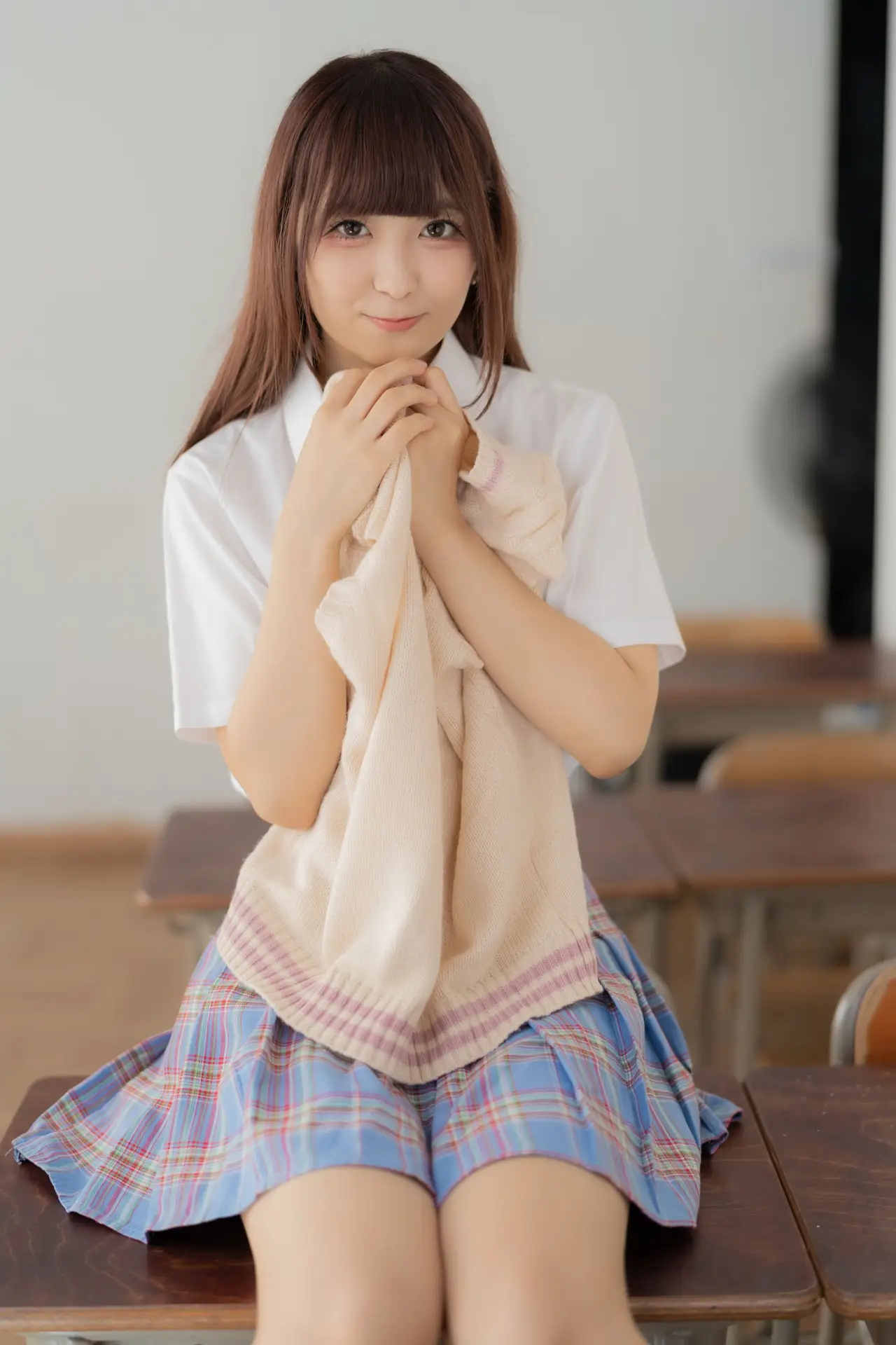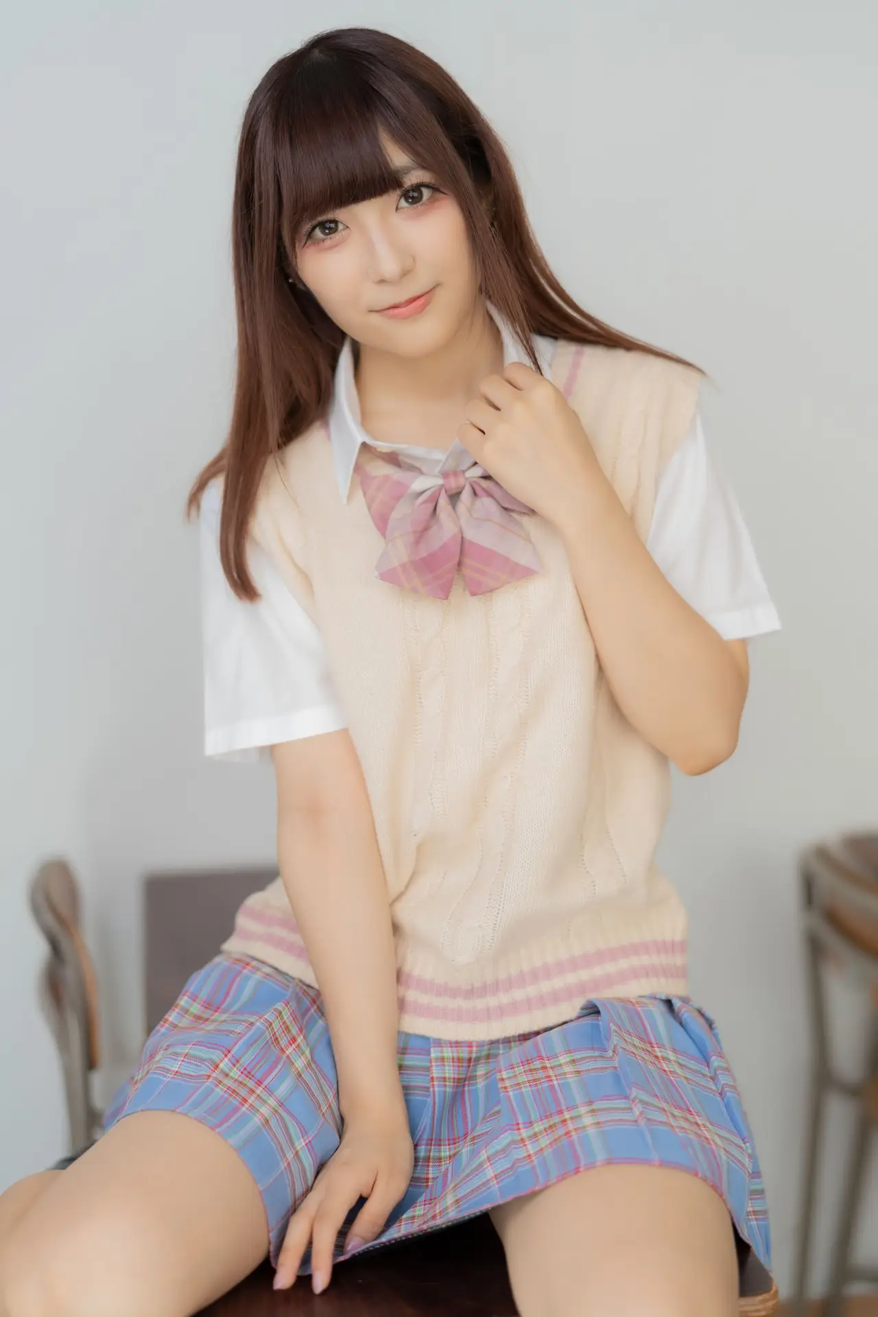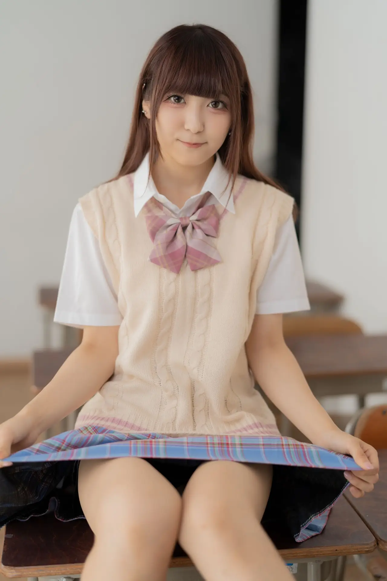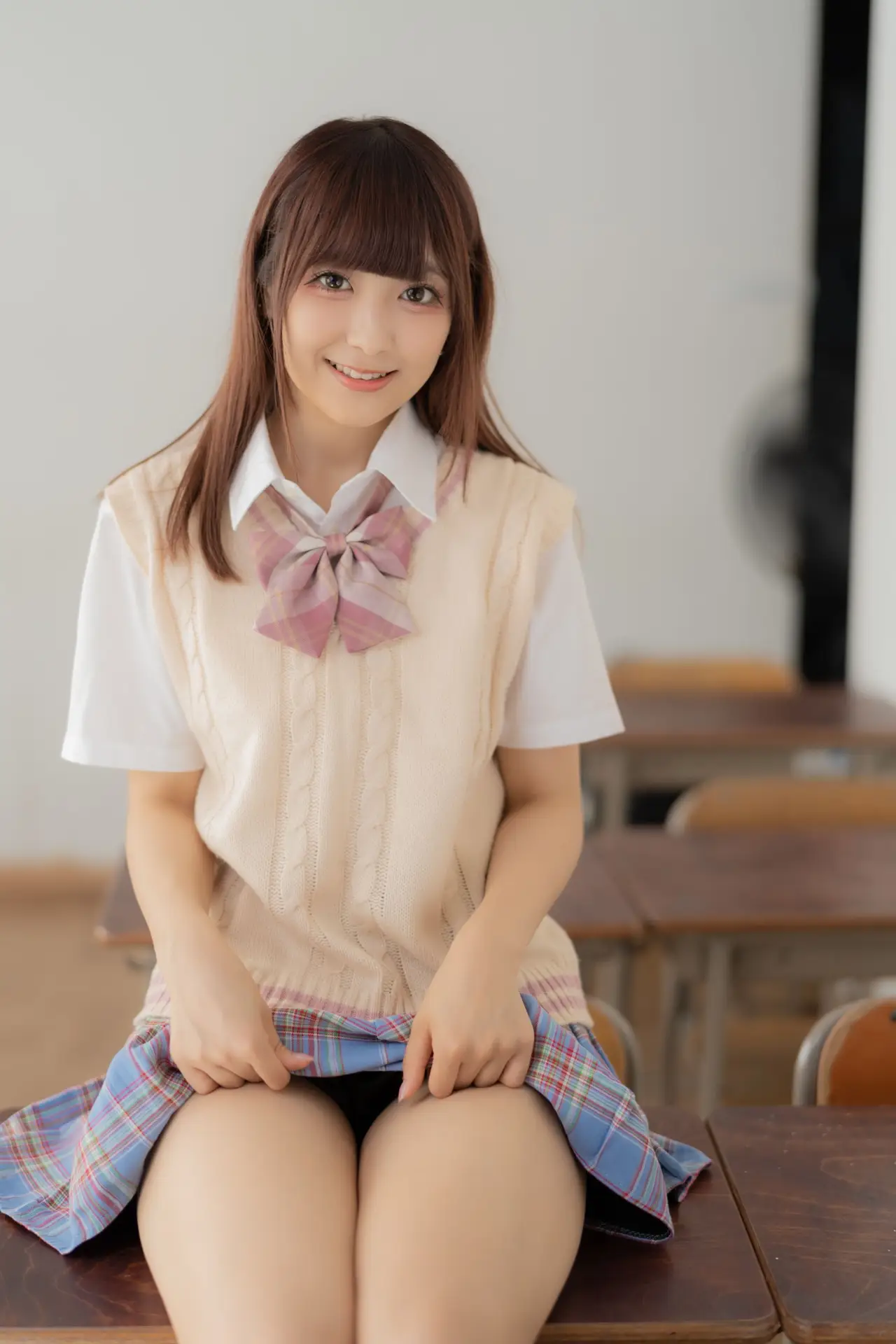 Ai Takanashi radiates a pure and sweet charm, beautifully captured in her classic school uniform. This youthful model gracefully showcases her vibrant energy as she sits casually on a school desk, her gentle eyes meeting the camera. Her ensemble of a crisp white shirt, a cozy beige knit vest, and a stylish pink and blue plaid skirt perfectly embodies a fresh academic aesthetic. This captivating portrait evokes nostalgic feelings of innocence and the exhilarating spirit of student life. Ai Takanashi truly represents the endearing allure of schoolgirl elegance, a delightful vision of youthful grace.
