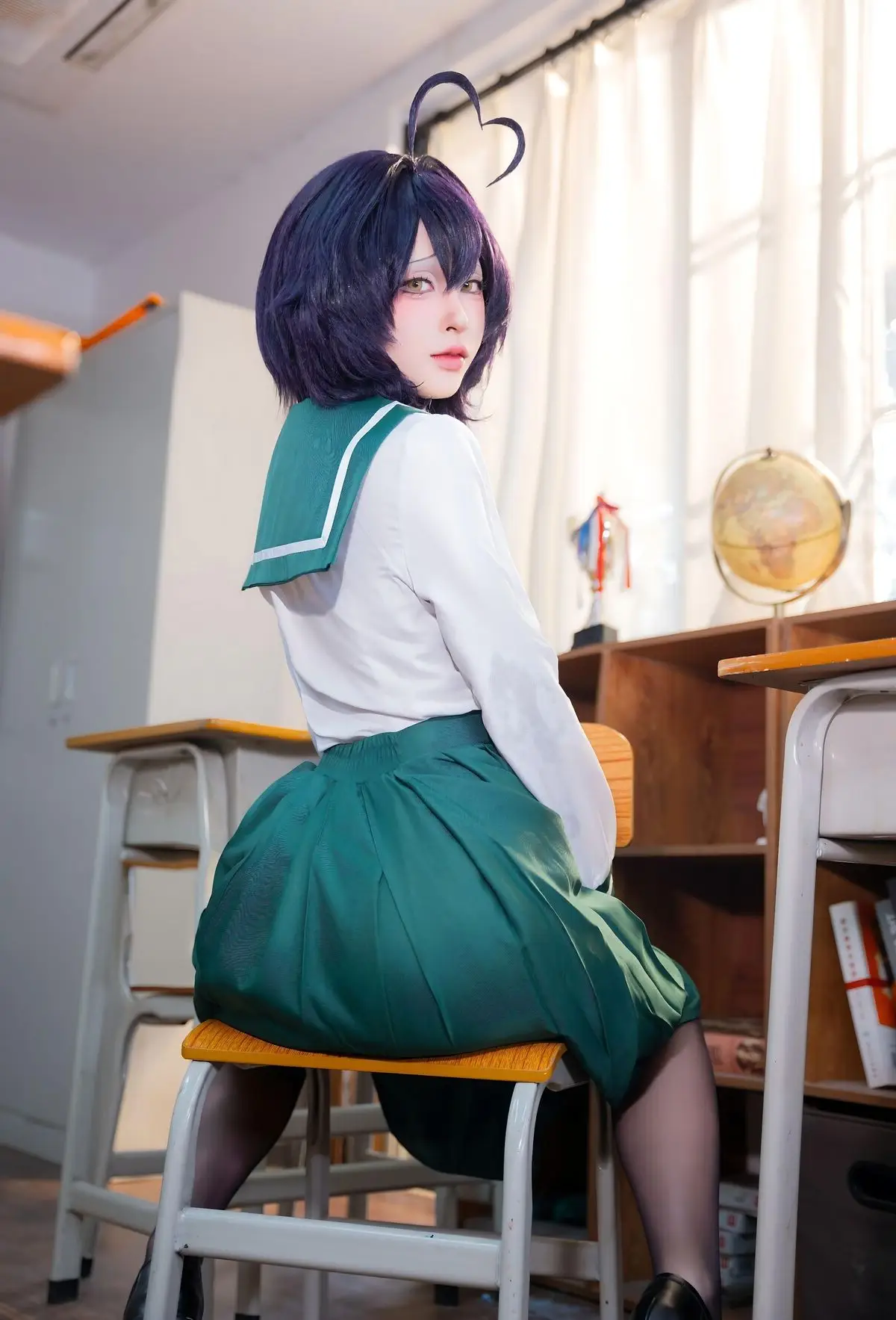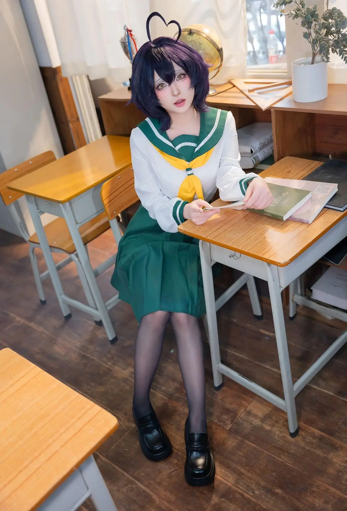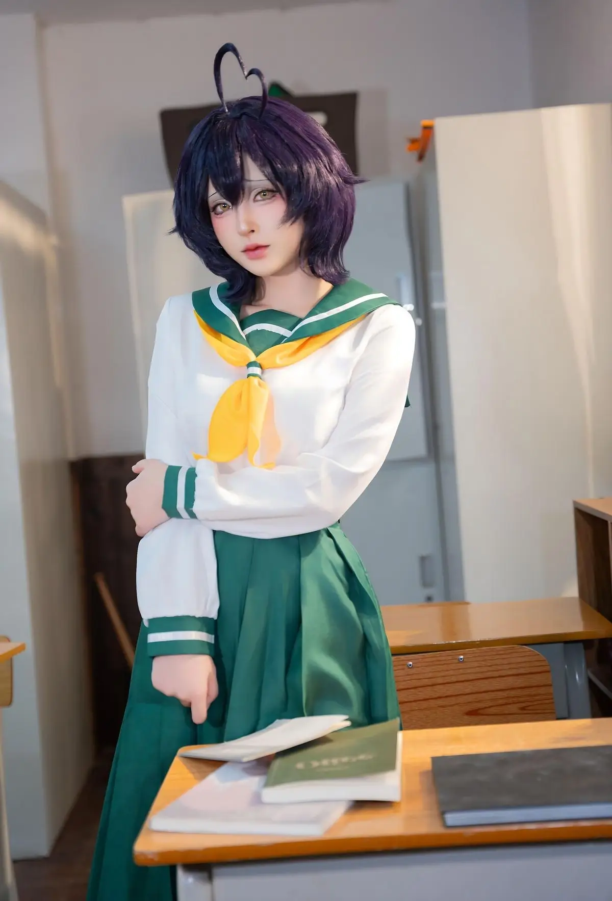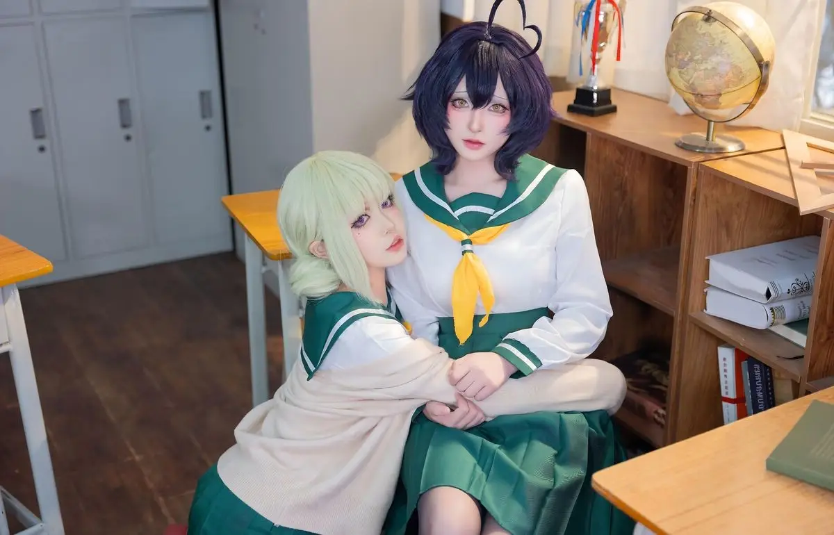 In this photoshoot, cosplayer Qing Shui You Nai brings to life a vibrant rendition of Utena Hiiragi in her iconic JK school uniform from the Gushing over Magical Girls series. The images focus on Qing Shui You Nai showcasing her expressive wide eyes and distinctive purple hair perfectly capturing Utena Hiiragi's innocent yet captivating charm. The Japanese school uniform featuring a white shirt yellow tie and pleated green skirt is meticulously detailed highlighting a youthful school aesthetic. A simple classroom setting with desks books and a trophy creates an intimate and authentic backdrop. Each photo radiates the character's pure and adorable essence while also demonstrating Qing Shui You Nai's impressive cosplay talent and natural charisma. This collection is a must-see for anime and cosplay enthusiasts especially fans of Gushing over Magical Girls.