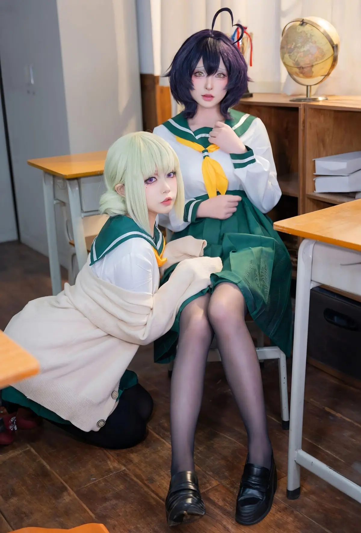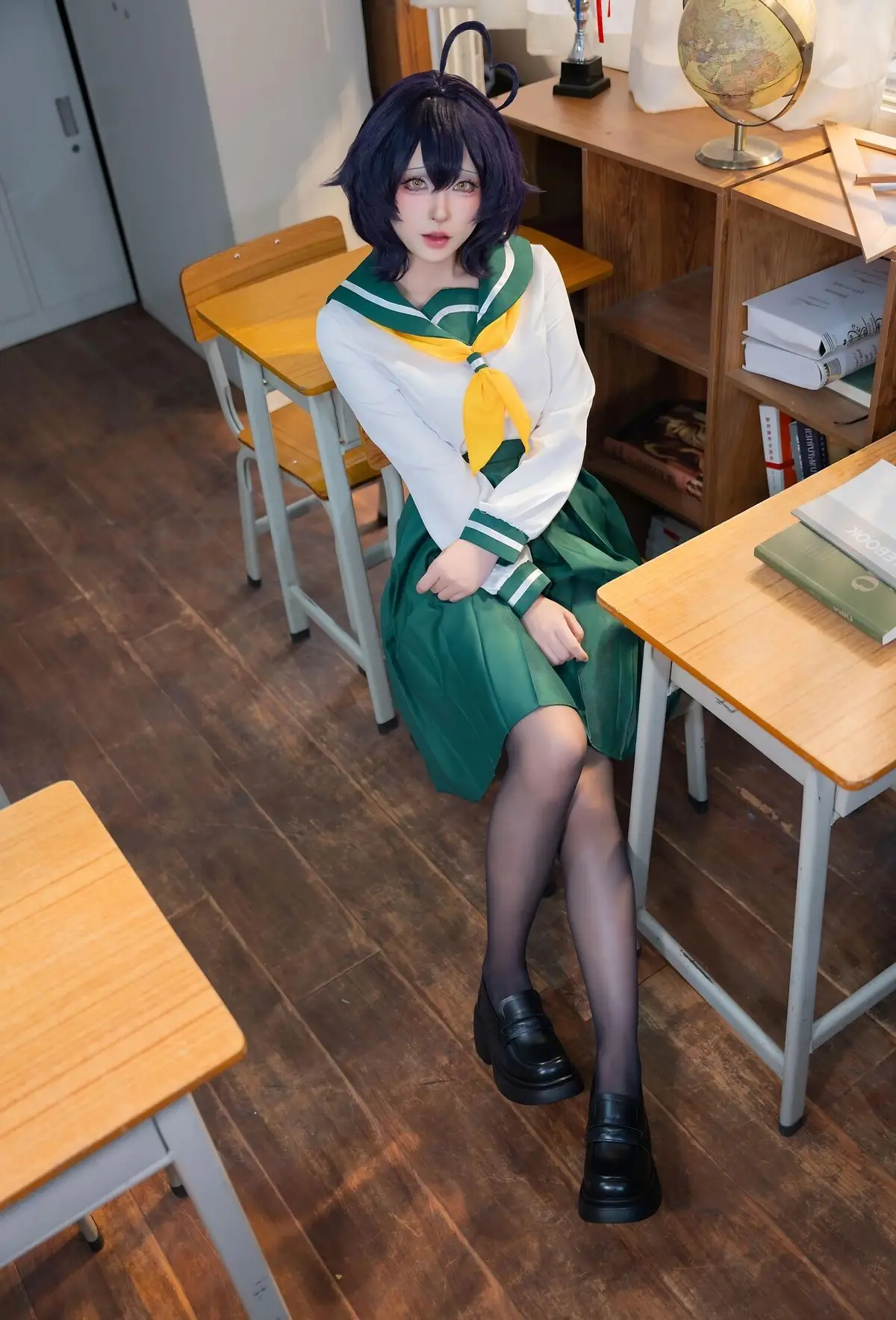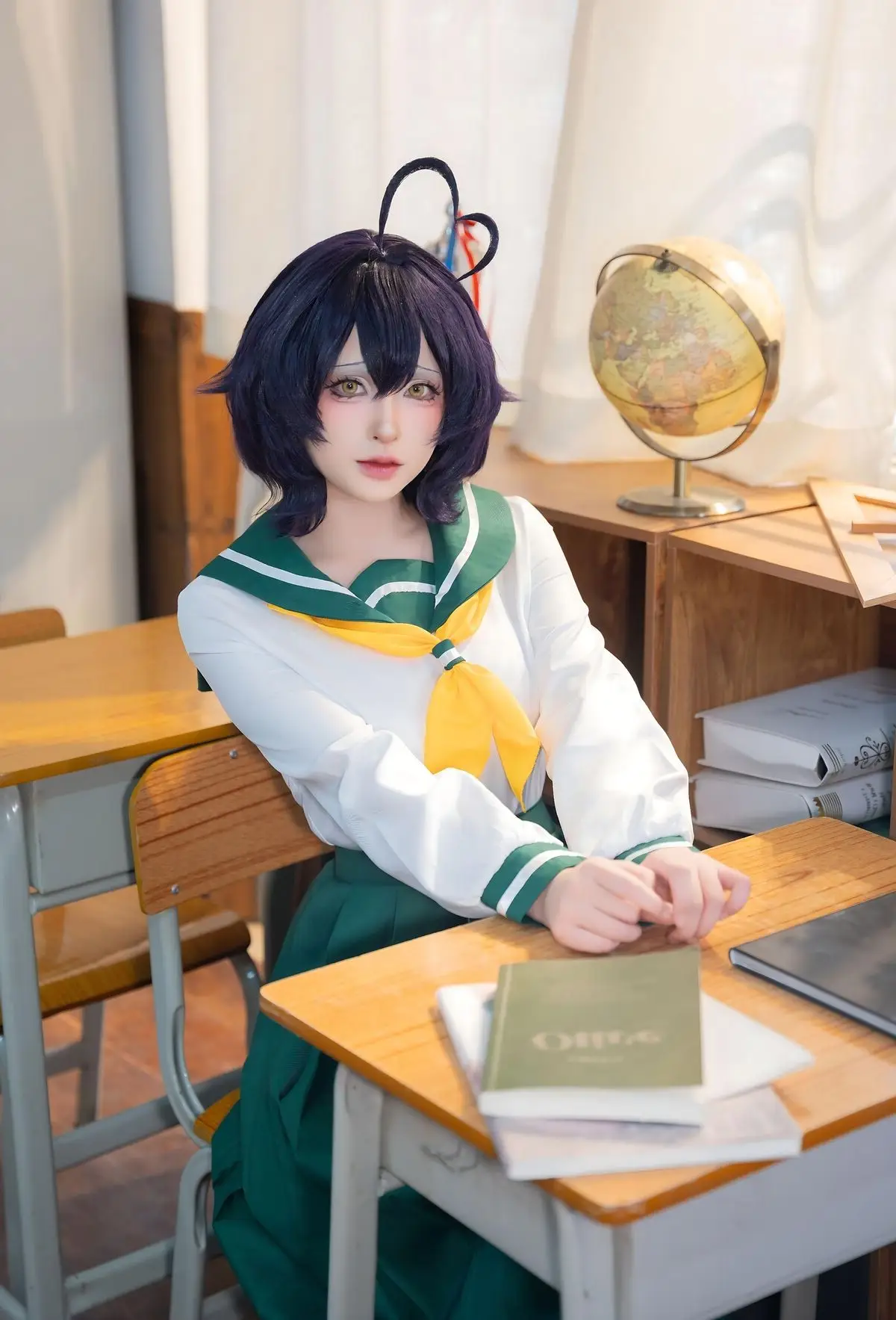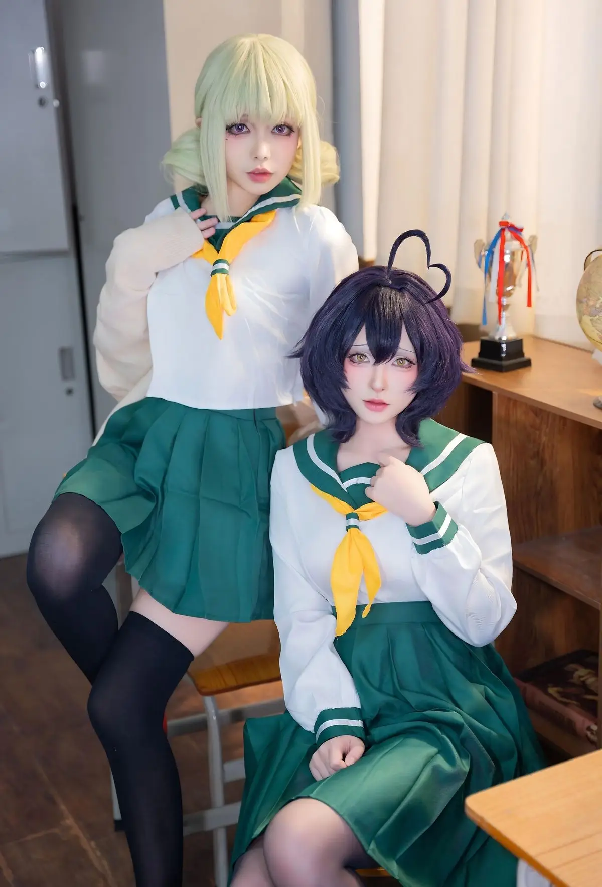 In this photoshoot, cosplayer Qing Shui You Nai brings to life a vibrant rendition of Utena Hiiragi in her iconic JK school uniform from the Gushing over Magical Girls series. The images focus on Qing Shui You Nai showcasing her expressive wide eyes and distinctive purple hair perfectly capturing Utena Hiiragi's innocent yet captivating charm. The Japanese school uniform featuring a white shirt yellow tie and pleated green skirt is meticulously detailed highlighting a youthful school aesthetic. A simple classroom setting with desks books and a trophy creates an intimate and authentic backdrop. Each photo radiates the character's pure and adorable essence while also demonstrating Qing Shui You Nai's impressive cosplay talent and natural charisma. This collection is a must-see for anime and cosplay enthusiasts especially fans of Gushing over Magical Girls.