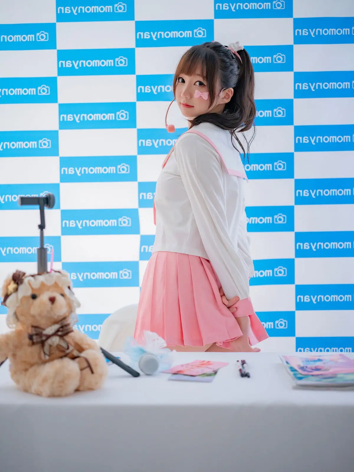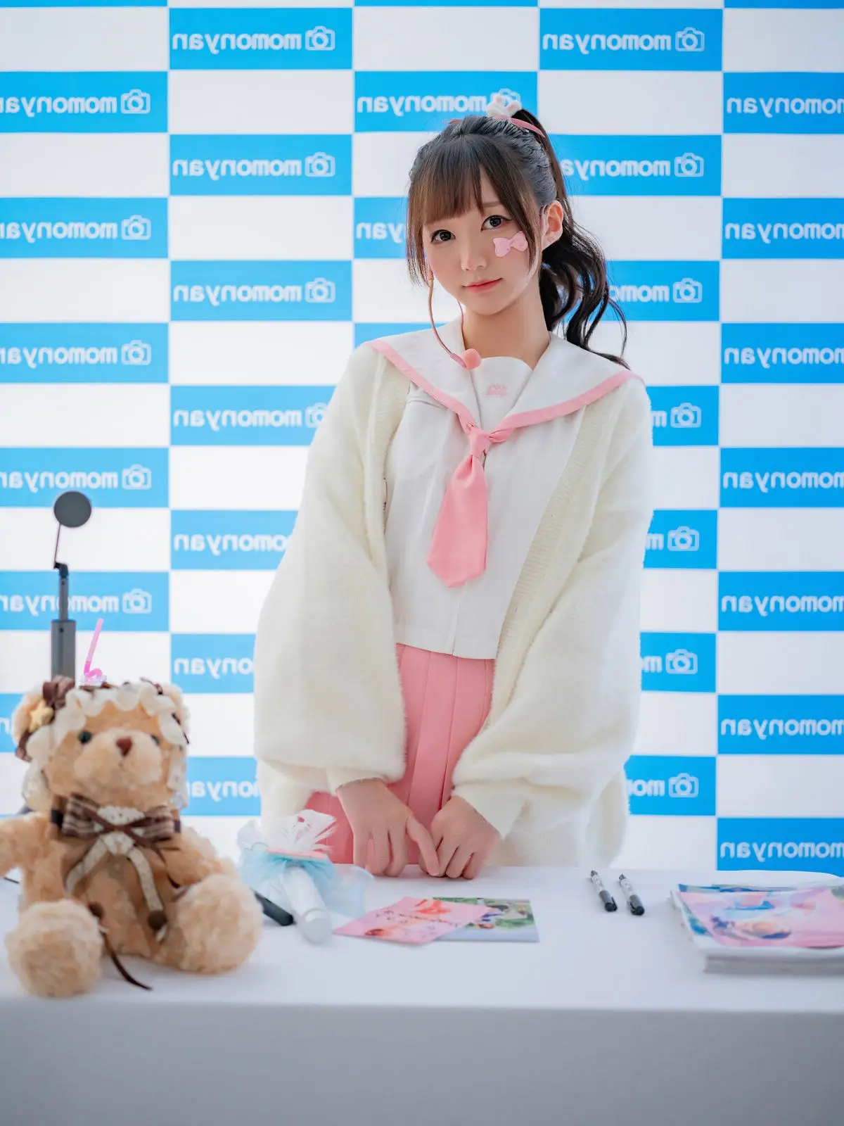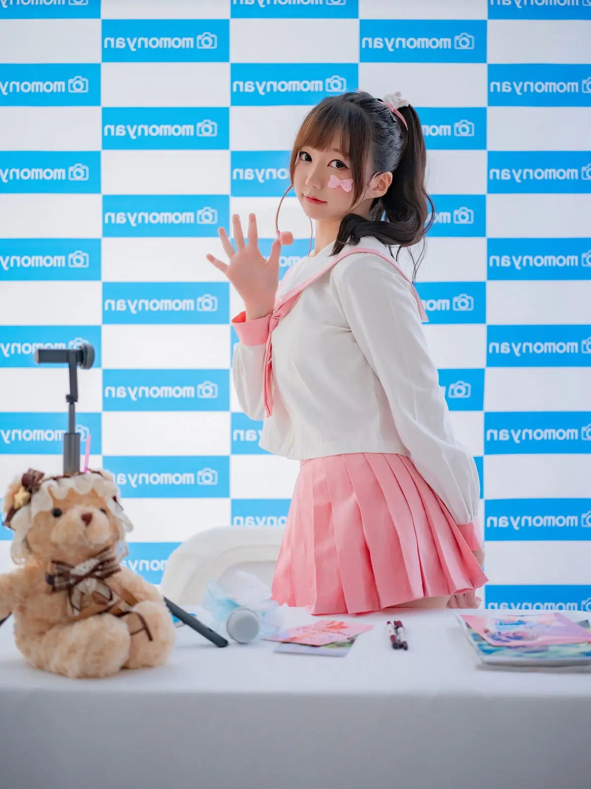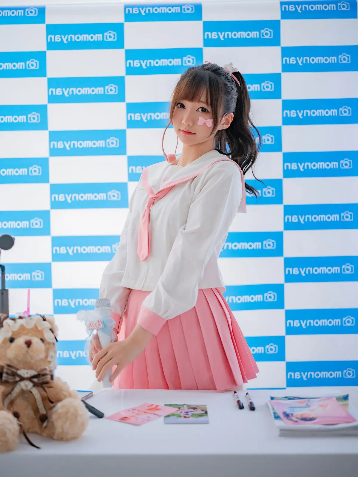 This image captures a sweet moment with Coser NAGISA魔物喵 at a fan event she radiates an innocent charm with her neatly tied ponytail and a friendly smile her outfit a white top paired with a pleated pink skirt evokes a cute schoolgirl style perfectly suiting the intimate atmosphere of the gathering on the table before her are small items likely gifts or memorabilia for fans alongside an adorable teddy bear the blue and white momonya patterned backdrop further accentuates NAGISA魔物喵s youthful vibrancy the photograph conveys warmth and connection between the idol and her fans inviting viewers to delve deeper into this special autograph session
