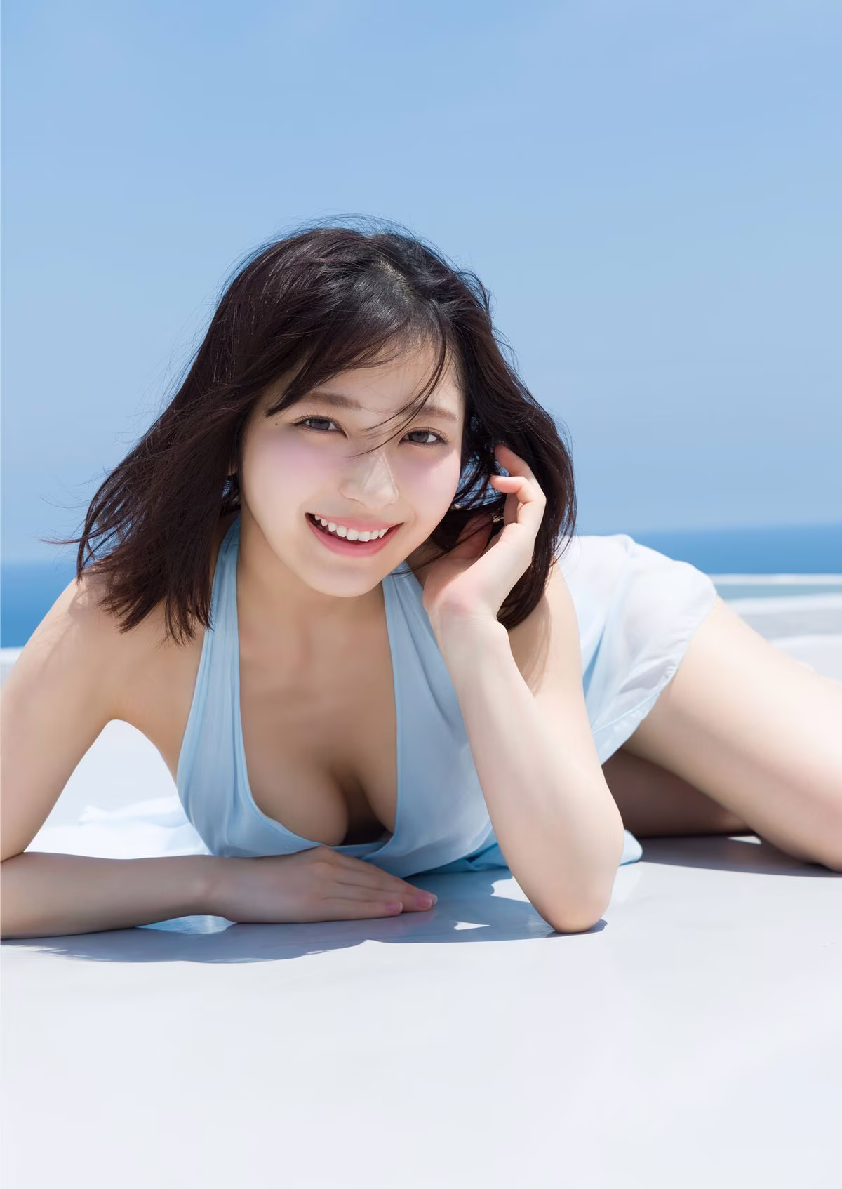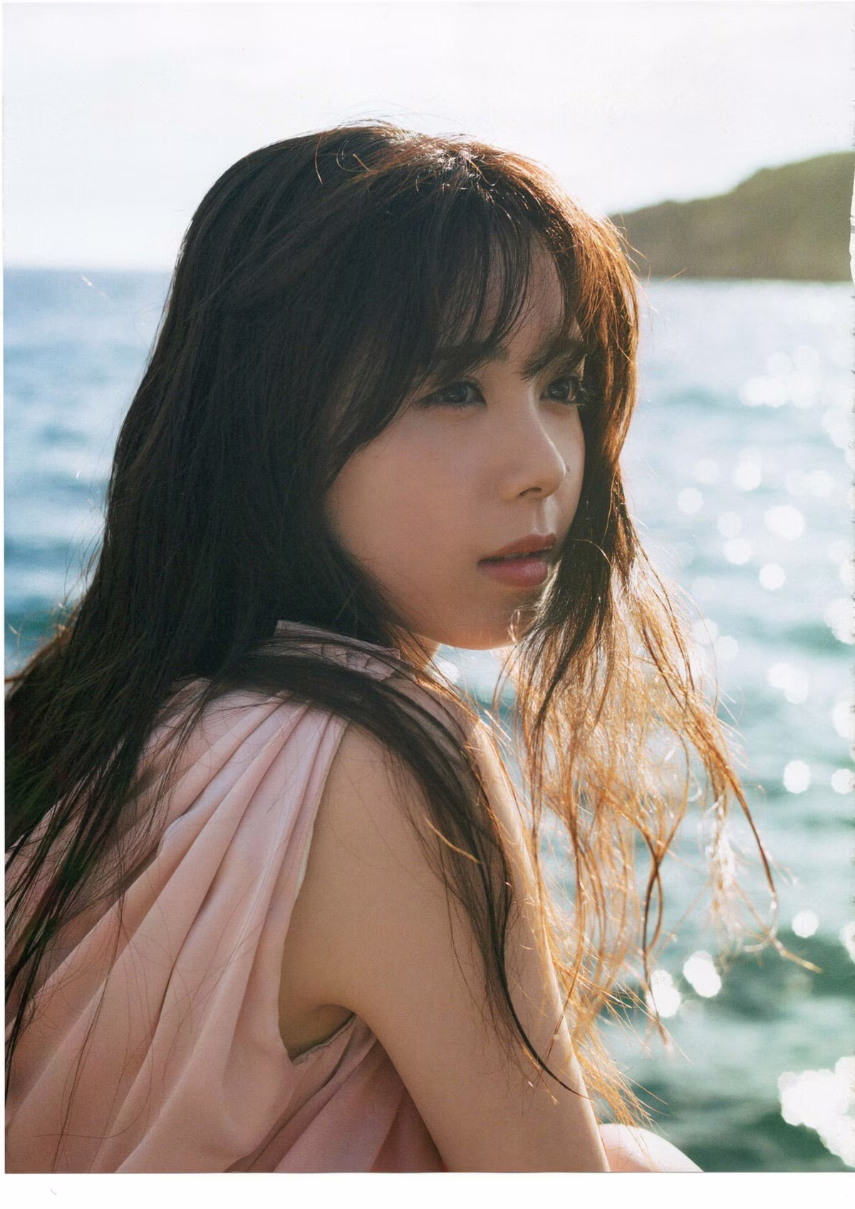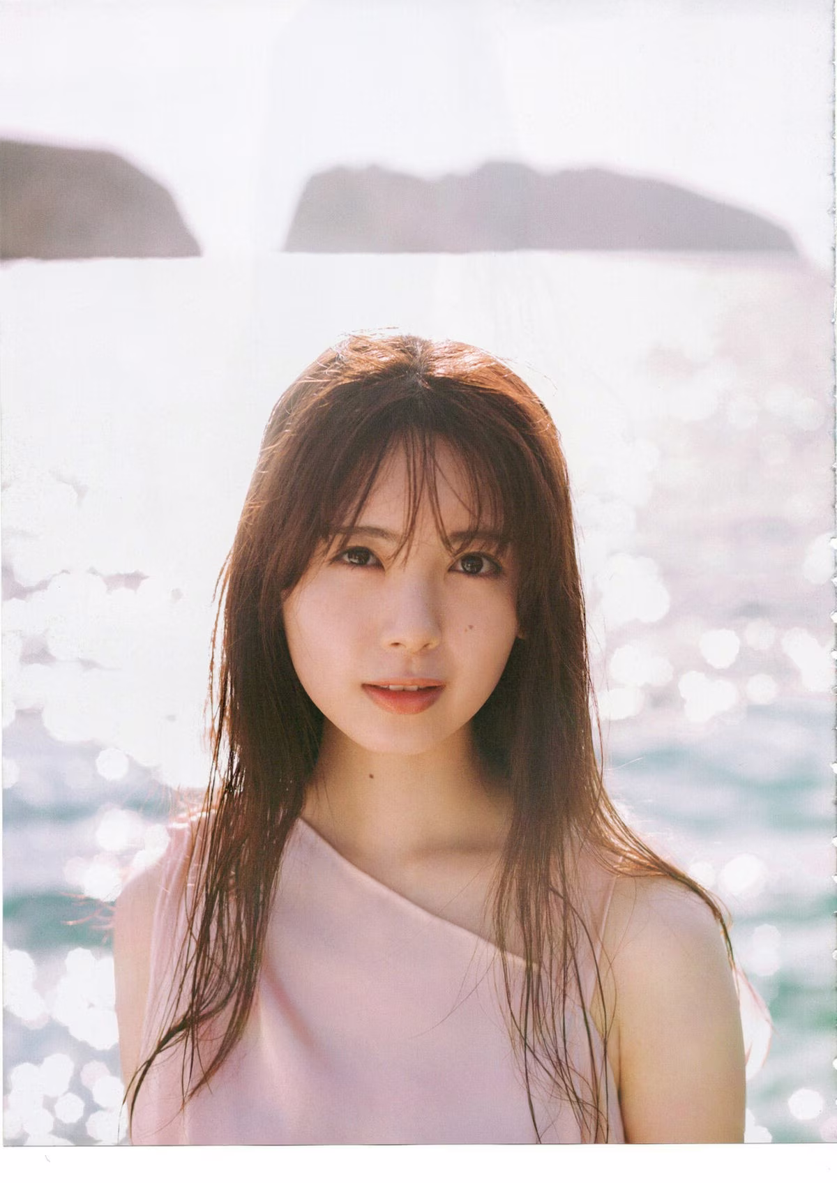 This captivating photo collection presents Nogizaka46's Ayame Tsutsui in a mesmerizing seaside setting. With naturally damp hair and a profound gaze she exudes a pure and slightly contemplative beauty. Her soft pastel pink attire blends seamlessly with the golden sunlight reflecting on the water creating a romantic and poetic scene. The moment Ayame sits on the boat deck gazing into the distance evokes 'gaps in emotion' perfectly aligning with the title of her debut photobook. This series is an intimate journey into Ayame Tsutsui's inner beauty and natural grace promising an impressive visual experience for fans and admirers alike.Stories
