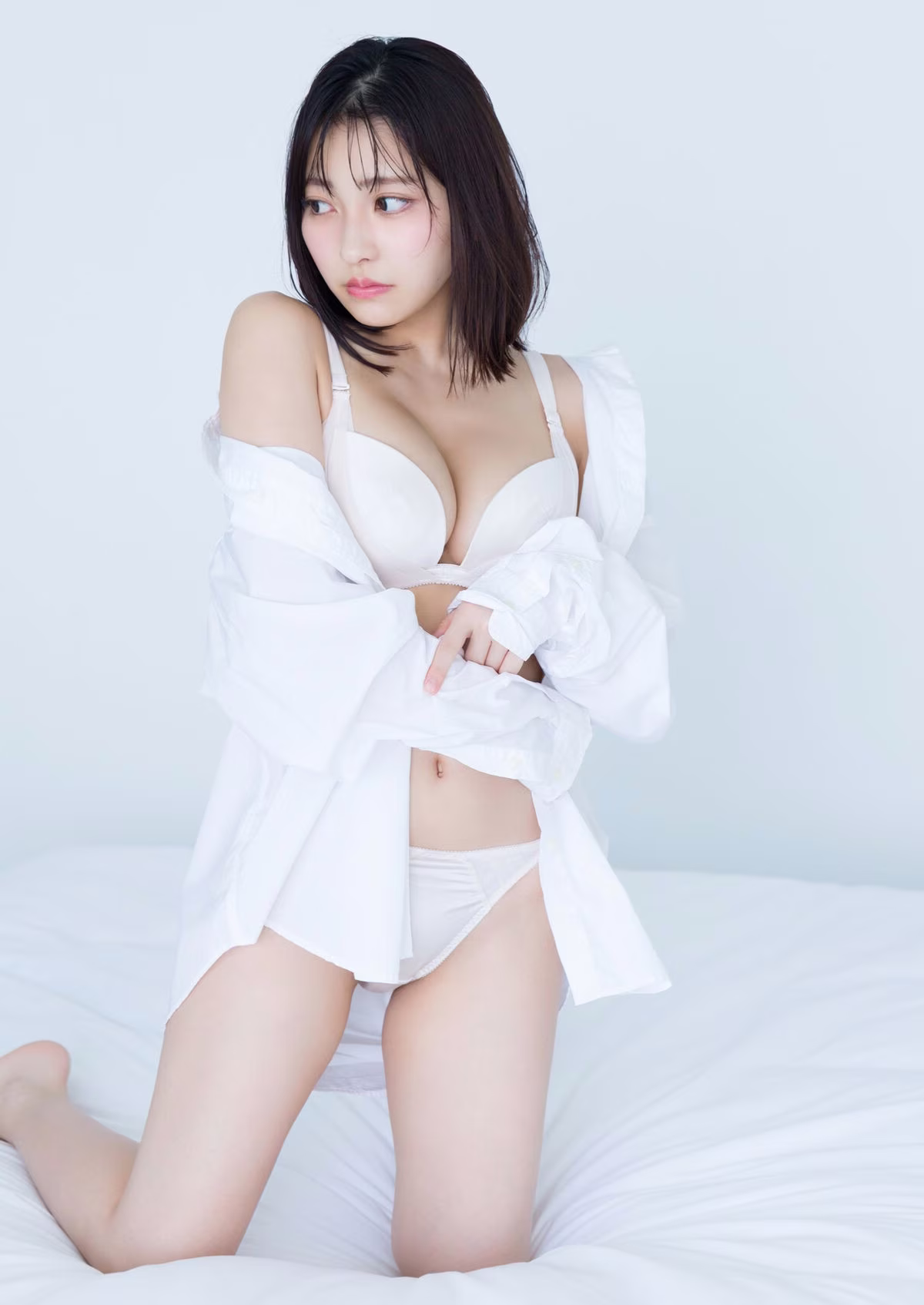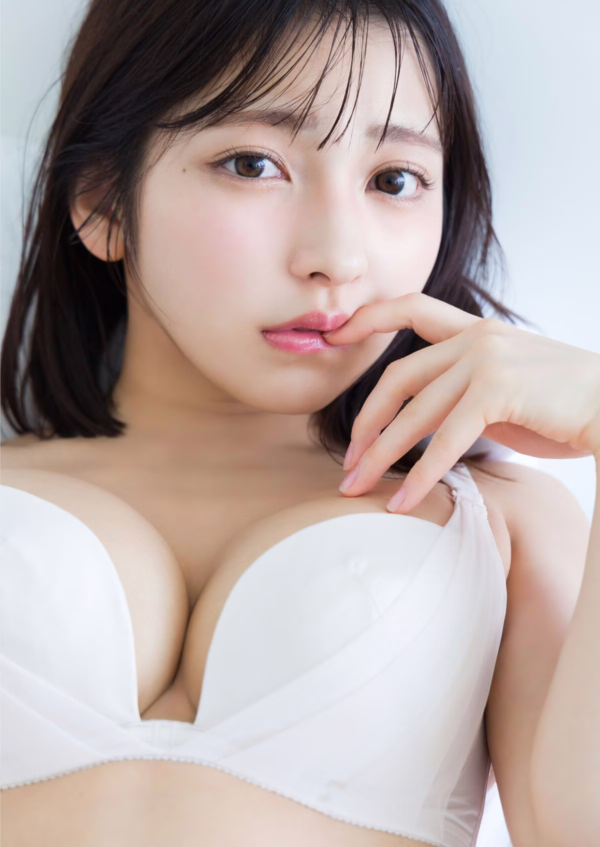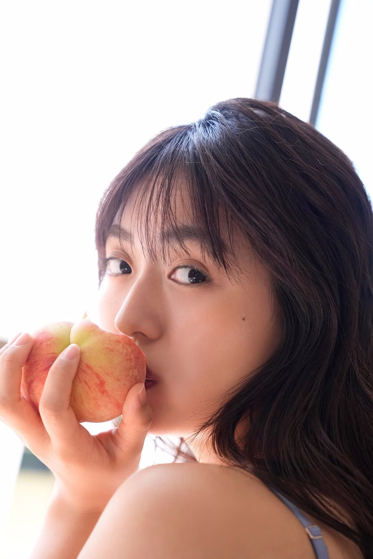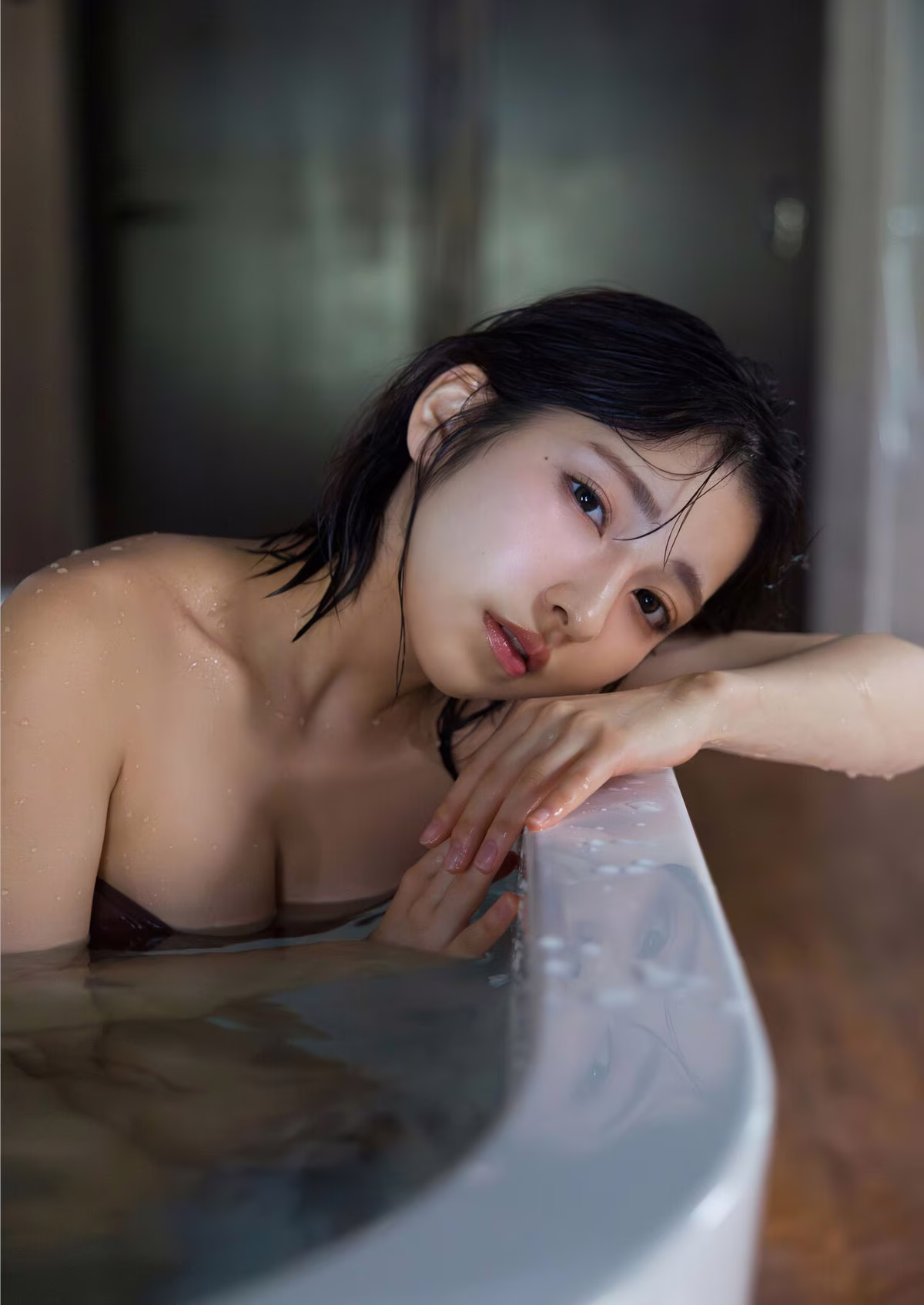 This captivating photo collection presents Nogizaka46's Ayame Tsutsui in a mesmerizing seaside setting. With naturally damp hair and a profound gaze she exudes a pure and slightly contemplative beauty. Her soft pastel pink attire blends seamlessly with the golden sunlight reflecting on the water creating a romantic and poetic scene. The moment Ayame sits on the boat deck gazing into the distance evokes 'gaps in emotion' perfectly aligning with the title of her debut photobook. This series is an intimate journey into Ayame Tsutsui's inner beauty and natural grace promising an impressive visual experience for fans and admirers alike.Stories