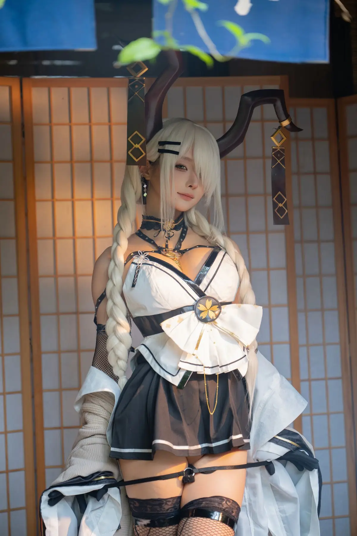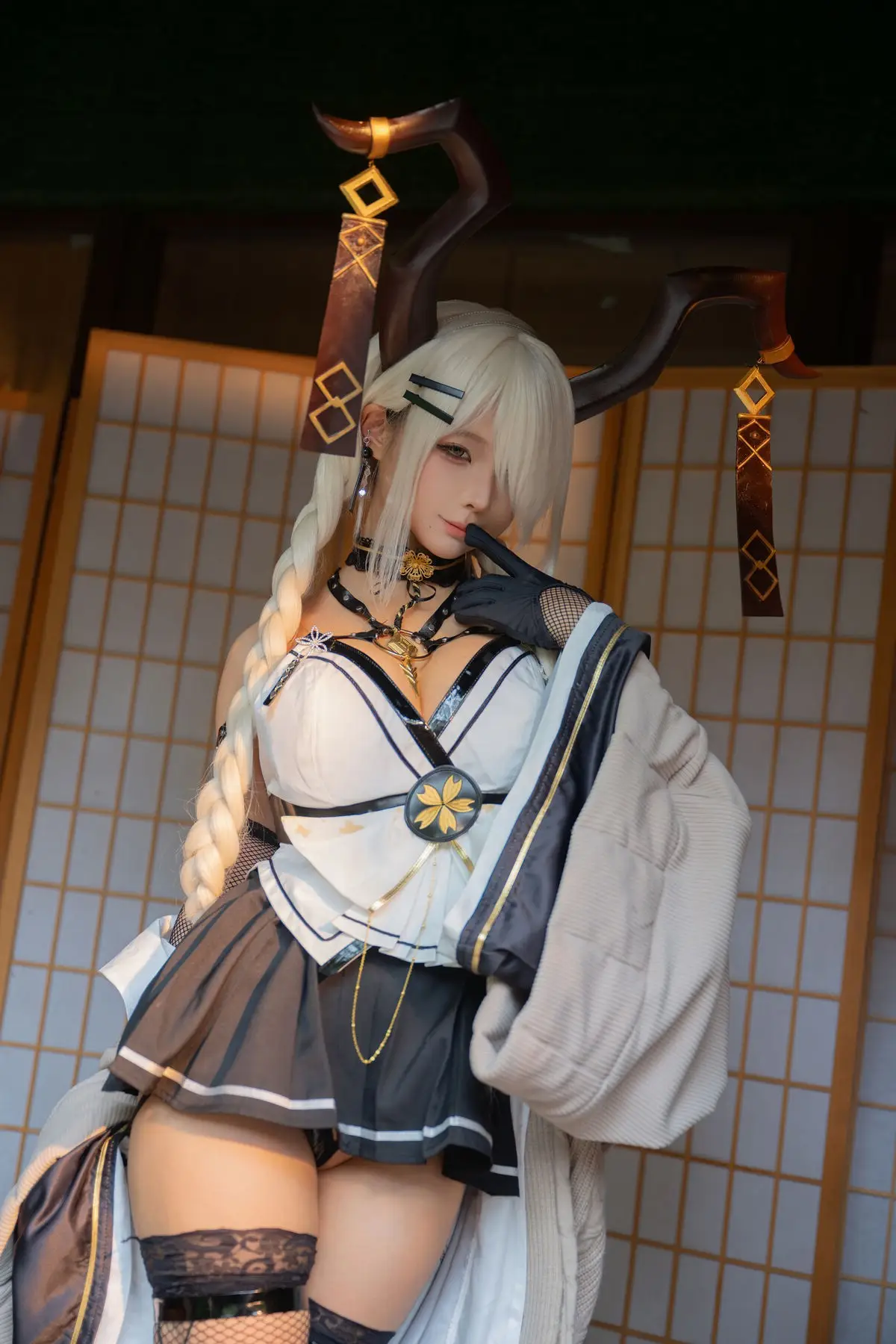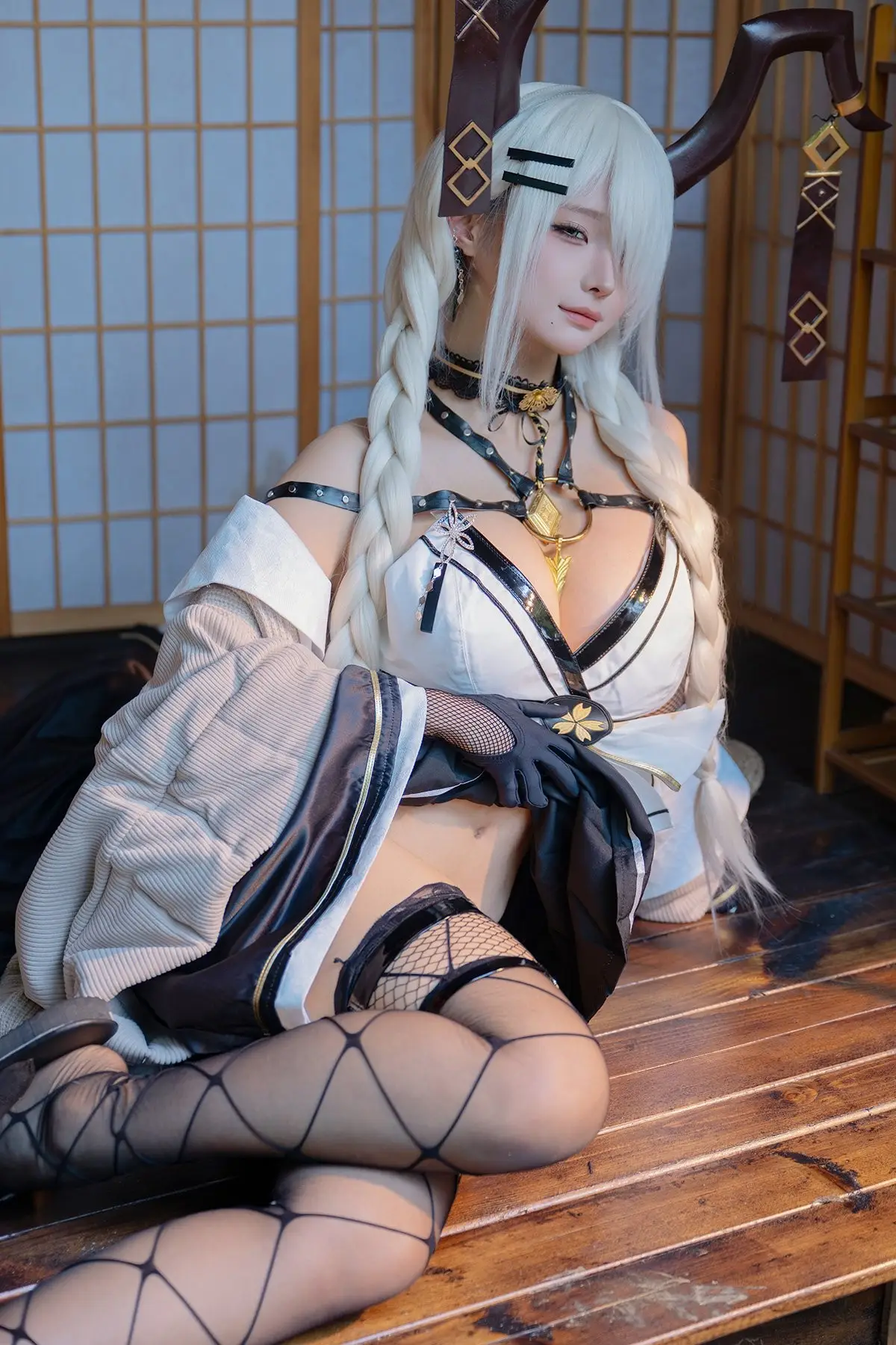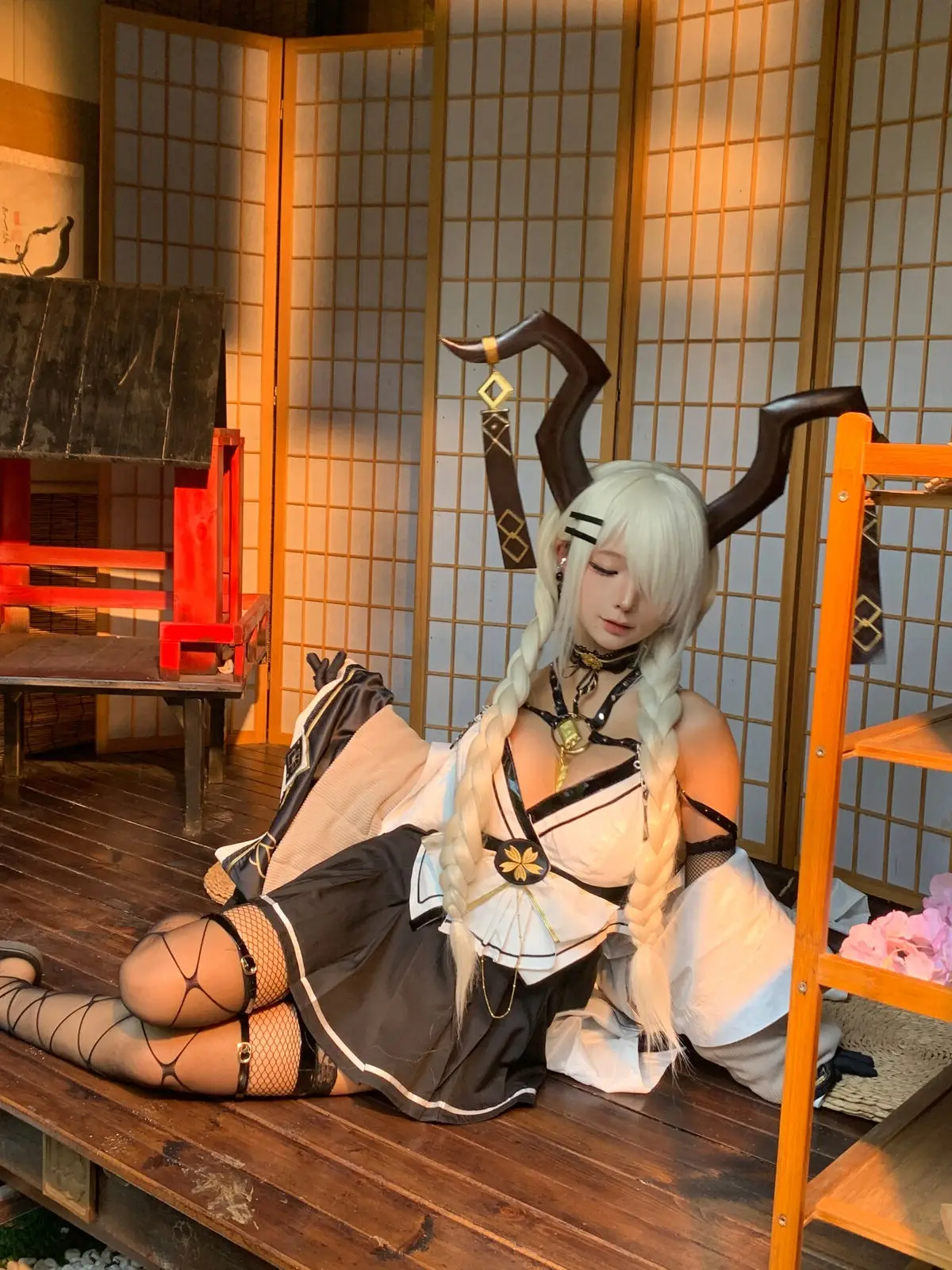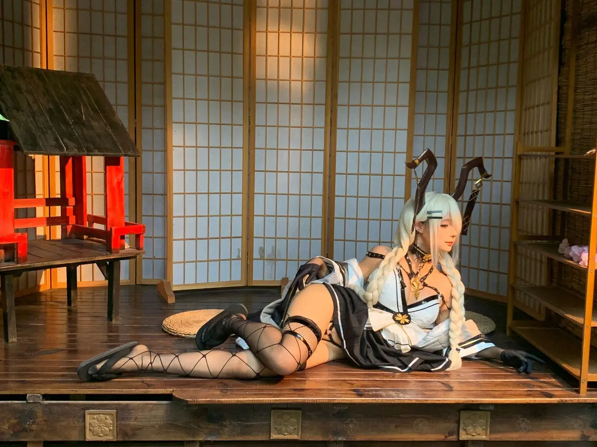 In this stunning Coser 蠢沫沫 Chunmomo Owari Part01 collection the model masterfully embodies the character with an alluring and mysterious aura. She gracefully reclines on a wooden floor adorned in an exquisitely detailed costume from the white corset top to the seductive fishnet stockings and unique hair accessories. The distinctly East Asian setting featuring shoji screens further enhances Chunmomo's elegant and captivating beauty. Every gesture and gaze reflects her professionalism and passion for character transformation.