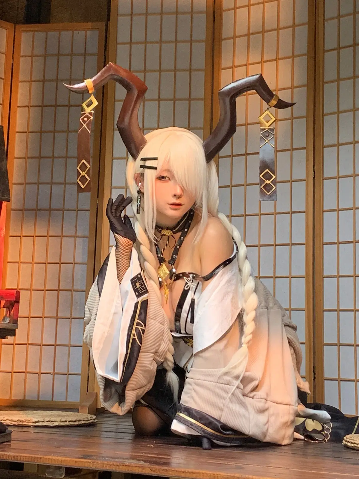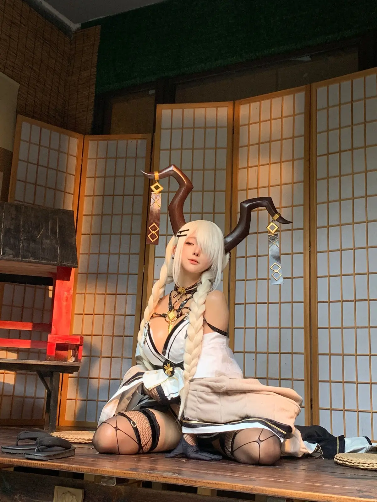 Coser Chunmomo shines brightly in the 尾张 Part03 photoshoot with an enchanting and seductive portrayal. In this image she transforms into a mythical or anime character featuring braided platinum hair, unique horns, and an outfit blending traditional Japanese style with modern flair. The flowing light robe paired with delicate black fishnet stockings accentuates her alluring figure and graceful contours. Her elegantly tilted sitting pose and sharp gaze create an irresistible appeal. The East Asian setting with shoji screens and soft lighting further enhances Chunmomo's mystical and captivating beauty. This is a part of the 尾张 Part03 series promising many more captivating surprises.