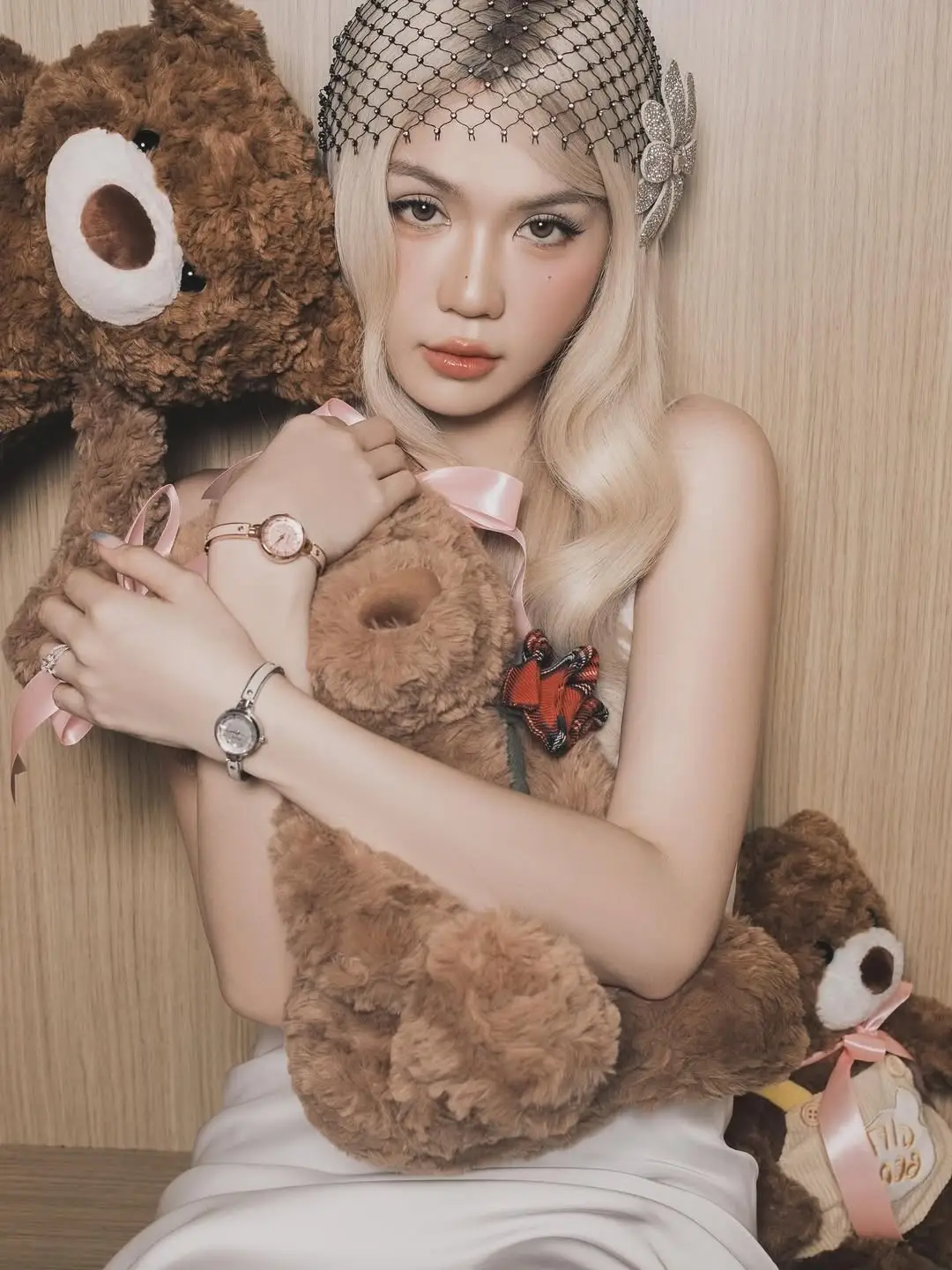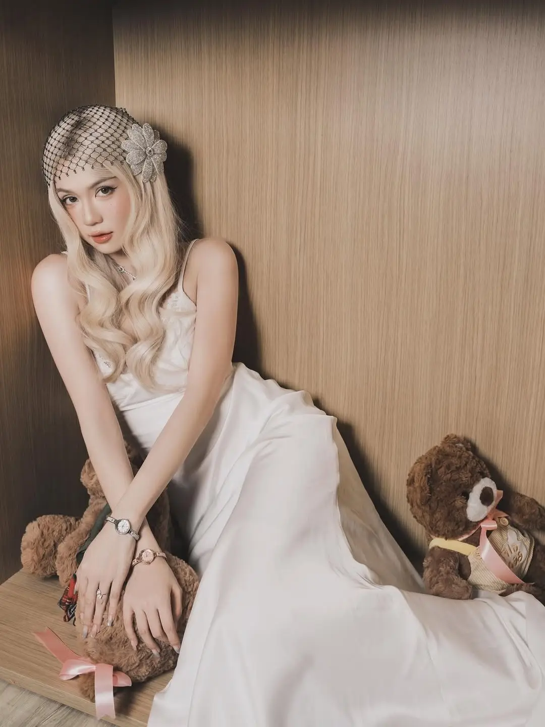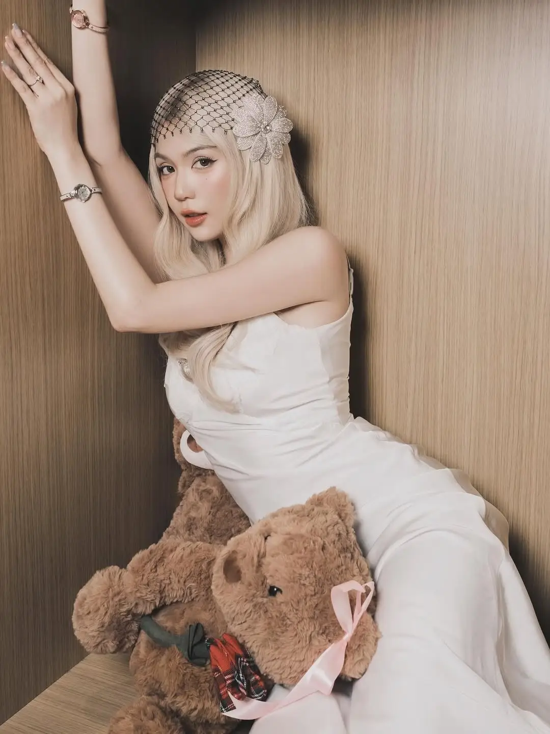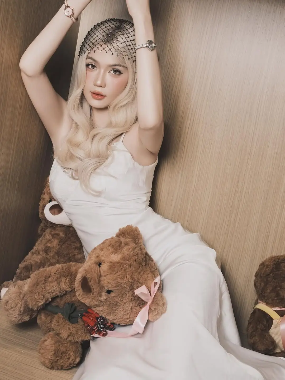 Ngoc Trinh once again captures attention with her latest photo collection, where she unveils her signature seductive beauty, presented with a sweeter, more dreamlike style. In a cozy setting with a wooden backdrop, Ngoc Trinh appears like a muse, with flowing blonde hair and an ethereal white dress, seated beside adorable teddy bears. This imagery not only highlights her slender, alluring figure but also radiates a delicate, innocent charm. It serves as a testament to the versatility within Ngoc Trinh's beauty brand, reaffirming her irresistible appeal through every artistic angle.#NgocTrinh #SeductiveBeauty #NgocTrinhPhotoshoot #DreamyMuse #CharmingStyle