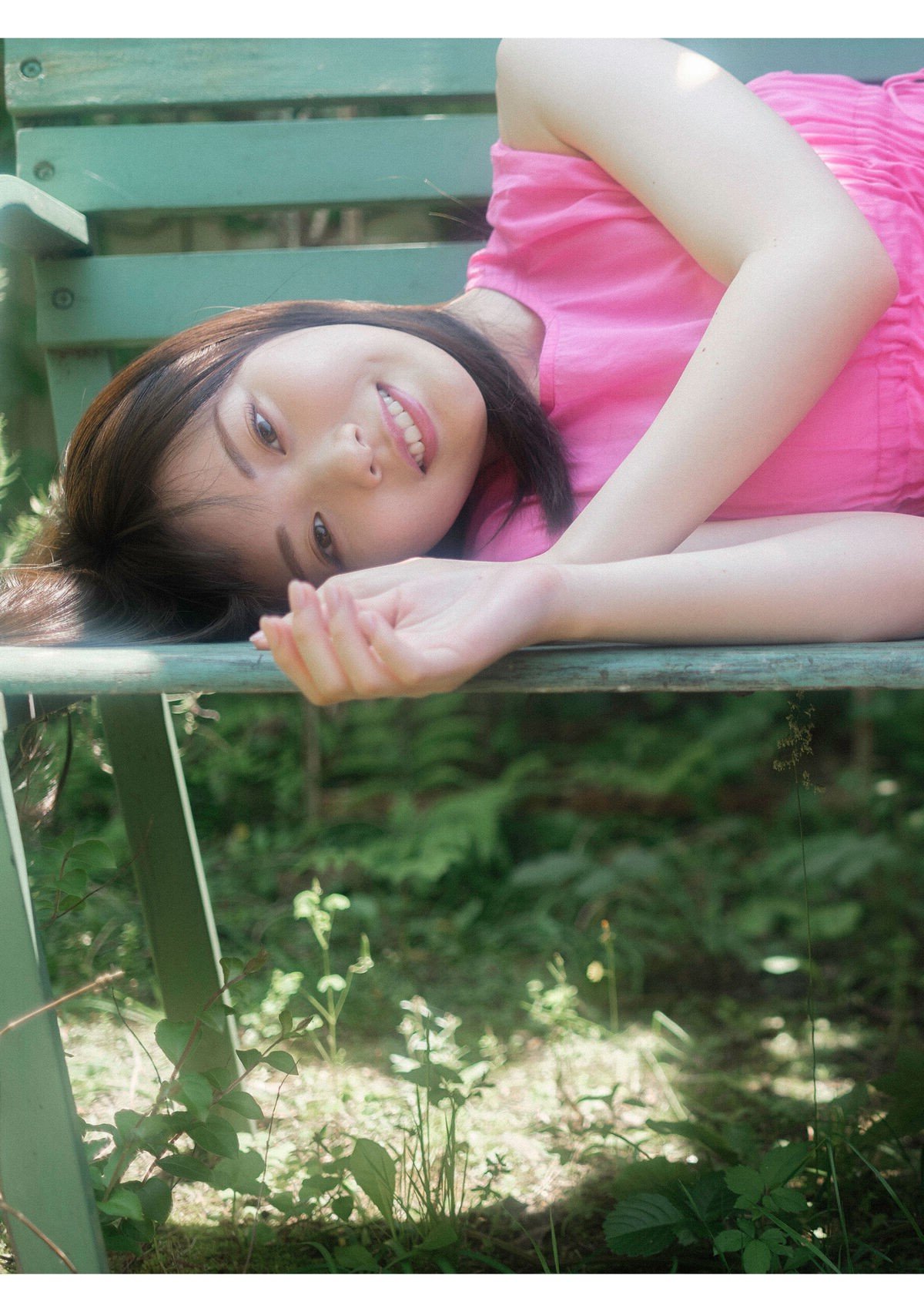 In this captivating image, Japanese model Mio Ishikawa (石川澪) shines with pure and radiant beauty. She appears in a vibrant pink dress, highlighting her smooth, fair skin and lustrous dark hair. With her hands gracefully posed above her head, Mio Ishikawa conveys a gentle, alluring expression. Natural light filters through lush green foliage, creating sparkling streaks of light on her, evoking a sense of a peaceful afternoon in an outdoor setting. This lovely moment fully captures Mio Ishikawa's innate charm, inviting viewers to explore more of the impressive とられち Part01 collection.