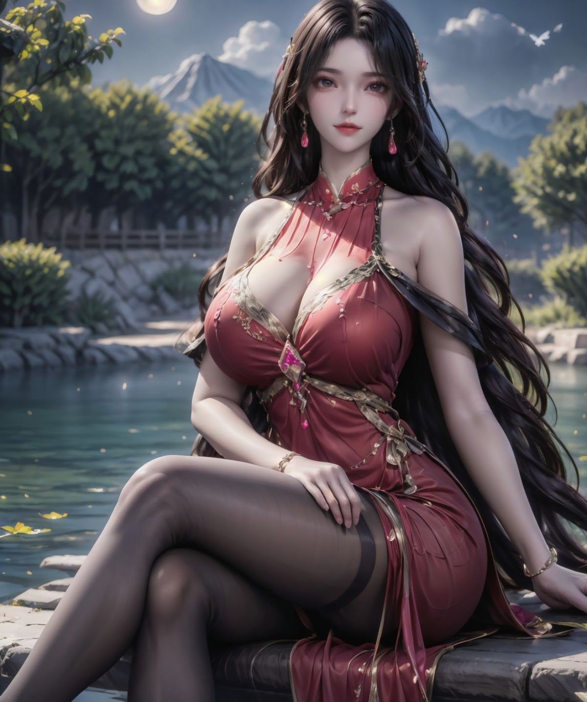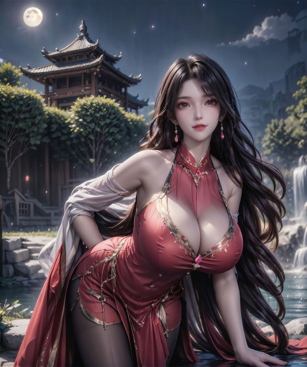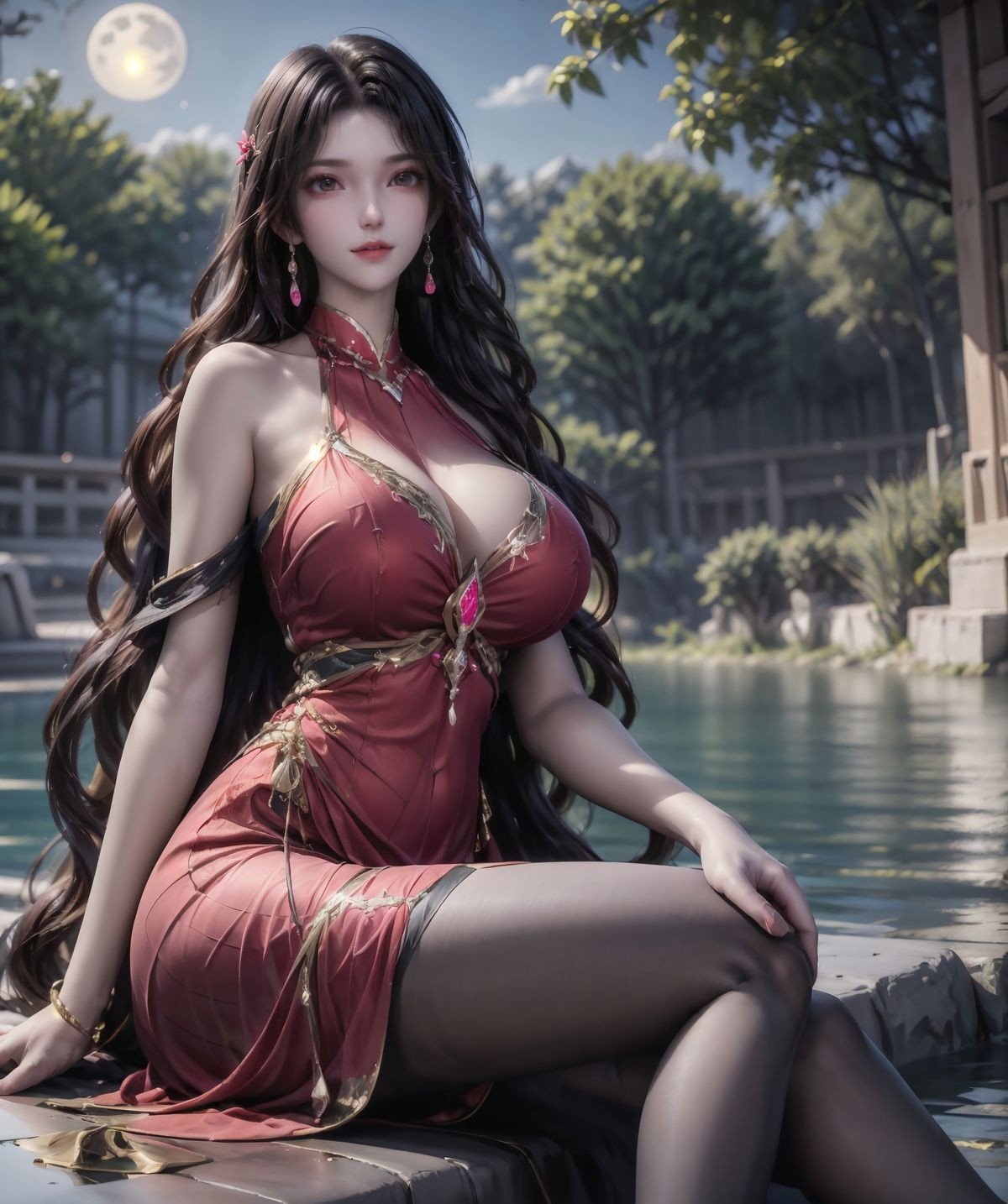 This stunning AI Generated image portrays the character Ye Weiyang from the Throne of Seal series within a magical moonlit setting She wears a vibrant traditional red attire adorned with exquisite gold patterns and a sparkling gem Ye Weiyang's gentle yet alluring East Asian beauty shines brightly amidst the ancient oriental architecture and serene water The full moon casts its radiant glow creating a romantic and captivating atmosphere This artwork perfectly blends AI technology with traditional art presenting a Ye Weiyang who is both familiar and refreshingly new full of charm and allure