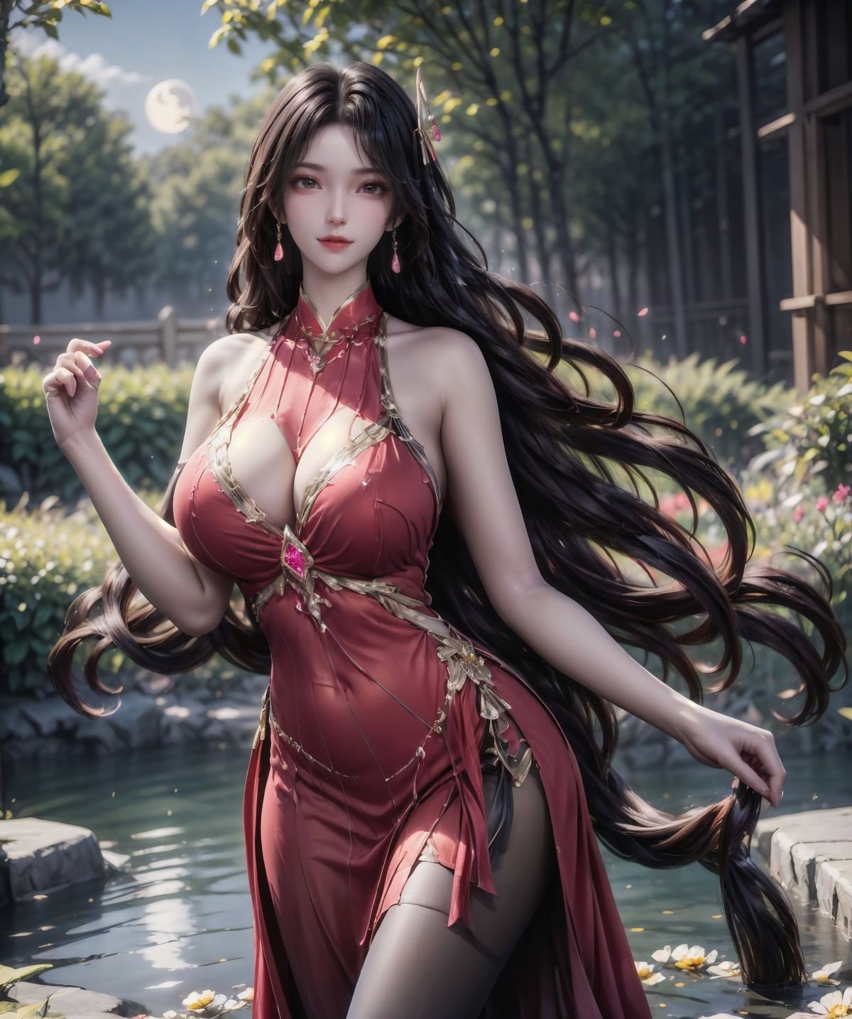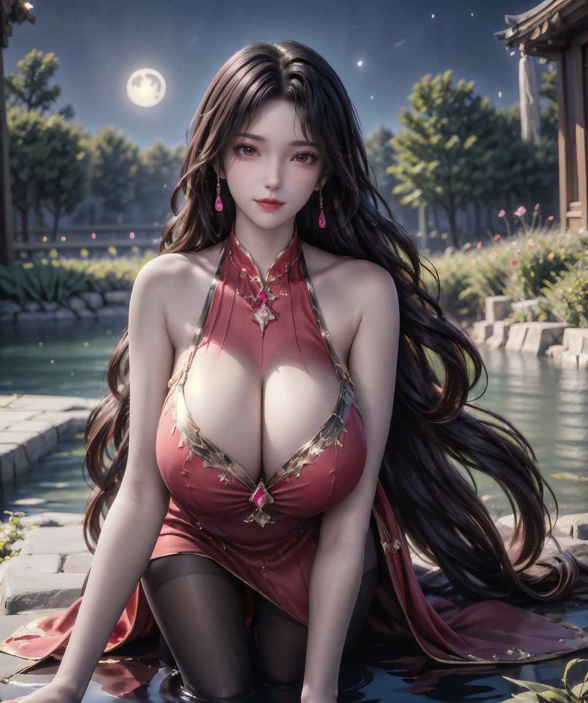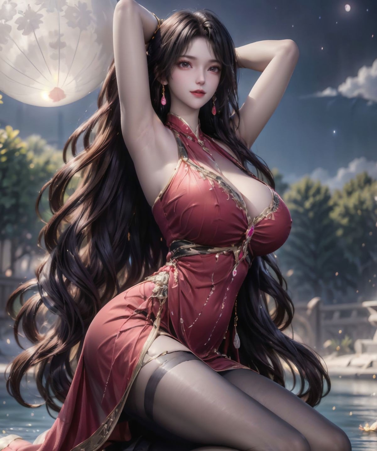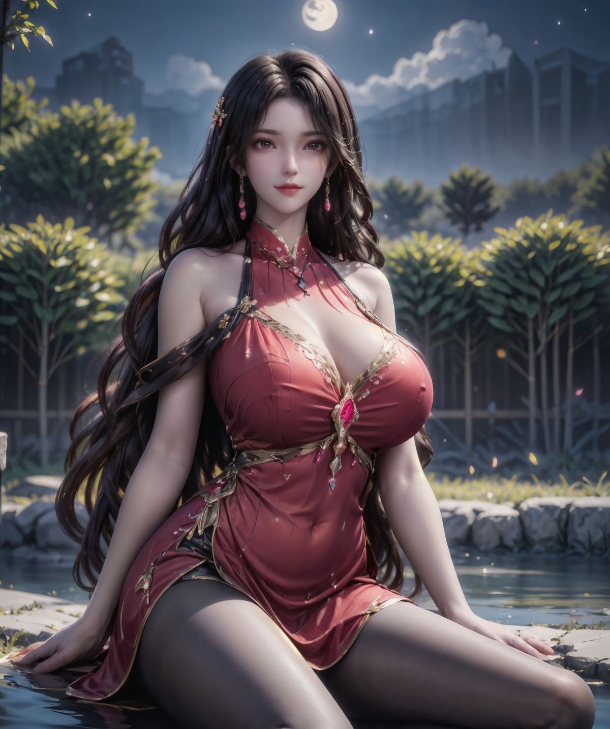 This stunning AI Generated image portrays the character Ye Weiyang from the Throne of Seal series within a magical moonlit setting She wears a vibrant traditional red attire adorned with exquisite gold patterns and a sparkling gem Ye Weiyang's gentle yet alluring East Asian beauty shines brightly amidst the ancient oriental architecture and serene water The full moon casts its radiant glow creating a romantic and captivating atmosphere This artwork perfectly blends AI technology with traditional art presenting a Ye Weiyang who is both familiar and refreshingly new full of charm and allure