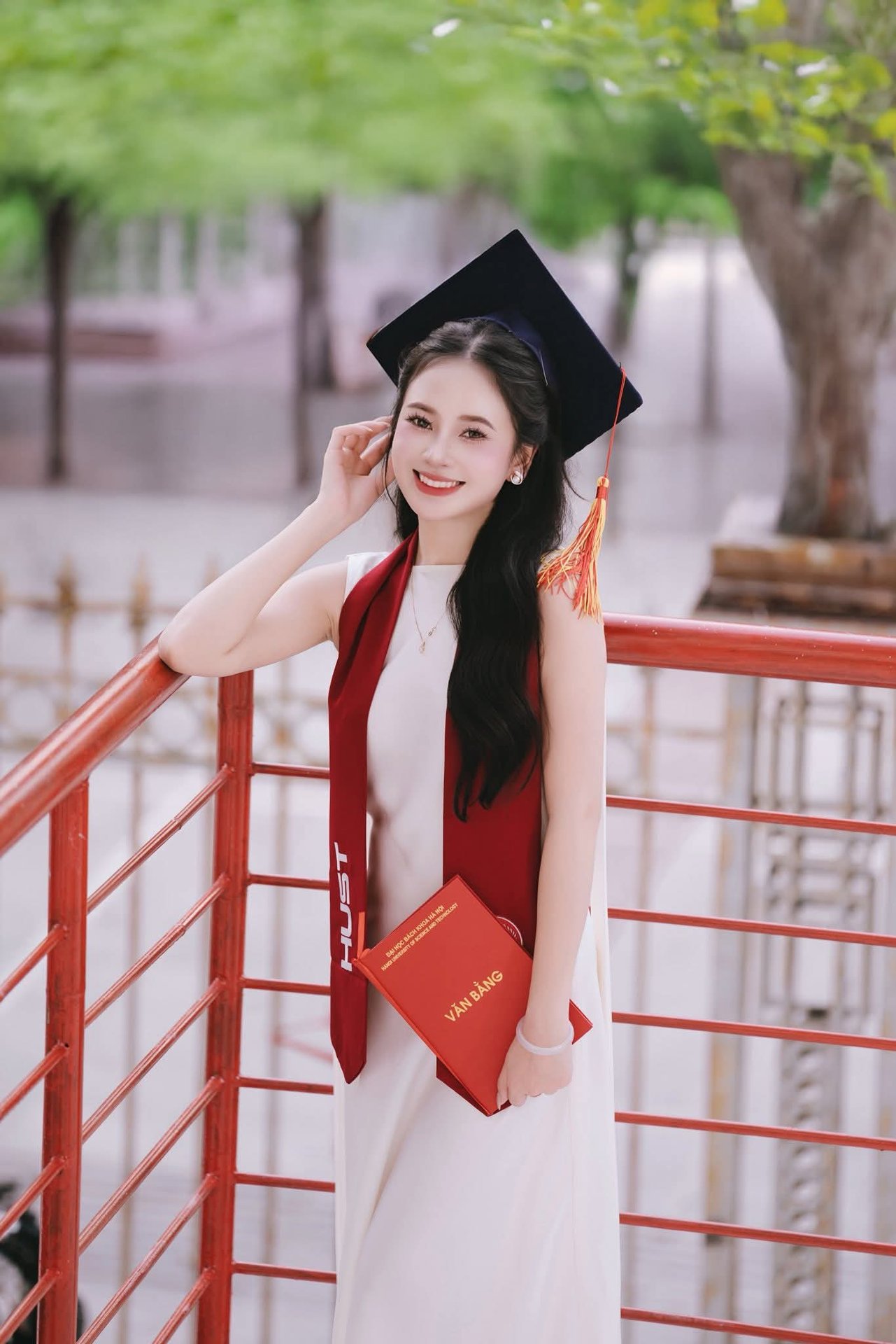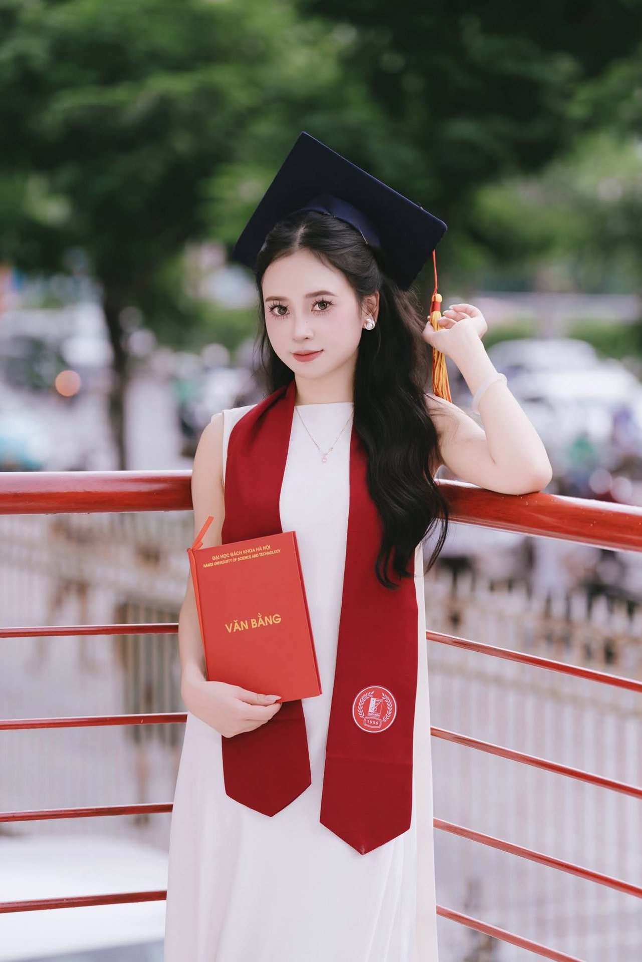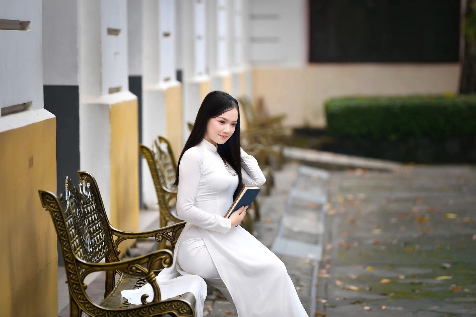 This captivating photograph captures a serene moment of a Vietnamese student adorned in a pristine white Ao Dai. Seated gracefully on an ornate vintage bench, she is engrossed in a book, embodying intellectual beauty and pure elegance. The traditional white Ao Dai drapes elegantly, accentuating her slender figure and highlighting the gentle modest charm of Vietnamese women. The backdrop features classic architecture with weathered columns and tiled roofs, creating a nostalgic and romantic ambiance. This image not only celebrates the timeless beauty of the Ao Dai but also portrays peace wisdom and the distinctive cultural essence of Vietnam. It is a truly cherished and emotional moment.Beautiful Female Graduate Embraces Success at Graduation Ceremony