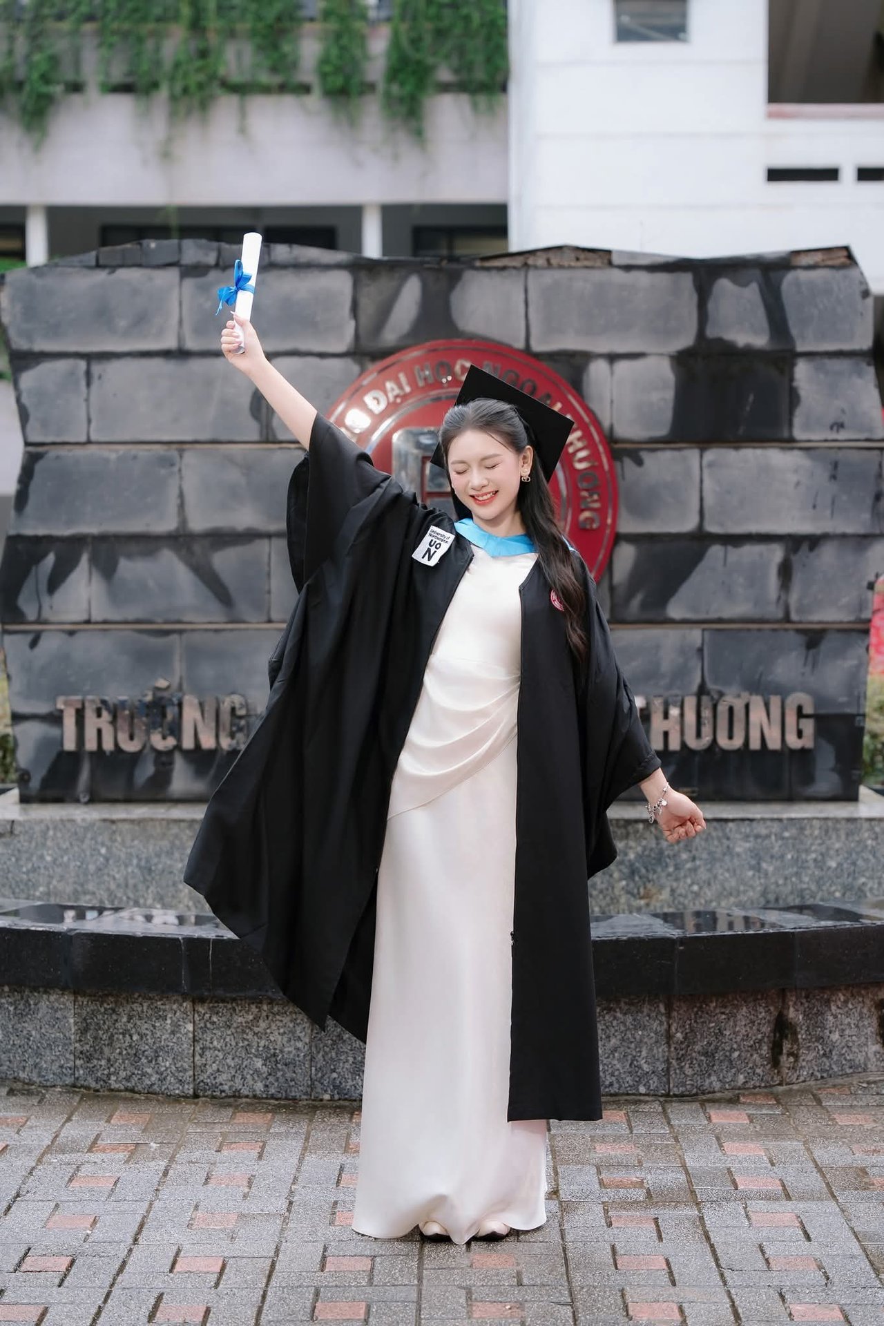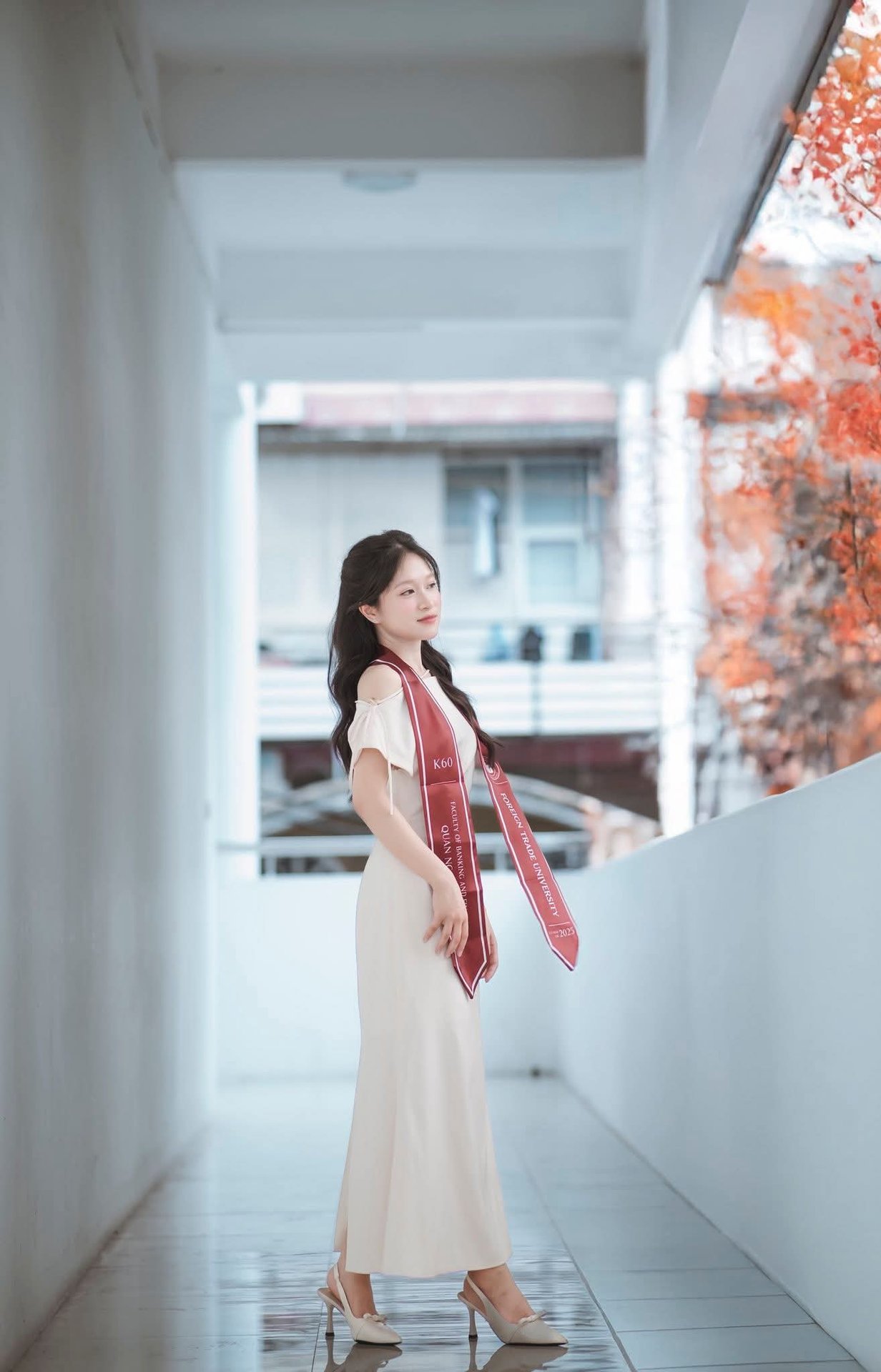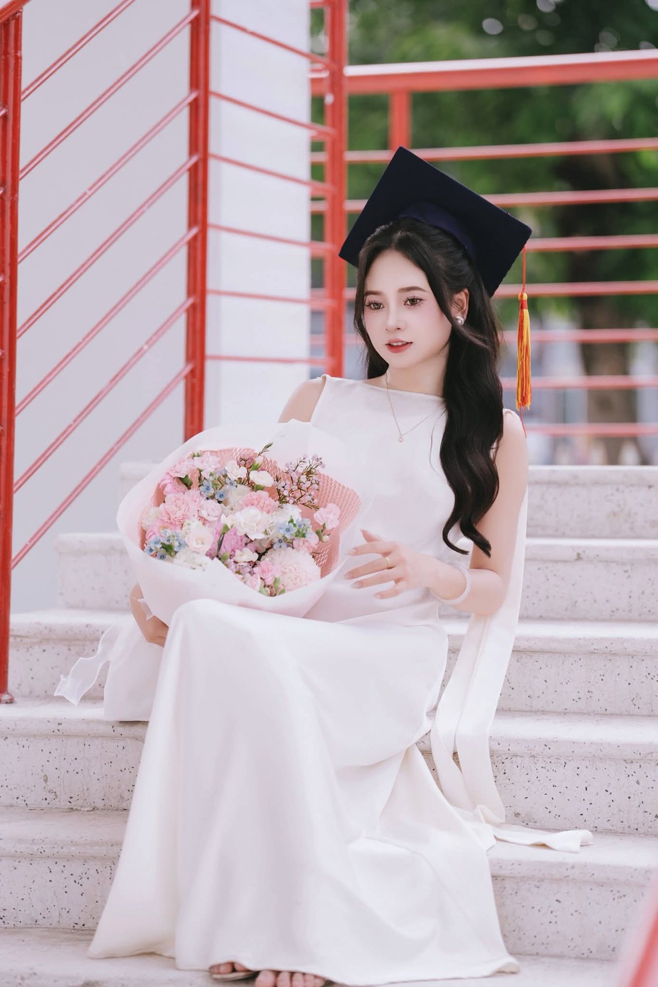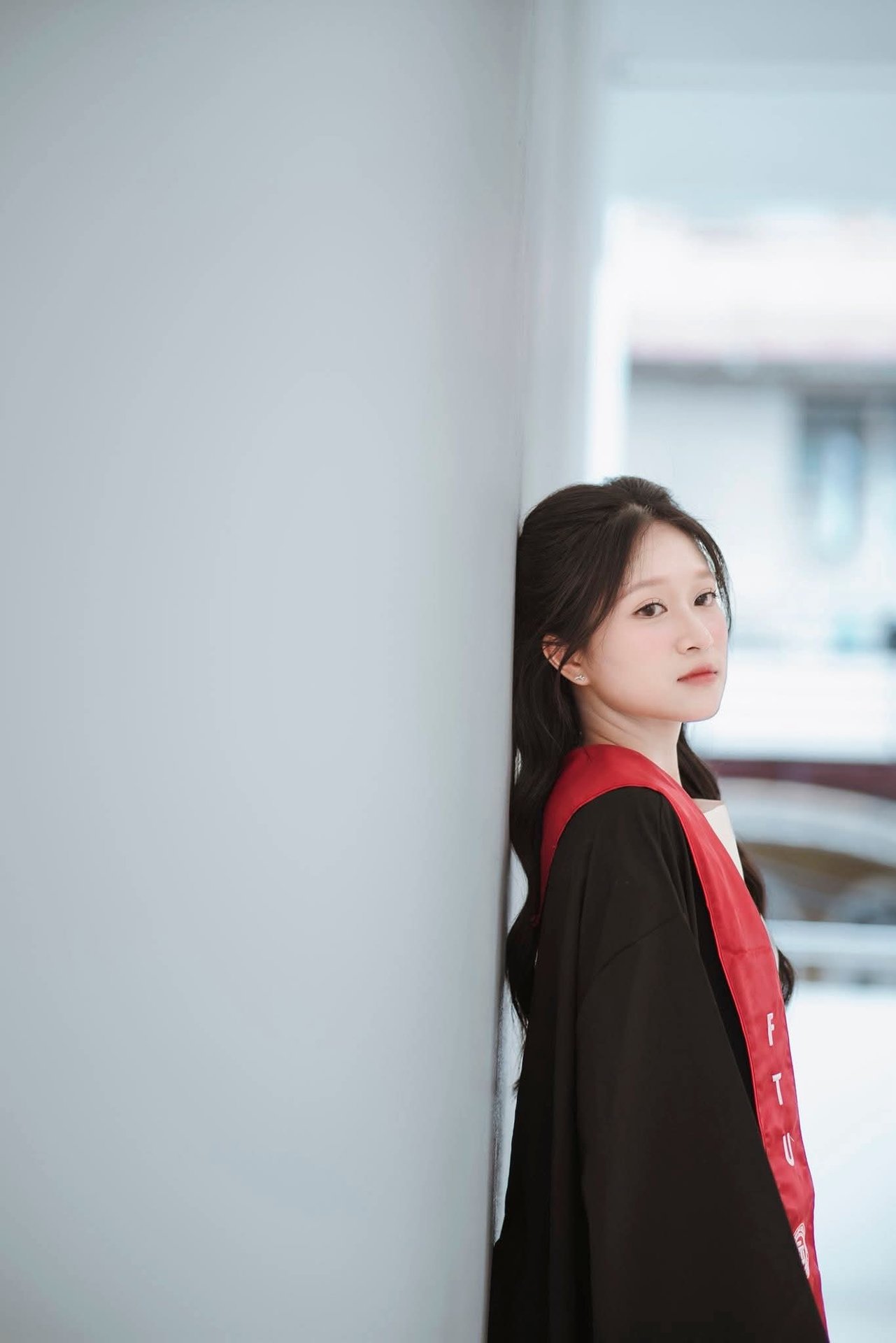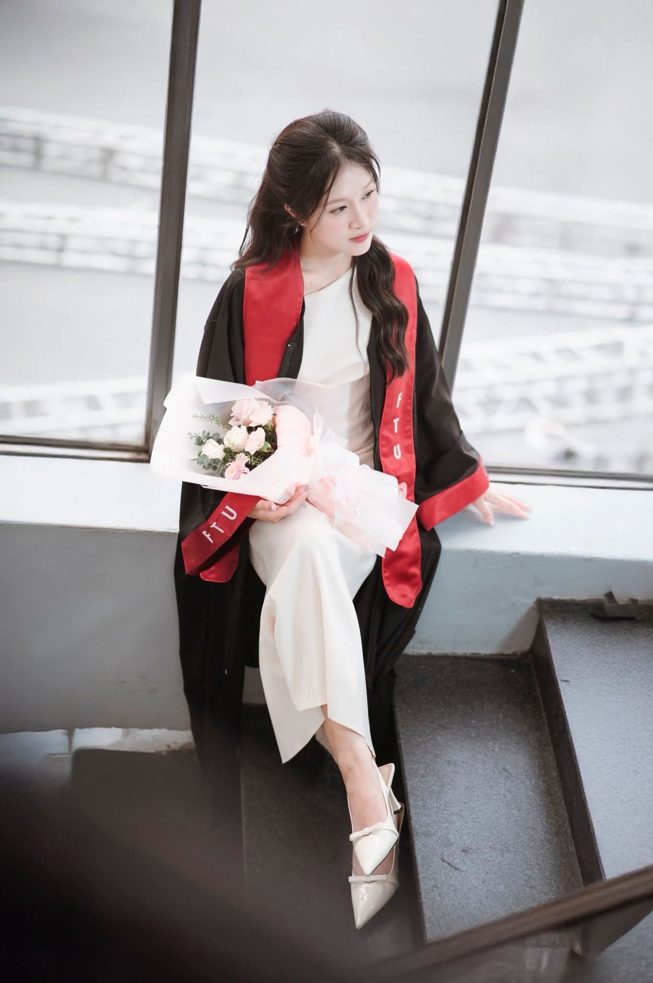 In this MTYH Vol.223 album the beautiful girl in a captivating black dress truly draws all eyes. The young model with her long smooth black hair and elegant student-like style creates a look that is both innocent and alluring. The simple yet sophisticated black dress paired with stylish fishnet stockings accentuates her slender figure. Her graceful sitting pose and gentle gaze exude confidence and natural beauty. This is a high-quality photo that fully showcases the model's charming appeal.Radiant Graduation Moment of Can Tho University Graduate: Joy Marks New Success