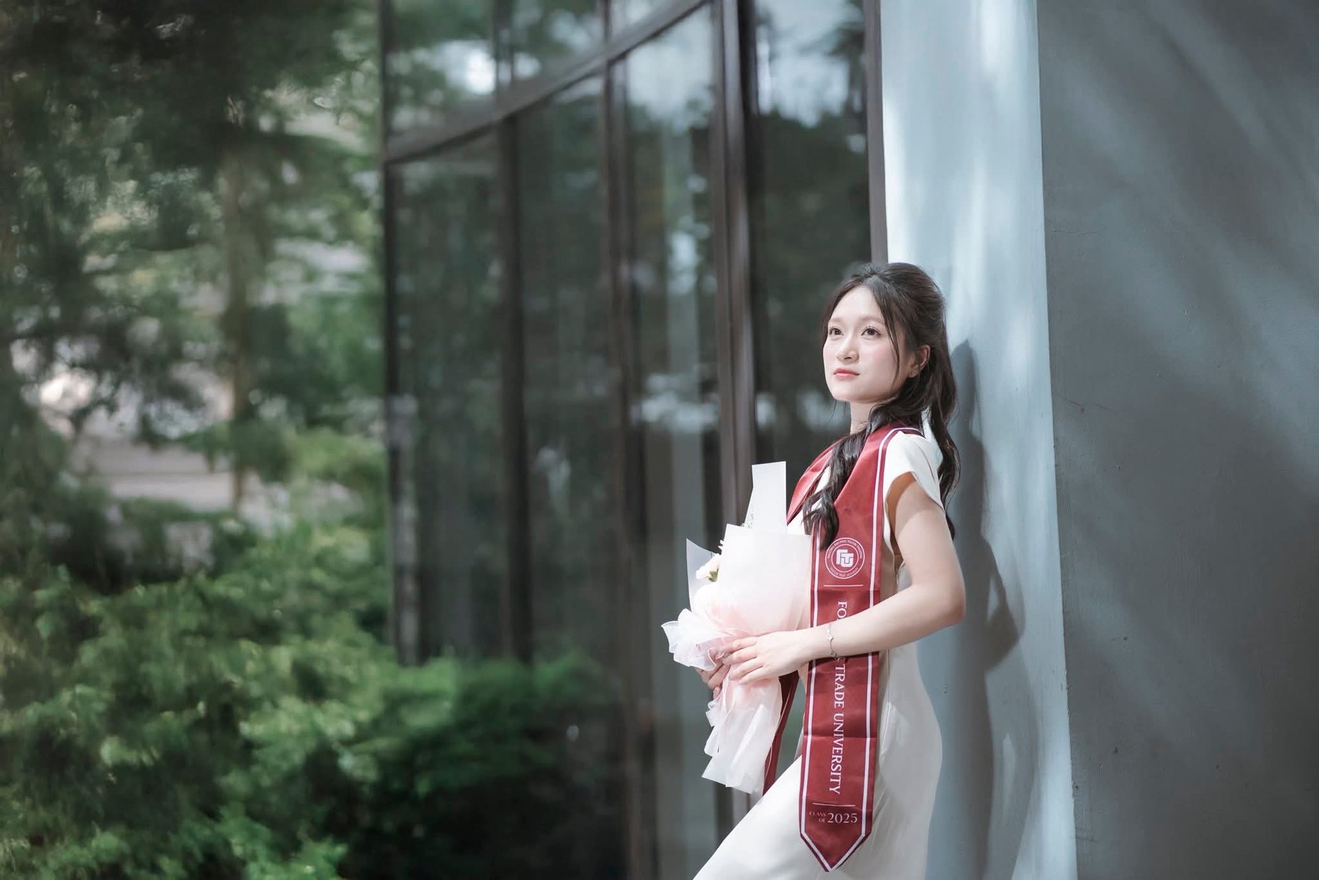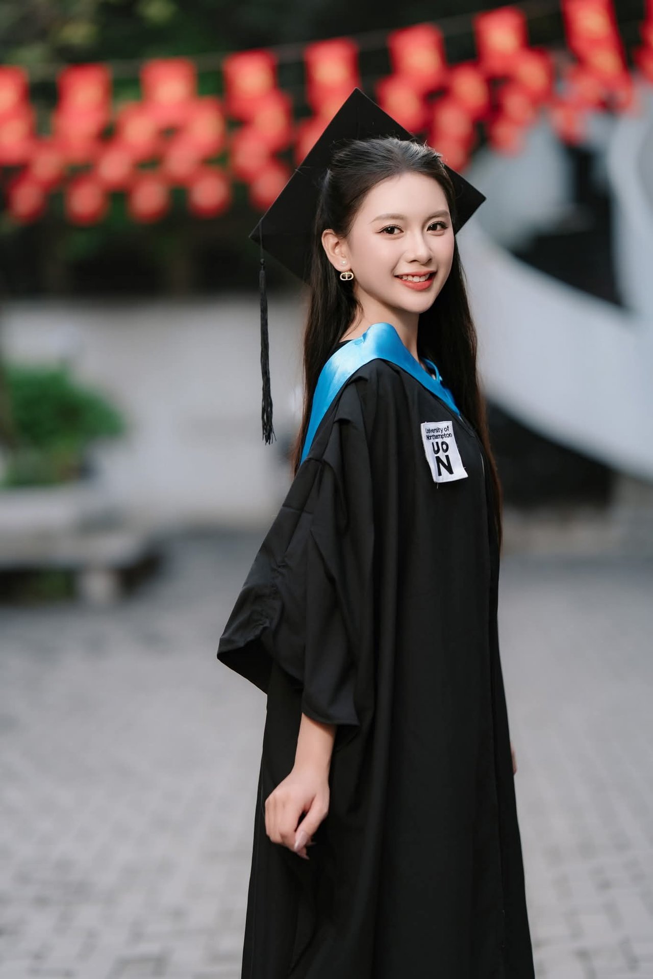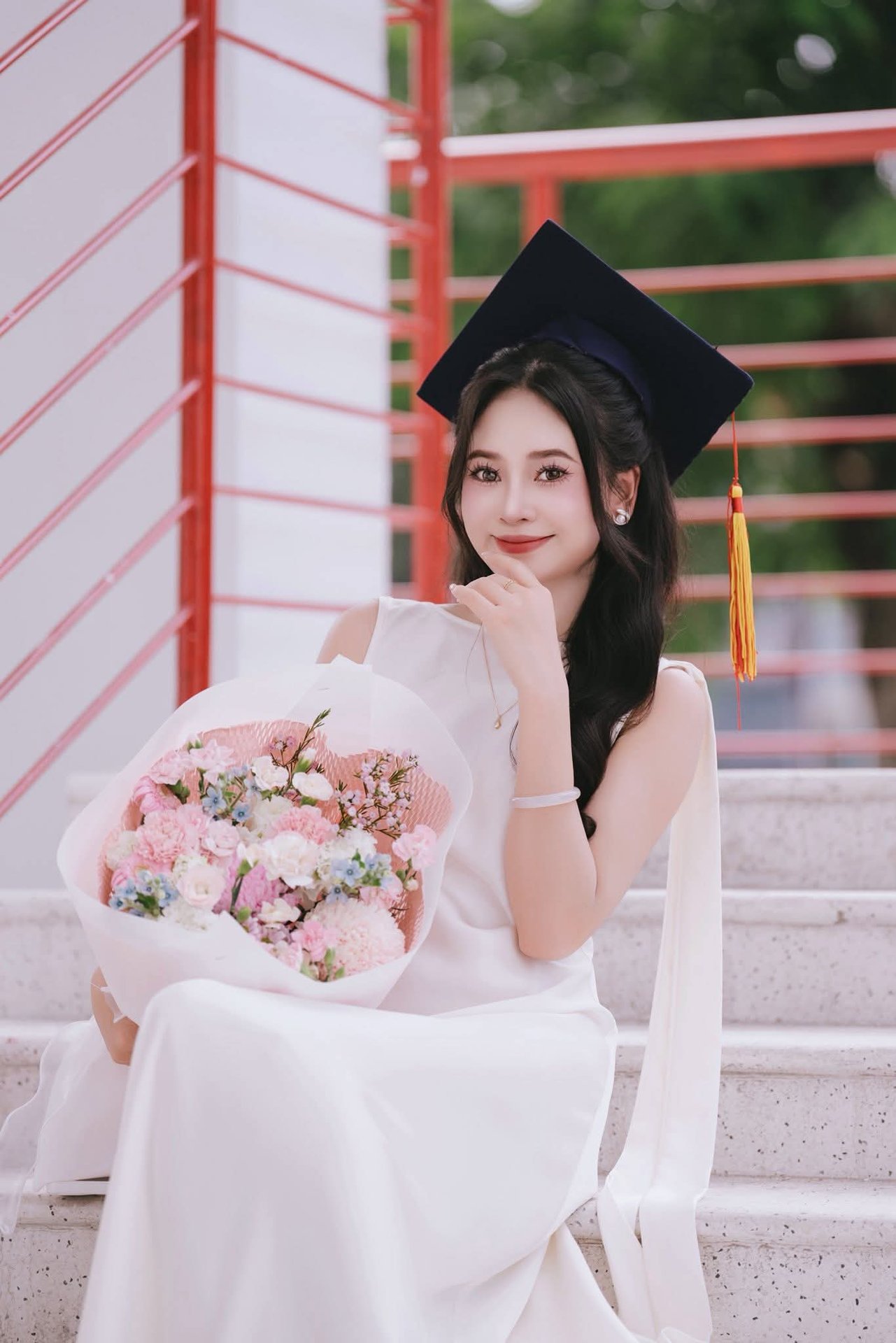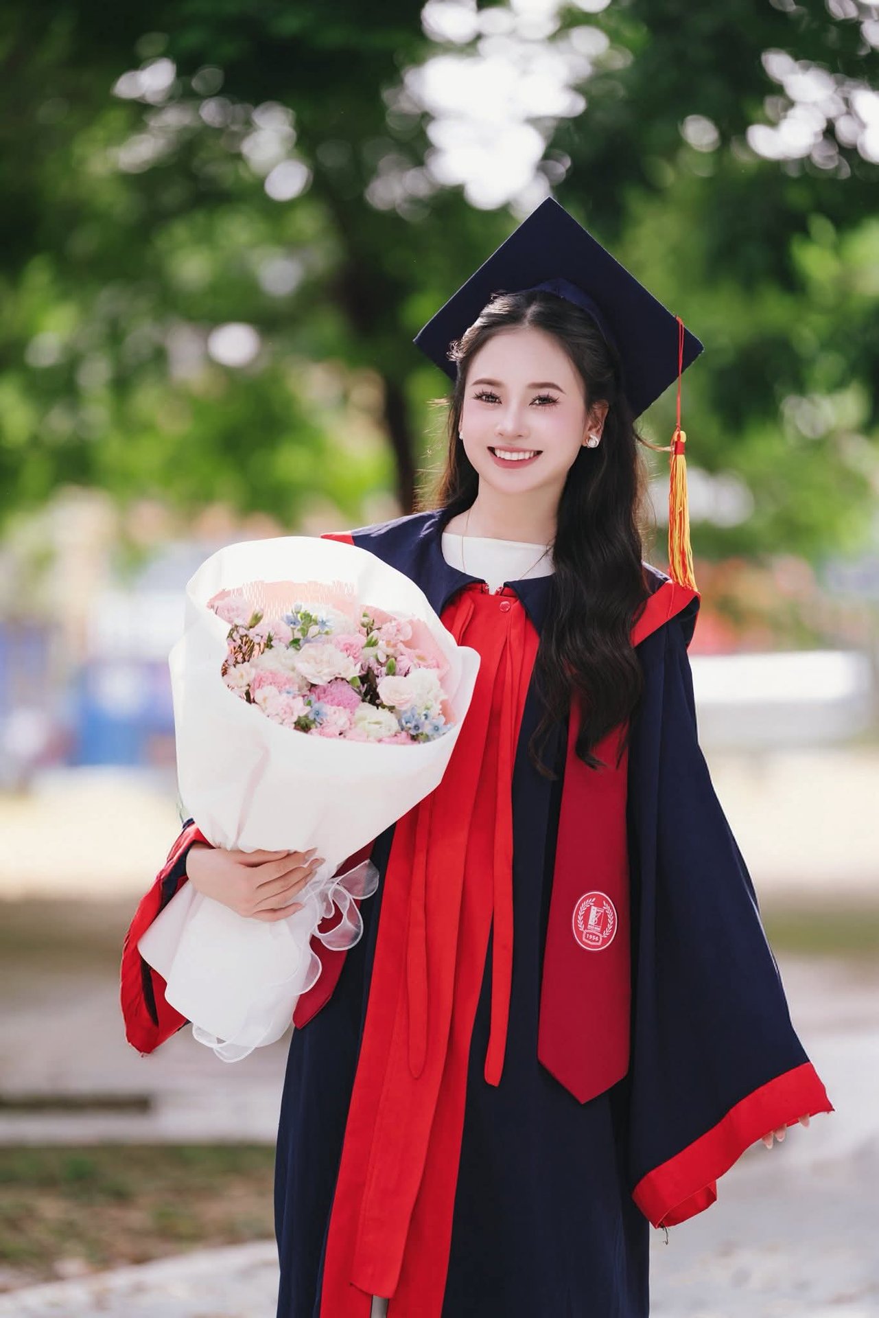 This photo captures a proud moment of a female student on her graduation day. Dressed in a dignified graduation gown and a cap symbolizing knowledge the young woman radiates beauty and immense joy. Her bright smile along with the vibrant pink rose bouquet beside her further highlights the happiness of completing her academic journey at Can Tho University. This is not only a significant milestone marking the end of one chapter but also the beginning of a wide-open future promising many new successes. This moment stands as a testament to the continuous effort and thirst for knowledge of the young generation.